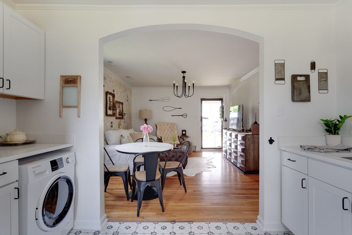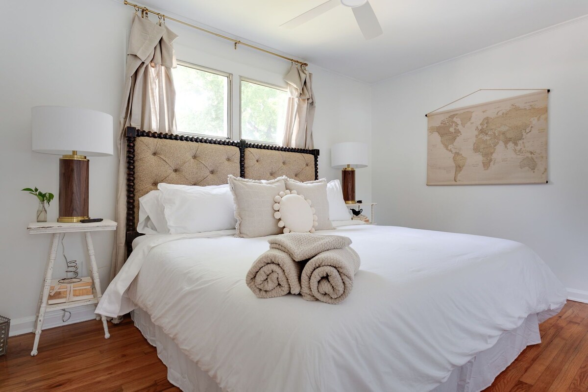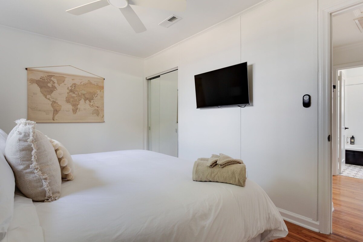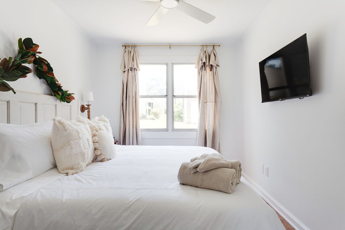The Cottage Charmer is centrally located & walkable to restaurants, bars & more in Five points! Pet friendly and spacious, this condo is fully updated & quite charming! You will love the open concept living, w/2 large king bedrooms, TVs, ceiling fans & mirrored closets! Enjoy a fully stocked kitchen and tons of outdoor space! The neighborhood is charming, safe and close to NC State, Downtown, Glenwood south, RDU and more! Perfect for gathering, & relaxing! You will love the Cottage Charmer! The cottage charmer has a wonderful is situated in a walkable charming neighborhood, five points which is the perfect location to everything in Raleigh! And you will love the open layout in the end unit condo which is bright and cozy with the living room and kitchen all open for comfort! The two bedrooms are large with king beds, and mirrored closet doors with smart TVs ceiling fans and high speed wifi! And the renovated bathroom right in between the bedrooms! The kitchen is fully stocked. You will not need a thing and enjoy your front porch for relaxing or even the back area which is wonderful to enjoy together and relax! This unit is bright and airy and is super walkable to tons of restaurants and bars right next-door!!!! Walk to several restaurants down the street including Mami Nora’s , the best Peruvian food around, Chido Taco, High Park Bar and Grill, House of Hops, Shuckin Shack Oyster Bar, and the best coffee shop and more! Grab a quick 5 minute Uber ride to downtown, Glenwood South, and Village District/NC State U! Parking is a breeze with free street parking located in front of the condo. Bring your fur babies, as we are pet friendly! You can’t want any more than this wonderful condo for your stay in Raleigh!!!We are so excited to have you! Our prices include all fees. No hidden fees.