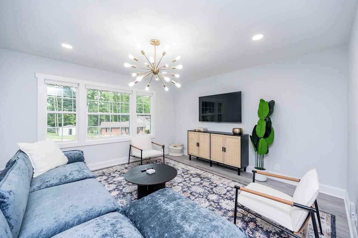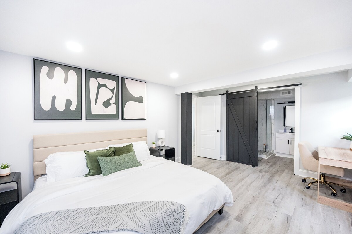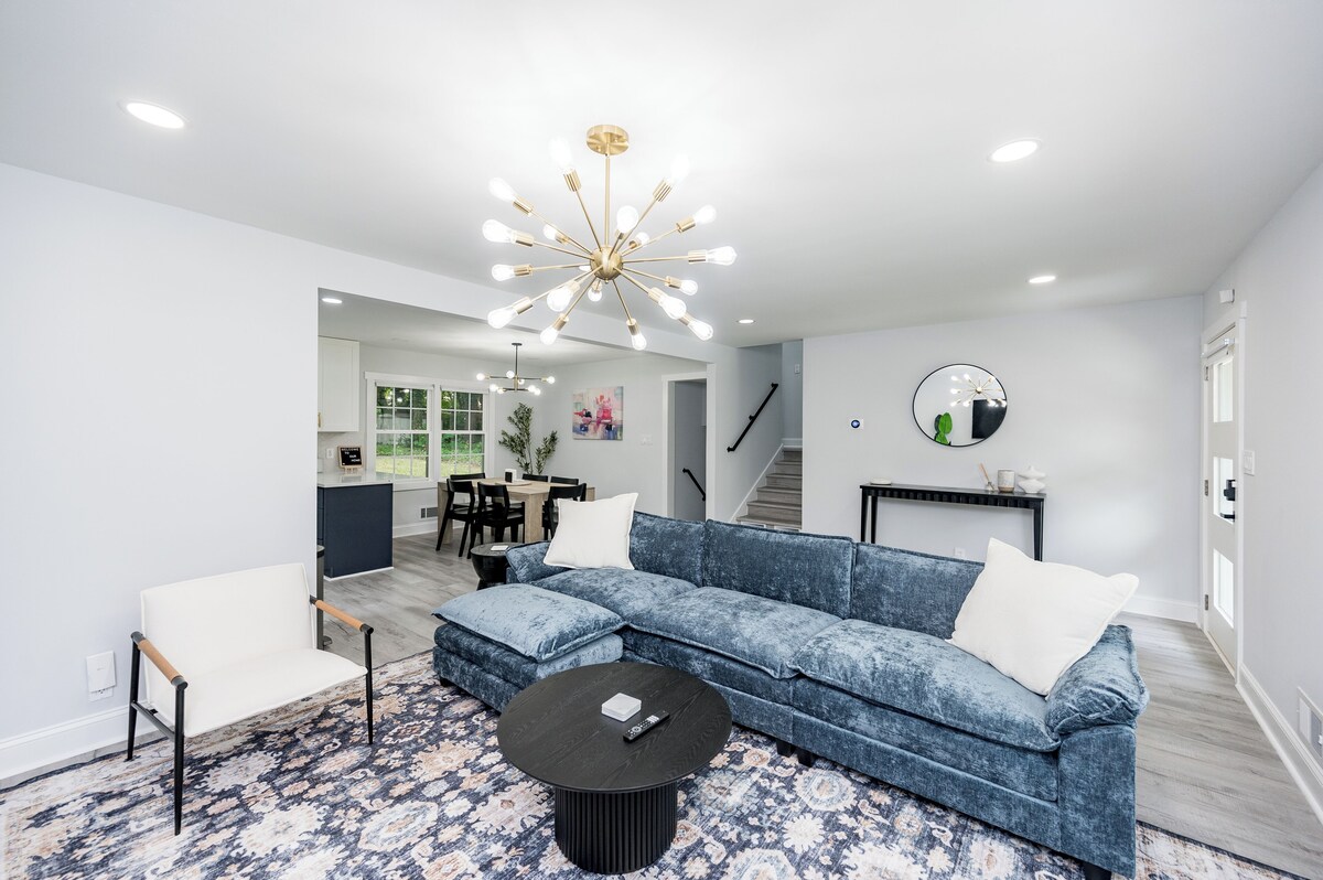 Located in a prime North Raleigh area, our newly renovated & modern home offers a unique experience. Just minutes from North Hills & downtown Raleigh, you'll find shopping, dining, & entertainment close by. Our home is also conveniently located near North Carolina's top universities & hospitals. With chic interiors, spacious rooms, & a private backyard (perfect for pets!), our home welcomes families, friend groups, and business travelers alike. Discover & explore all that Raleigh has to offer! The space • 5 Bedrooms, 3 Baths, 6 total beds (2 king beds) • Dogs are welcome! • 2 TVs • High-speed WiFi • Keyless entry • Fully equipped state of the art kitchen • Complimentary coffee • Dedicated work space • Washer, Dryer & drying rack available • Board games • Steps away from Brentwood Park! Bring family & friends to share this newly renovated, modern, chic & spacious home. Comfortably sleeps 10 guests with 5 bedrooms & 3 bathrooms. The kitchen comes fully equipped with state-of-the-art appliances including cooking essentials such as an air fryer, toaster, microwave, brand new oven, stove & more. This makes it the perfect space for cooking & enjoying a meal with loved ones at our spacious dining table. Complimentary coffee & a coffee machine are provided, so you can wake up & enjoy a cup before heading out to start your day. In the living room area, feel free to get cozy with throw blankets & enjoy your favorite shows & movies on our smart TV. If you're in the mood for game night, please feel free to find a few of our favorites stocked in the media console below the TV. Our spacious backyard is fenced in, making it perfect to run around with young kids or your dog! Steps away from our home, Brentwood Park is a 19-acre green space park offering a variety of amenities for residents and visitors alike. Amenities include a playground, sports fields, picnic area and walking trails. It is a great place to relax, exercise and enjoy the outdoors! Primary Bedroom #1 (Downstairs) • King bed • Large mounted smart TV • Indoor electric fireplace • Dedicated work space for guests who need to work remotely • Walk-in newly renovated shower • Spacious walk-in closet Bedroom #2 (Upstairs) • King bed • Ceiling fan • Spacious closet Bedroom #3 (Upstairs) • Queen bed • Reading nook • Ceiling fan • Spacious closet Bedroom #4 (Downstairs) • Double bed • Spacious closet Bedroom #5 (Upstairs) • 2 single beds • Spacious closet Don’t leave your fury friends at home! We welcome you to bring your dogs but please add any pet requests to your reservation. We work around the clock to ensure that our guests can feel safe staying in our home. Using CDC guidelines, surfaces are cleaned before each guest's arrival with a disinfectant cleaner that kills 99.99% of germs. Unlike standard hotel practices, we strip quilt coverlets and bedspreads and launder them between guests. There is a one-time, non-refundable $250 cleaning fee. Please be advised that the City of Raleigh is very strict with ordinances regarding short-term rentals. There are no special events, gatherings or parties allowed on the premises. No sound systems are allowed to be brought onto the property by guests. The occupancy is limited to 10 overnight guests and 3 cars are allowed on the property. Please keep these in mind when booking the house - thanks! During your stay, you'll also have access to us full-time. We'll contact you the day before your arrival to help you arrange for any special needs so you can have the best experience possible! *MAX 3 CARS FOR ON-SITE PARKING* *Smoking, vaping, e‑cigarettes NOT allowed* Let us know if you have any questions and we look forward to hosting you! Guest access Guest will have private access to the entire house. There's keyless entry for easy access and check in. Please, make yourself at home. Other things to note Please remember that you're staying in a house, not a hotel. Please treat the space with respect. If any problems arise, we will do our best to take action and assist, ASAP. Our prices include all fees. No hidden fees.