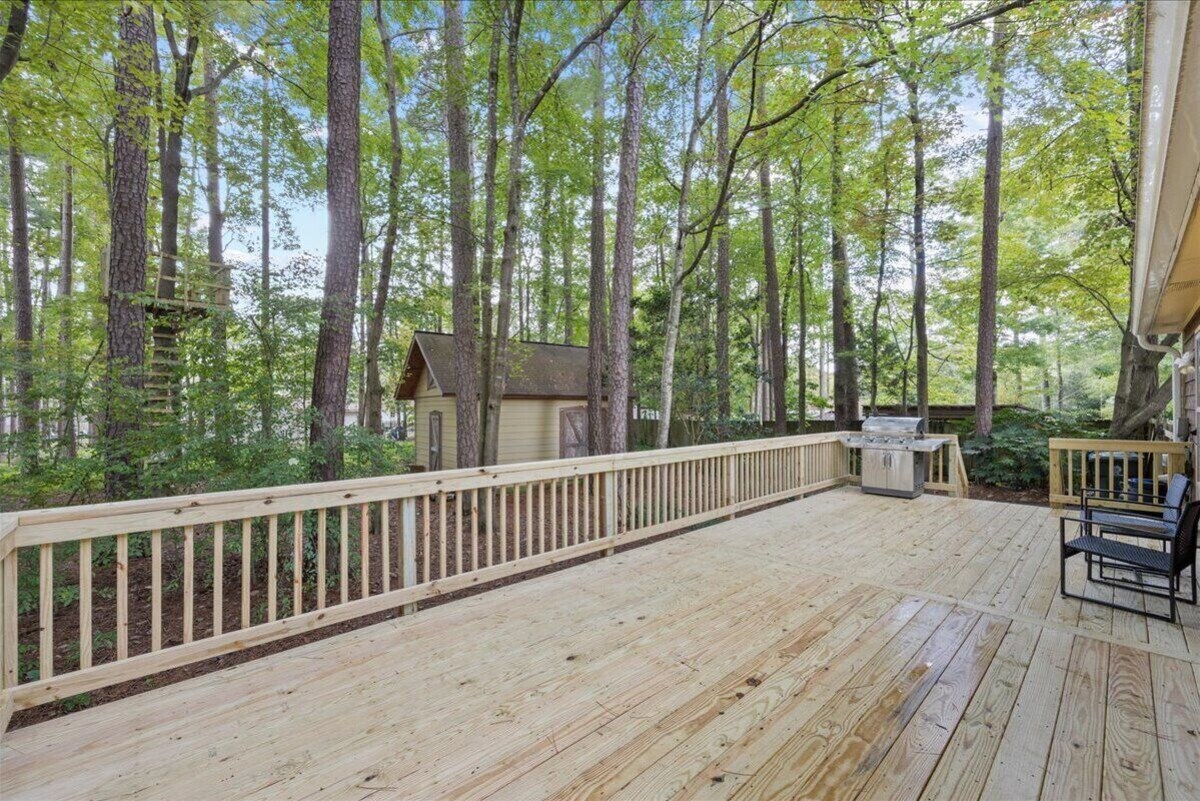 About this space Welcome to our Cozy Sawmill Cottage in the heart of North Raleigh ! It's a 10 minute walk to Greystone Village with cafes, restaurants and shopping. We offer 1 king and 2 queen beds, 55” Smart TV, a private backyard with a large deck and grill, coffee bar, and more. .☛ 6 miles from Duke, UNC and WakeMed Hospitals! .☛ 9 miles to NC State University! .☛ 18-minute drive to RDU Airport! Book with us and experience the best of Raleigh! KEY FEATURES: ☀ Open floor plan on a quiet Cul De Sac ☀ Updated en suite and large walk in closet ☀ 3 comfortable bedrooms; 1 kings, 2 queen ☀ Fully stocked kitchen updated appliances ☀ Cozy living room w/ 55-inch smart TV, L-couch, board games, and puzzles ☀ Coffee bar with all the fixins ☀ Snacks and water ☀ High-speed Wifi ☀ Fully stocked bathrooms ☀ Front porch with chairs and table ☀ Washer + Dryer ☀ Iron and Ironing Board ☀ Located near downtown Raleigh ☀ Park-Like backyard with huge deck and grill ☀ Free parking with private driveway ☀ 6 port Charging Station in every room ☀ Pet friendly ☀ Air Purifier ☆☆ BEDROOMS & BATHROOMS ☆☆ There are three stylish bedrooms, one king-size bed and two with comfortable queen beds. Two spacious bathrooms, en suite is renovated and has a beautiful walk in tile shower, tall vanity. Shampoo, conditioner, body wash, hand soap, blow dryer, extra toilet paper and trash bags are all provided. ☆☆ KITCHEN & DINING ☆☆ The home features an open kitchen with a large refrigerator, deep stainless steel sink, glass electric stove top, oven and microwave. The dining area offers a buffet counter for serving or mixing cocktails and has plenty of room to comfortably host family dinners. We provide everything you'll need to cook and clean up after a delicious family meal including cookware, dishes, utensils, dishwasher pods, cutting boards, cookie sheets, and more. The dining table can comfortably seat four people with two more at the kitchen counter. ☆☆ LIVING ROOM with Smart TV ☆☆ Large open living area is equipped with a 55-inch smart TV to stream all your favorite shows, as well as a comfortable leather sectional and cozy reading chair, a collection of board games, and magazines! ☆☆ OUTSIDE SPACE ☆☆ While there are plenty of outdoor activities nearby, the house also provides its own outdoor space for guests to enjoy. There are plenty of seating areas for guests to sip morning coffee or enjoy a glass of wine as the sun goes down. There's a front porch with table and chairs and a large deck overlooking the wooded backyard! Need storage? We’ve got that covered too. There is a large shed in the backyard if you need to store bikes, or extra items for longer stays. ☆☆ Other Things to Note ☆☆ -The ice maker in the fridge does NOT work so we have provided (4) ice trays. -The kitchen and living room lights are a little funky so we’ve labeled them. -The porch light is on a night time motion sensor. -To access the hose faucet in the backyard pull up on the trap door in the deck. -Our home is situated on a spacious wooded lot. While we take pride in keeping the property clean and well-maintained, please be aware that occasional encounters with nature—like spotting a bug or two—are possible. This is a normal part of life in a wooded area, and we appreciate your understanding! ☆☆ Safety ☆☆ Your safety matters. So we have outfitted the property with smoke and carbon monoxide detectors as well as fire extinguisher and first aid kit. You will have private access to the entire home for the duration of your stay, including the outdoor spaces. The only exception is the tree-house in the backyard and wood burning fireplace are both off limits. Sorry! We comply with and exceed all COVID-19 VRBO sanitizing regulations and take extra measures to sanitize ALL bedding (including pillows) with enhanced steam sanitation between each guest. We have other similar properties in Raleigh and Durham so if your travels ever take you to surrounding areas, please reach out. We would love to host you at any of our properties! Discover nearby attractions within reach including: Walk or Drive (under 3 miles)… 10 minute WALK (.5 miles) - Greystone Village ☀ Sola Coffee Cafe - Great cafe with yummy coffee, breakfast/lunch, beer/wine. ☀ Kai Sushi & Sake Bar - Never been but good reviews. ☀ Gonza Tacos Y Tequila - Great Mexican food and margaritas. ☀ Imperial Garden Chinese Restaurant - Best Chinese food in Raleigh. 3 minute DRIVE (.9 miles) - Peachtree Market ☀ Vinnie's SteakHouse & Tavern - Pricey but great food, atmosphere and service. ☀ Pho Sure - Vietnamese food. Never been but great reviews. ☀ La Rancherita Mexican Restaurant 5 minute DRIVE (2 miles) - Six Forks Station Shopping Center ☀ Milton's Pizza & Pasta - Casual, family owned with great food and salad bar. ☀ Rudino's Rooftop - Great pizza, garlic knots & sandwiches (on homemade bread). ☀ Sassool - Yummy Mediterranean food. ☀ Poppyseed Market - Colorful bistro with sandwiches, salads & wine bar. 7 minute DRIVE (2.5 miles) ☀ Creedmoor Cafe - Family owned breakfast/lunch, homemade soups. ☀ ChowChow Pizza Bar - Indoor/outdoor seating. Love the brussel sprouts! Grocery Stores ☀ Food Lion - Lead Mine Road (1 minute drive, .5 miles) ☀ Lowes Foods - Strickland Road (6 minute drive, 2 miles) ☀ Harris Teeter - Creedmore (6 minute drive, 1.7 miles) ☀ ALDI - Creedmore (7 minute drive, 2.3 miles) Universities & Colleges - Meredith College: 8 miles - North Carolina State University (NC State): 10 miles - Duke University: 25 miles - Wake Technical Community College: 15 miles - University of North Carolina at Chapel Hill (UNC): 26 miles Hospitals - Duke Hospital: 5.9 miles - Wake Med Raleigh: 5.8 miles - UNC Rex Hospital: 6.6 miles Local Recommendations Raleigh offers many fantastic museums (NC history, Science, Art), historical locations (ie. old NC state capital) as well as quain
