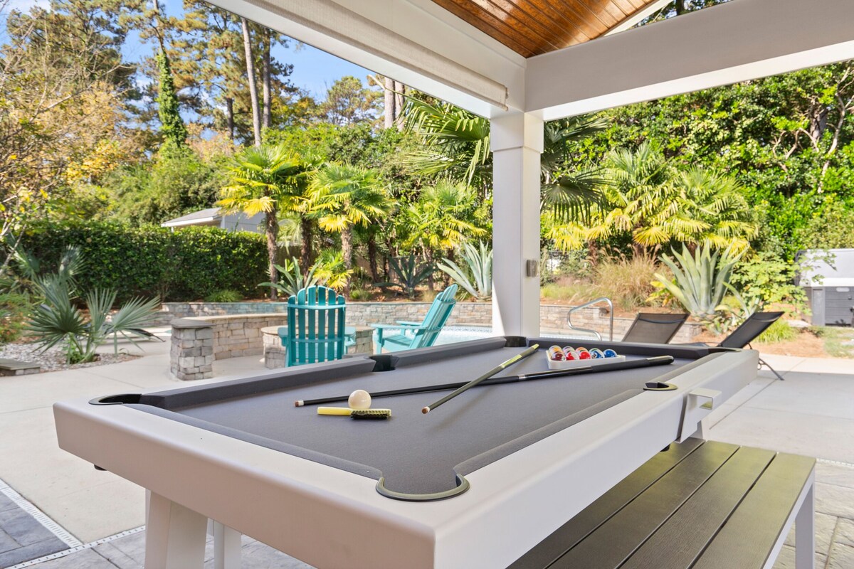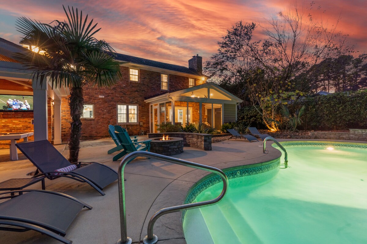 The Location: This home in located in North Hills, just five miles north of downtown Raleigh and has become one of North Carolina's most upscale locations. It's truly one of the BEST destinations in Raleigh for boutique shopping, restaurants, cafes, bars, wellness, studios, entertainment, and events. Approximate miles from prominent areas in the triangle: Downtown Raleigh: 4 miles RDU Airport: 13 miles Research Triangle Park: 17 miles Durham: 23 Miles Chapel Hill: 29 miles The Property: This home was newly updated with modern amenities and designed by professionally decorated by SAS designs. Sleeping: we recommend no more than 10 adults for comfortability based on # of beds. 12 guests can work but we would only recommend it if the combination includes children and adults. Review bedrooms below. *Bedroom 1: King Bed w/ fresh white linens + smart tv *Bedroom 2: King Bed w/ fresh white linens + smart tv *Bedroom 3: Queen Bed w/fresh white linens + smart tv *Bedroom 4: two twin beds with 2 twin trundles, fresh white linens + smart tv. *Additional Sleeping: 2 portable twin trifold mats. perfect for adults or children. very comfortable! Main Floor Living: *Living room and office/library w/ large smart tv *Newly updated + fully stocked kitchen w/ gas stove and island + farm sink + dishwasher *Dining Room: Sits 8 people *Eat-in kitchen: Sits 4 *Laundry Room + 1/2 bath *Screened in porch w/ smart tv, large couch and chairs *Video game room w/ TV connected to Mario switch, Mortal Combat arcade, NFL football arcade, and Golden Tee arcade *Unlimited music on amazon alexa speaker Outdoor Space: *Outdoor dining for 12 *Outdoor Smart TV *Outdoor Pool table/Ping pond *Saltwater pool open year-round (not heated) *Hot Tub *Wood Firepit (wood provided) *Seating and sun loungers *Covered outdoor kitchen w/ gas stove and fridge *Outdoor lighting *Fully fenced yard + 1/4 grass lawn *Large Driveway (parking for 5 cars including in front of the home) *Bikes Items Provided: Linens: White and professionally cleaned Soaps: shampoo, conditioner, bodywash, hand soap) Toiletries (2 rolls of TP per bathroom and 1 roll of paper towels Towels (Bath and Pool) Coffee: Drip Pot, and Keurig w/ a start kit of coffee & sugar Trash bags: 2 Dishwasher pods: 2 Washing Machine pods: 2 Our prices include all fees. No hidden fees.