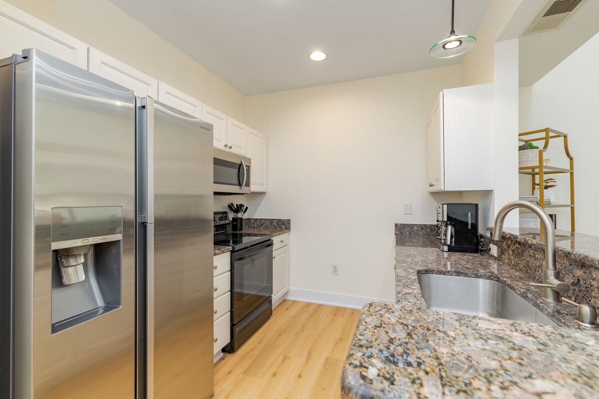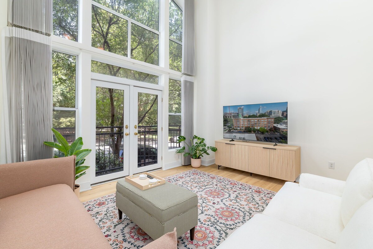 Welcome to your modern downtown Raleigh retreat! This stylish 2-story condo features a king bed, 1.5 baths, a full kitchen, a 65” Smart TV, in-unit laundry, and huge windows with park views. The downstairs couch is a pull-out queen bed for additional sleeping space, so the condo can comfortably sleep 4. Walk to restaurants, museums, and bars. Includes 1 private parking spot. Ideal for business travelers or couples looking for comfort and convenience in the heart of the city. The Property Welcome to your stylish 2-story retreat in the heart of downtown Raleigh! This modern 1-bedroom, 1.5-bath condo offers a bright, open layout with everything you need for a relaxing and convenient stay. Enter through the main door at the back of the building (next to the parking lot) and step into a welcoming lobby—your unit is just past the elevator, second door on the right. Inside, the main level features tall ceilings and large windows that fill the space with natural light and offer peaceful views of the park. The living area includes two comfy couches (one of which is a pull-out queen bed, so the condo can comfortably sleep 4), a 65” Smart TV, and a cozy dining nook with seating for two. The fully equipped kitchen is stocked with full-size appliances, cookware, and essentials—perfect for preparing meals or reheating takeout. Down the hall, you’ll find a convenient half bathroom, a laundry room with full-size washer and dryer, and a locked cleaner’s closet. Upstairs, the loft-style bedroom offers a plush king-size bed, two dressers for storage, and an open-top wall that lets in natural light from below. The full bathroom includes a tub/shower combo, vanity with sink, and a toilet. A locked owner’s closet is also located upstairs. This home comes with a designated parking spot (pass provided), free WiFi, central heat and air, and fresh linens and towels. Located in a secure, elevator-access building, you’re just steps from Raleigh’s best restaurants, coffee shops, parks, and nightlife. Whether you’re visiting for work or play, this downtown gem offers comfort, style, and unbeatable convenience. Book now! Guest Access Guest has access to whole house minus the cleaner closet. Other Details ★☆ We provide a starter set of supplies including dish soap, paper towels, laundry detergent, dishwasher detergent, garbage bags and dish soap. Basically enough to last a few days. ★☆ If there are any issues with this space, please let us know upon arrival, otherwise we will consider it in great condition. ★☆ We love hosting guests with dogs! To ensure a comfortable experience for everyone, please follow these guidelines: - Keep dogs on a leash when outside at all times. - No dogs on the furniture, including beds and couches. - We allow up to two dogs weighing 50 pounds or less with a non refundable $100.00 fee. Thank you for your understanding and cooperation! ★ CLEANING & SANITIZATION ★ Health, safety, and well-being of our guests are of utmost importance. For this reason, we use a thorough cleaning process after each check-out. Feel free to contact us with any additional questions you might have. Our prices include all fees. No hidden fees.