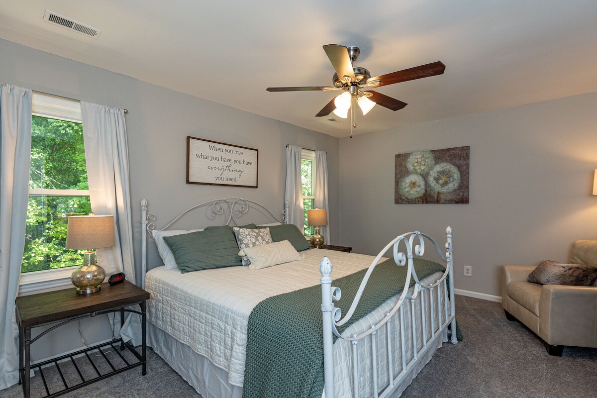 The 2nd bedroom offers a full size bed with ensuite, and the 3rd bedroom offers a full size bed with half bath.