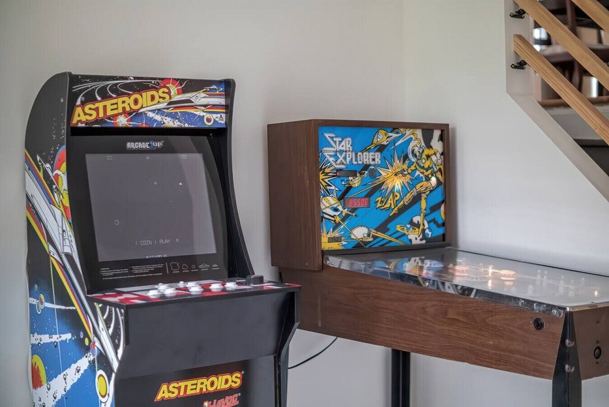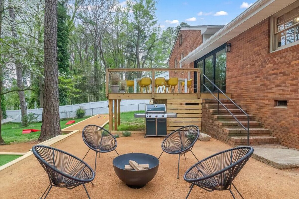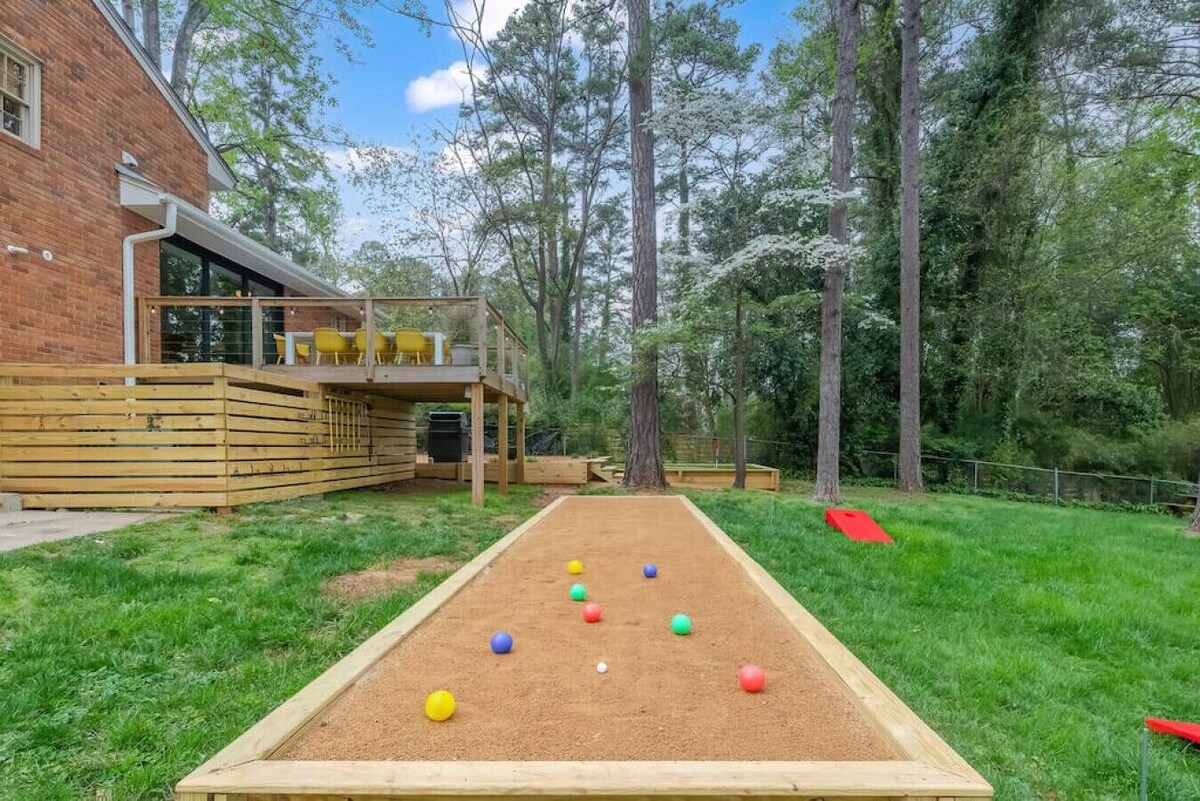 Welcome to our Luxurious home professionally designed to make this modern, eclectic stay your dream house! This home is truly an entertainment packed, beautiful oasis in the middle of everything Raleigh has to offer. Whether its the arcade, pinball machine, movie room, outdoor bocci ball court, fire pit, mini-golf, darts, corn-hole... this property has something fun for everyone! Step inside your new luxurious 4 bed, 2 bath house in Raleigh and discover a world of entertainment that awaits you. The interior of the house features an antique pinball machine, an arcade, and a movie room complete with an 85-inch TV. So, whether you're a family of gamers or movie buffs, you're sure to have an unforgettable time. But the fun doesn't stop there! The outdoor space of the property is a true oasis inspired by the Raleigh Arboretum. The beautifully landscaped backyard features a luxurious fire pit, mini-golf, bocci ball court, corn hole, horseshoe, croquet, and more. And when you're ready to wind down, relax on the large deck overlooking this incredible space. Located in the heart of Raleigh, this property is close to everything the city has to offer. From the best dining and shopping to the most exciting entertainment options, you'll have easy access to it all. So, whether you're looking for a relaxing retreat or an exciting adventure, this property has it all. Don't miss your chance to experience the perfect combination of luxury, comfort, and entertainment that this property offers! Entry by smart lock code Located in established Brentwood community conveniently located right in the middle of Downtown Raleigh, North Raleigh, and Wake Forest. House Rules: If you do decide to stay at our lovely home, we do charge the following fees separately after you book: 1) Refundable Security Deposit - $500. We recommend paying this with a credit card since it will only be a hold placed on your card during your reservation. If you pay with a debit card or direct ACH transfer, the money will be withdrawn from your account 3 days before check-in and refunded 3 days afterwards upon successful inspection of the premises. 2) Dogs - $100/dog per reservation. We allow up to three dogs per reservation to be paid after booking. Please note this is not reflected in your reservation price and is an additional charge. 3) We also require all of our guests to upload a photo ID to their pre-check-in portal to confirm their identity before we will give access to the property. You will also be asked to sign our rental agreement through the pre-check-in link after booking. You will not receive your entry code until this is signed and all pre-check-in steps completed. If you use any of the outdoor games, please rehang them in their proper place on the game wall before you leave. Note, the electric blower is for your use to clear off the courts. If you are bringing any dogs, they must be listed on your booking and you are responsible for any dropping left in the yard. We do provide doggie bags that you may use and discard in the outside trash bin on the side of the house. DO NOT PLACE INSIDE THE HOUSE PLEASE. Early arrival or late departure is on a case by case basis, depending on the cleaners schedule. You can book this and additional add-on services through the pre-checkin link provided after booking. Absolutely NO loud music, excessive noise, offensive behavior, illegal firearms or weapons, illegal substances including narcotics, drug paraphernalia, fireworks, sparklers, or incendiary devices, and illegal activities. Please note that this is a quiet and peaceful residential neighborhood. Kindly keep any music at a reasonable level and be respectful of our neighbors who are there to enjoy the tranquility of the surrounding nature. Any reports of excess noise could result in guests being asked to leave. Security cameras are installed (legally) over the driveway and entry; apart from security they help us keep an eye on the weather. For insurance purposes, it's important that the number of guests match the booking. Overnight guests not listed at the time of booking are strictly prohibited by VRBO. If at any time you are expecting additional guests, please let us know prior. You are also responsible for any visitors that enter the property. While this is a family friendly home, it is not child proof. If you have any children with you during your stay, please mind them at all times. Please respect the home as if it were your own and leave it as you find it. For makeup removal, please USE BLACK towels provided. Report any issues, damages and breakages immediately. Smoking of any kind (includes vaping) is strictly prohibited in the home; if smoking outside, please pick up and dispose of all remnants. Gas grill is for your use - please make sure the gas is turned off and the grill cleaned before you leave. Please only use candles in case of a power outage, and make sure they're attended. Finally, please pay extra special attention to the pinball machine as it is very old and not for rough use. Consequences relating to non-compliance of Codes of Conduct or House Rules include, but are not limited to extra charges, early termination, immediate eviction and further recovery action relating to any damage, loss or theft. Any breach may result in immediate termination of the rental agreement and a report lodged with the local authorities. Thank you for your cooperation. we sincerely appreciate it. Our prices include all fees. No hidden fees.
