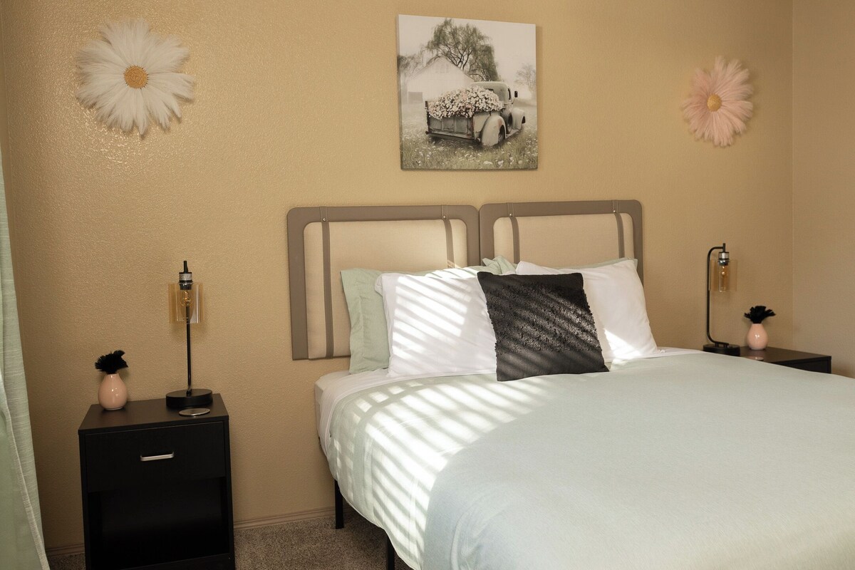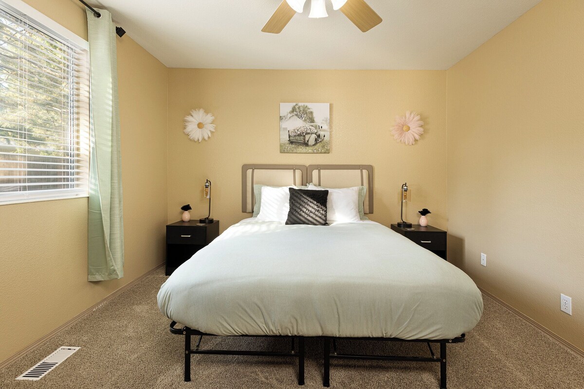 Escape to this stylishly appointed 3-bedroom, 2-bathroom flat nestled just across from beautiful Veterans Park. Amazingly close to all the amazing adventures the area offers, such as Bogus Basin Ski Resort, Boise State University, the whitewater park, and more. Find your place in the mountains, enjoy the night scene in Downtown Boise, or relax in this cozy space enjoying your favorite show. **Living Space:** Access Unwind in the inviting living area, which features plush furnishings and an indoor fireplace for cozy evenings. The fully equipped kitchen offers all the essentials for preparing home-cooked meals, while the covered parking adds convenience to your stay. **Bedrooms & Bathrooms:** Three well-appointed bedrooms provide comfortable sleeping arrangements for your family, and both bathrooms are stocked with complimentary toiletries for your convenience. **Outdoor Area:** Step outside to the shared backyard, where you can relax and enjoy the fresh air. The proximity to Veterans Park, the Boise River, and the 20-mile greenbelt allows for leisurely strolls in nature. **Location:** This flat is conveniently situated just minutes from downtown Boise and provides easy access to the city's vibrant attractions and dining options. Additionally, outdoor enthusiasts will appreciate the short 17-minute drive to Bogus Basin Ski Resort for a day of mountain adventures. **Guest Access:** During your stay, you'll have access to free parking, in-unit laundry facilities, and the entire flat. Our dedicated property management team can also assist with any questions or needs. **Check-in & Check-out:** Check-in is at 4:00 PM, while check-out is at 11:00 AM for a seamless experience. This property offers the perfect blend of comfort and convenience, ideal for your next family, couples, or work getaway. Our prices include all fees. No hidden fees.