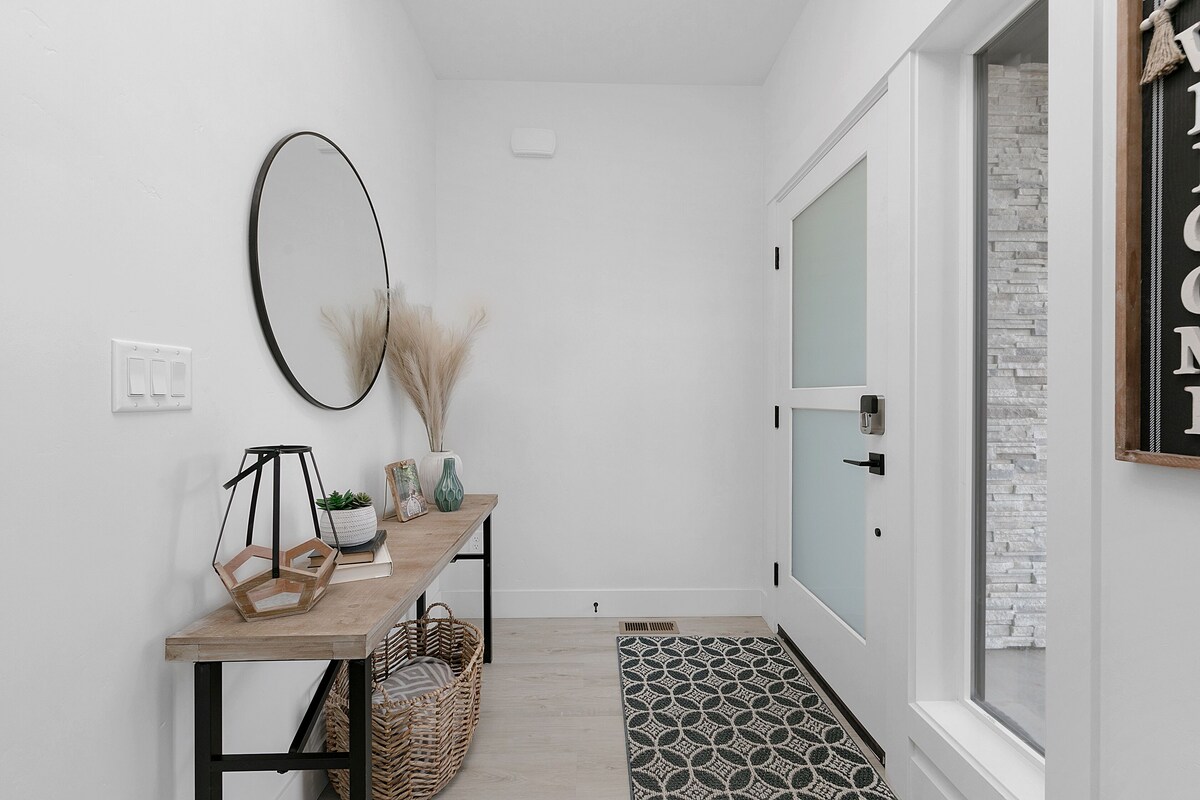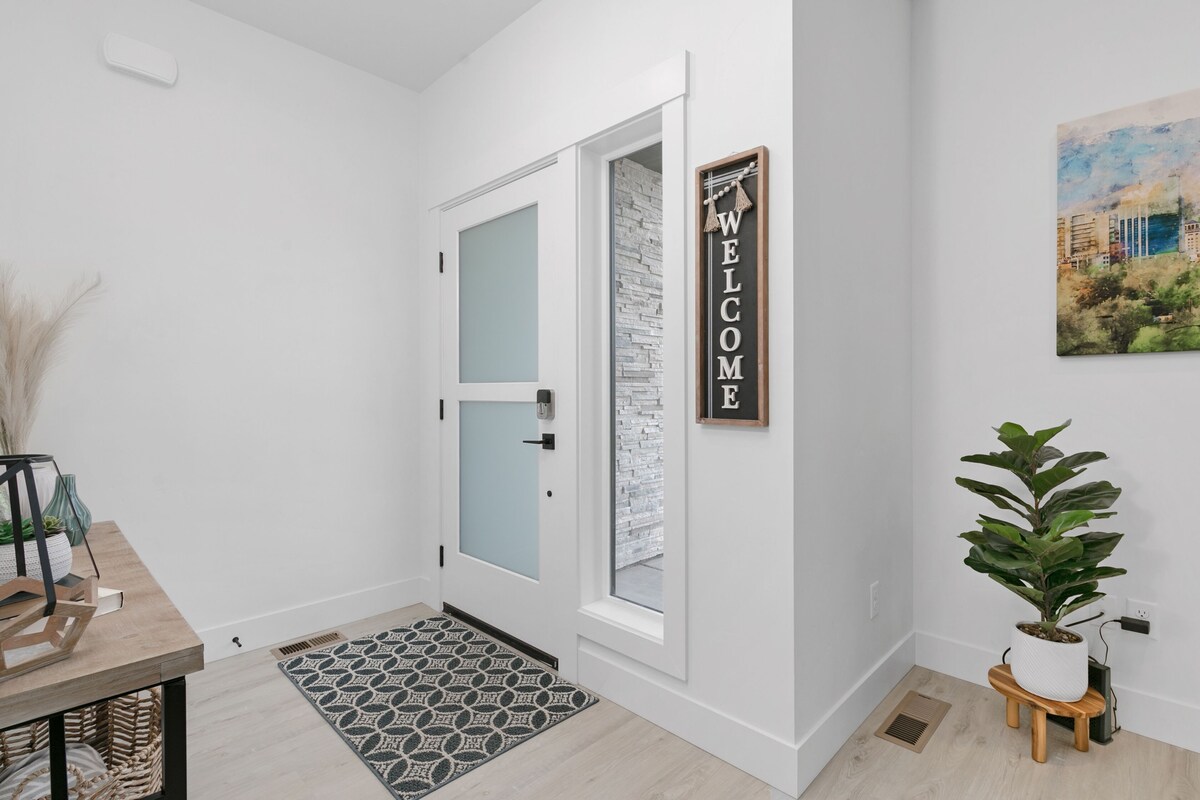 Enjoy your stay at this modern, spacious, four-bedroom, 2.5-bathroom townhome in beautiful Boise, Idaho! Located in a quiet and friendly neighborhood, just minutes away from downtown Boise and its many attractions. This townhome is perfect for families or groups of friends looking for a comfortable and stylish place to stay while exploring everything this city offers. Inside, you'll find a bright, airy living space with contemporary decor and plenty of natural light. The fully equipped kitchen is perfect for preparing meals at home, and the adjacent dining area has ample seating for all guests. After a long day of sightseeing, relax in the comfortable living room with a large flat-screen TV and cozy seating. The main bedroom features a comfortable king-sized bed, an en-suite bathroom, a luxurious soaking tub, and a large walk-in closet. The other three bedrooms are upstairs. Two bedrooms offer comfortable queen-sized beds and plenty of closet space for your belongings, and the third bedroom has a bunk bed with a twin and full mattress, perfect for kids! In addition to the master en-suite, the townhome has another full bathroom upstairs and a half bathroom on the main level, making it easy for everyone to get ready in the morning. Other amenities include high-speed internet, a washer and dryer, central air conditioning, and a large, covered patio overlooking the Boise Foothills. The townhome also has a 2-car garage, and additional street parking is available in front of the home. The garage is also equipped with a Tesla charging station Our prices include all fees. No hidden fees.
