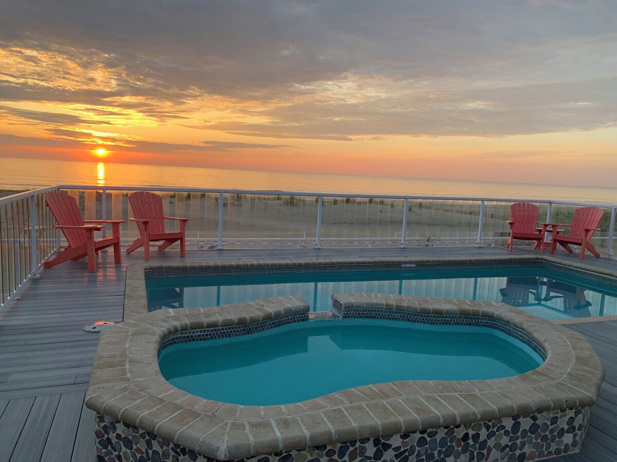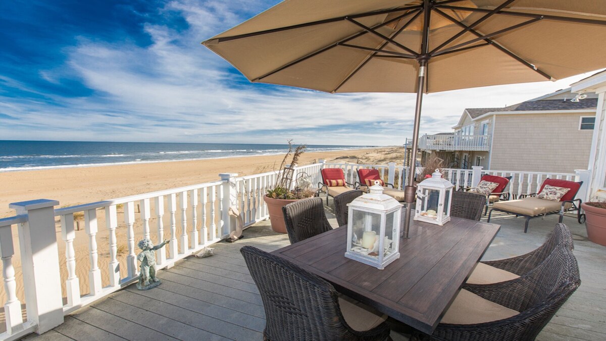 The Seaside Sanctuary is beautifully nested along the coast of Atlantic ocean in beautiful Sandbridge Beach. If you are looking for an unforgettable, relaxing vacation, Then you have found it! This is a perfect sized home with three levels of grandeur, with amazing ocean views throughout and gorgeous furnishings. For any questions, please contact us at 757-754-6161. We have Seasonal Policy for the year- For peak season - summer time booking is Restrict however, our guests could always change the week to an available week that is suitable for them. We will always work with our guest making sure they don't loose their booking, Also If your family is larger 10 persons and you wish to bring along extended family& friends - PLEASE CHECK the newly added extension of the house (lower level with its own direct access - Total of 7 bedrooms with 6.5 bathrooms and two FULL kitchen property listing, SEASIDE Serenity. https://www.vrbo.com/4025665 The architecture of this 5 bedroom home is fabulous and very unique to our coastal community. All of the bedrooms are spacious, with high ceilings in the living areas, enhancing the open feeling of the villa. The grand entrance and covered porch invites you inside where you are instantly greeted by the ocean view. Floor to ceiling windows and a strategically angled floor plan make the most of capturing view of Atlantic ocean and our incredible beach. The main level of Seaside Sanctuary is elegantly decorated with creamy couches and designer appointments, and is bright and cheerful with all of the arched east facing windows. Relax in front of the gas fireplace in the evening, while watching your favorite TV show on the flat screen. The open floor plan allows for a casual ability to join together or spread-out, as the living room opens to the dining room and then the kitchen. The kitchen is well stocked with everything you need, with granite kitchen counter tops, smooth cook-top, built-in double oven, dishwasher, microwave, free standing ice maker, full refrigerator, and wine refrigerator. The dining table seats everyone, and the additional counter top seats 4. Enjoy conversations and an incredible view off the deck, spend hours watching the surf and the water games of the popular dolphins and pelicans that frequently pass by. The First level of this home offers a King Master Suite with a private bath and TV, along with a King Bedroom and Queen Bedroom that share a Jack-N-Jill bath. All of the bedrooms offer designer bedding and window treatments with beachy accents throughout. The upper level is home to two bedrooms; one a King Master Suite with Private Bath and Jacuzzi Tub, as well as a gas fireplace and a private balcony. The second Queen bedroom has a private bath as well. The arched windows offer remarkable views to wake up to. There is plenty of seating outside on the deck, with a table and umbrella for al fresco dining, and loungers for afternoon siestas after a day splashing in the beautiful blue Atlantic Ocean. Beach access is directly from the back of the house, which also offers an open shady place great for younger children to hide from the sun and the elderly to cool off in. A great house for a family bringing the grandparents /children and pet along! We are pet friendly but we do have pet rules. Please check pet rules. CAC, CTVs, wireless internet access, , 1 gas fireplaces (electric grill, jetted tub, wine refrigerator. Fireplace available for off-season use only October-May, Weber Grill/ BBQ., Bed Sizes: Br1 - King, Br2 - King, Br3 - King, Br4 - Queen, Br5 - Queen The Pool is open all year round and maintained as part of the booking . The option to heat the pool (Gaz only - extra fee would be applicable ) is available ( 3 seasons only...). WE have outdoor outlet to be used for Electric Vehicle) . There are applicable fees of $150 per week/per car. Also we offer rental of Low Speed Vehicle 6 person Electric Golf cart (Bintelli) , pictures are posted here. The cost is $150 /day & for the week, we offer $1000 to our guests. The LSV is to be added to the guests car insurance and must have a driver license. Document is to be provided prior to the rental. If you needed the pool to be heated constantly (daily and nightly - 75 degrees max) , kindly it must be requested in advance. the startup is $650 plus gas usage of $75 per day . Our prices include all fees. No hidden fees.