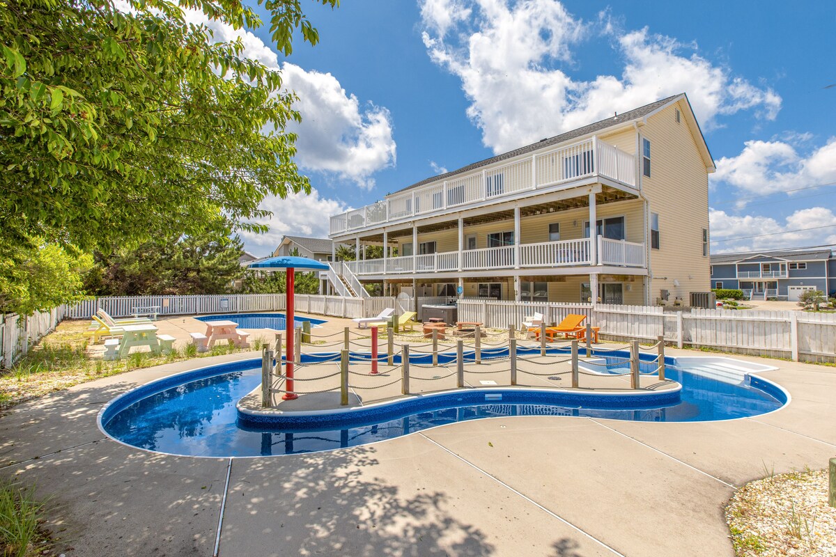 Down By The Sea Our calendar is updated in real-time & our nightly rates are accurately displayed. Simply enter your desired dates and click 'Book Now!' Splash your days away at Down By The Sea, a truly special home by the beach where the entire, fully-fenced backyard is your own personal waterpark! Enjoy a private swimming pool, a lazy river, a splash pad, and a soothing hot tub for hours of at-home fun. Step inside to find three levels of living space that are ideal for several families to share. Up on the third floor, the open kitchen and great room feature natural log tables with matching chairs, benches, and bar stools, creating the perfect spot for a memorable gathering. After dinner, there's a 55-inch TV in the living room and a game room with foosball and air hockey to keep everyone entertained. Spend your days swimming in the pool or soaking up the sun on the surrounding deck, where there's plenty of space to relax poolside, dine al fresco, or play a game of cards. The beach access path is close by as well. Additional amenities include TVs in seven of the nine bedrooms, Blu-ray/DVD players, free WiFi, a gas grill, basketball, tetherball, horseshoes, a children's climbing structure, and a firepit to curl up next to in the evenings. Things to Know Check-in time: 4:00 p.m. Check-out time: 10:00 a.m. All guests shall abide by Vacasa’s good neighbor policy and shall not engage in illegal activity. Quiet hours are from 10:00 p.m. to 8:00 a.m. No smoking is permitted anywhere on the premises. Bring your own basketball. The pool will be open from late April through early/mid-October. This property is managed by Vacasa Virginia LLC. If you are bringing a dog on your trip, the pet fee is already included in your quote when selecting ‘Yes’ to pets. If you would like to add more dogs, please contact us. Parking notes: There is free parking available for 9 vehicles. Please note: this home resides in a noise-sensitive area and the owners participate in our Good Neighbor protection program. Our smart home technology will alert our team if excessive decibel or occupancy levels are detected, allowing us to reach out directly with a reminder of maximum occupancy and quiet hours. This technology is privacy compliant, and only monitors the presence of decibels and devices-not any personal conversation or information. Thank you for supporting our efforts to be good neighbors! Damage waiver: The total cost of your reservation for this Property includes a nightly damage waiver fee, plus tax if applicable (the “Damage Waiver”). (A discount may be applied for stays of 28 nights or longer, if permitted.) The Damage Waiver covers you for up to $3,000 of accidental damage to the Property or its contents (such as furniture, fixtures, and appliances) as long as you report the incident to the host prior to checking out. The Damage Waiver fee eliminates the need for a traditional security deposit. More information can be downloaded from the \ on the checkout page. Due to local laws or HOA requirements, guests must be at least 21 years of age to book. Guests under 21 must be accompanied by a parent or legal guardian for the duration of the reservation. Our prices include all fees. No hidden fees.