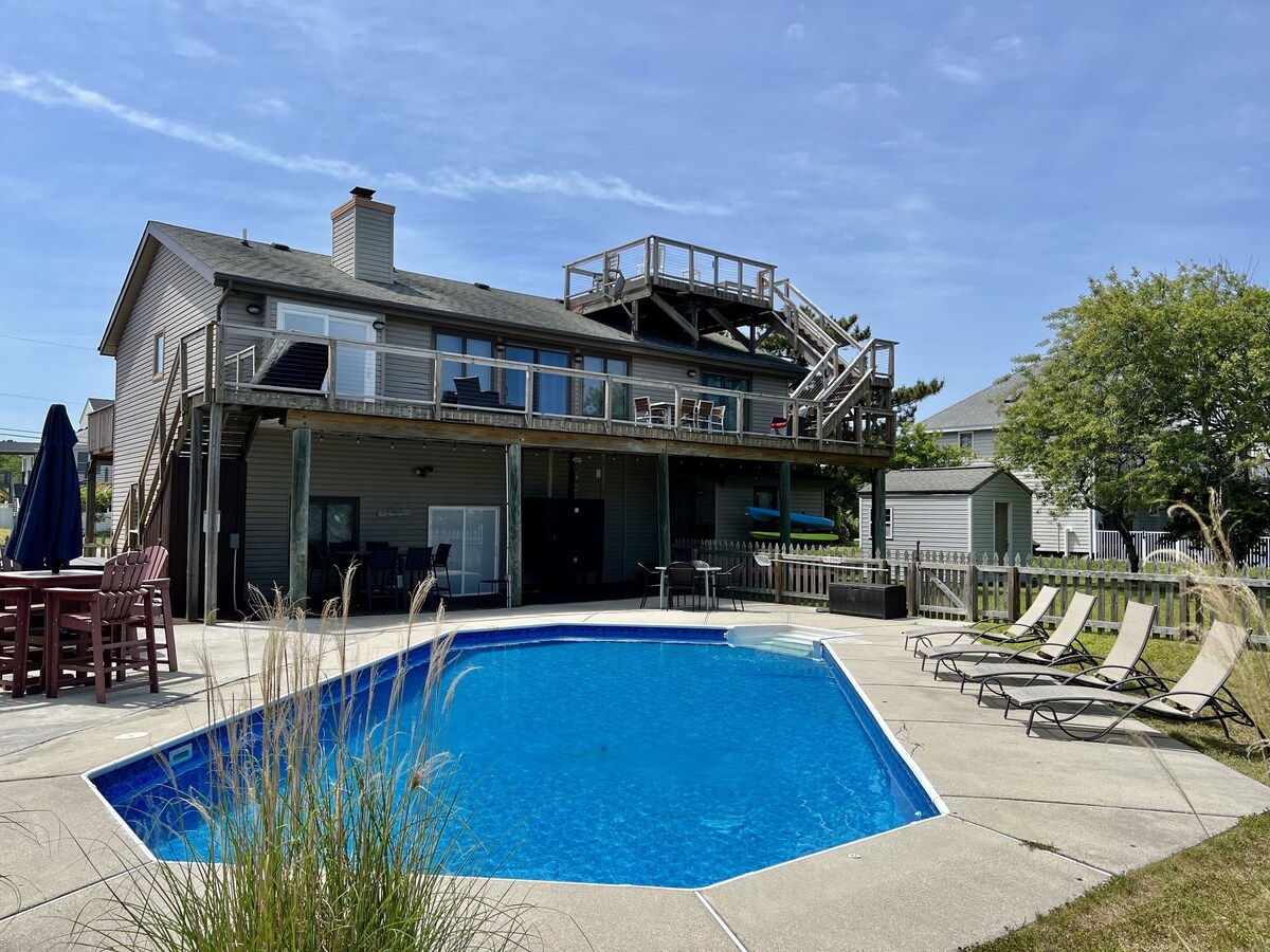 Off season special stay 3 nights get the 4th night free. Message host to book. Holidays not included. THIS PROPERTY IS A FRIDAY TO FRIDAY RENTAL IN SUMMER MONTHS. This is a beautiful home perfect for multiple families wanting to experience the beach and have a pool and hot tub option. This home features a stocked kitchen w/ plenty of space for entertaining. Great Escape is an excellent choice for your family vacation, reunion, or corporate getaway. Great Escape has 7 bedrooms 4 baths w/ a bonus room (futon). This home sleeps 22. New for summer 2024, 3 beach cruisers. We love to host families, wedding groups, girls/guys trips, team building, athletic leagues, and more. It's the perfect vacation home for people who love the beauty of the beach and the convenience of the canal/bay access. It's a treasure that will call you back year after year. Located in the quiet community of Sandbridge, Virginia Beach. This stunning gem has all of the amenities you could wish for in a vacation home and is a short 1 1/2 blocks from the ocean! We have tried to think of everything you will need for your stay. Perfect for boating, kayaking, paddle boarding, fishing or enjoying a cup of coffee or glass of wine while enjoying the beautiful sunrise or sunset. This is one of few properties that do Friday- Friday stays during the summer months (June-August). Finding that checking in on these days allows families to enjoy a full first weekend at the beach. Instead of being stuck in long lines of traffic on check in days (Saturday afternoons are extremely hectic for check in/out, service companies doing cleanings, repairs, lawn maintenance, and pool services) The first floor offers a large recreation room with a pool table and lounge area with cable television. This is the perfect area to relax and unwind after a day at the beach. Open the sliding glass doors to a covered patio overlooking your private pool and boat deck. There are also 3 bedrooms (1 queen with a private bath), 2 other bedrooms off of the recreation room. The first floor also offers a laundry room with 2 washers and dryers for your personal use. The second floor has wide open spaces and beautiful natural light that makes it bright and airy. The living room has a 60\ ,