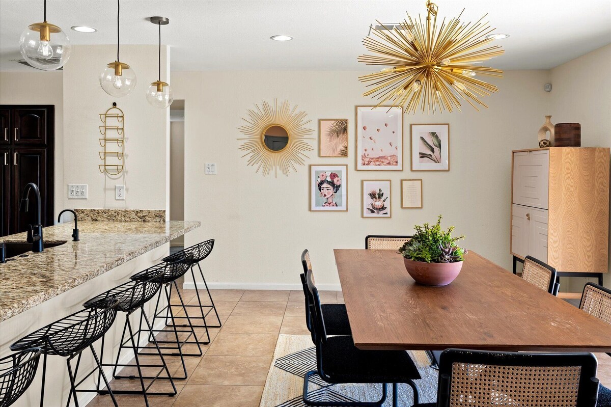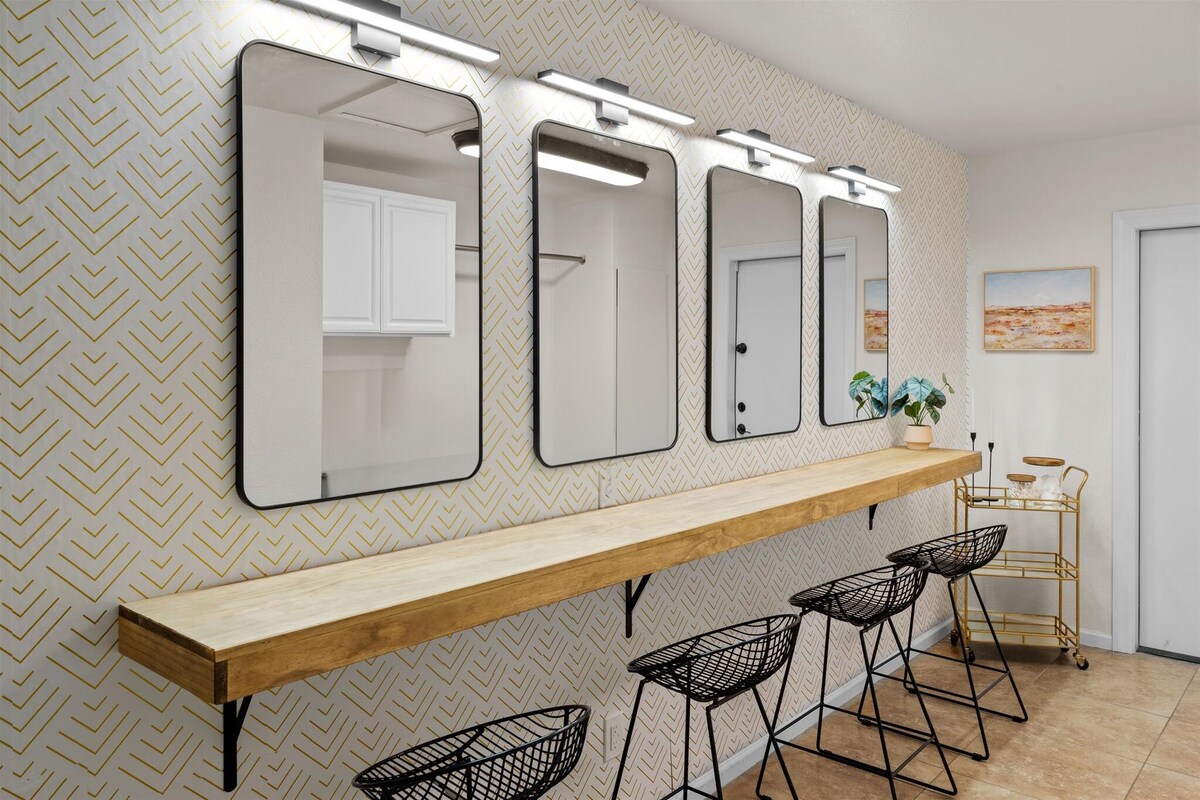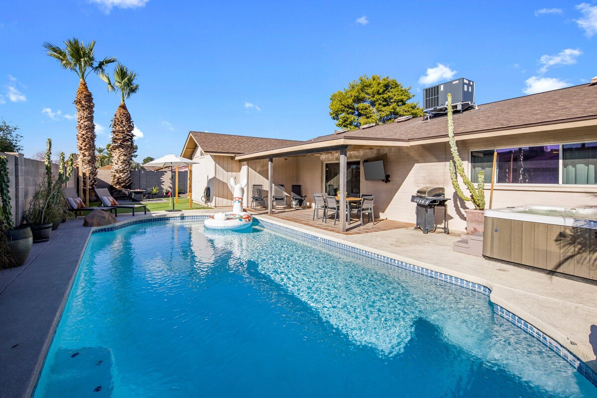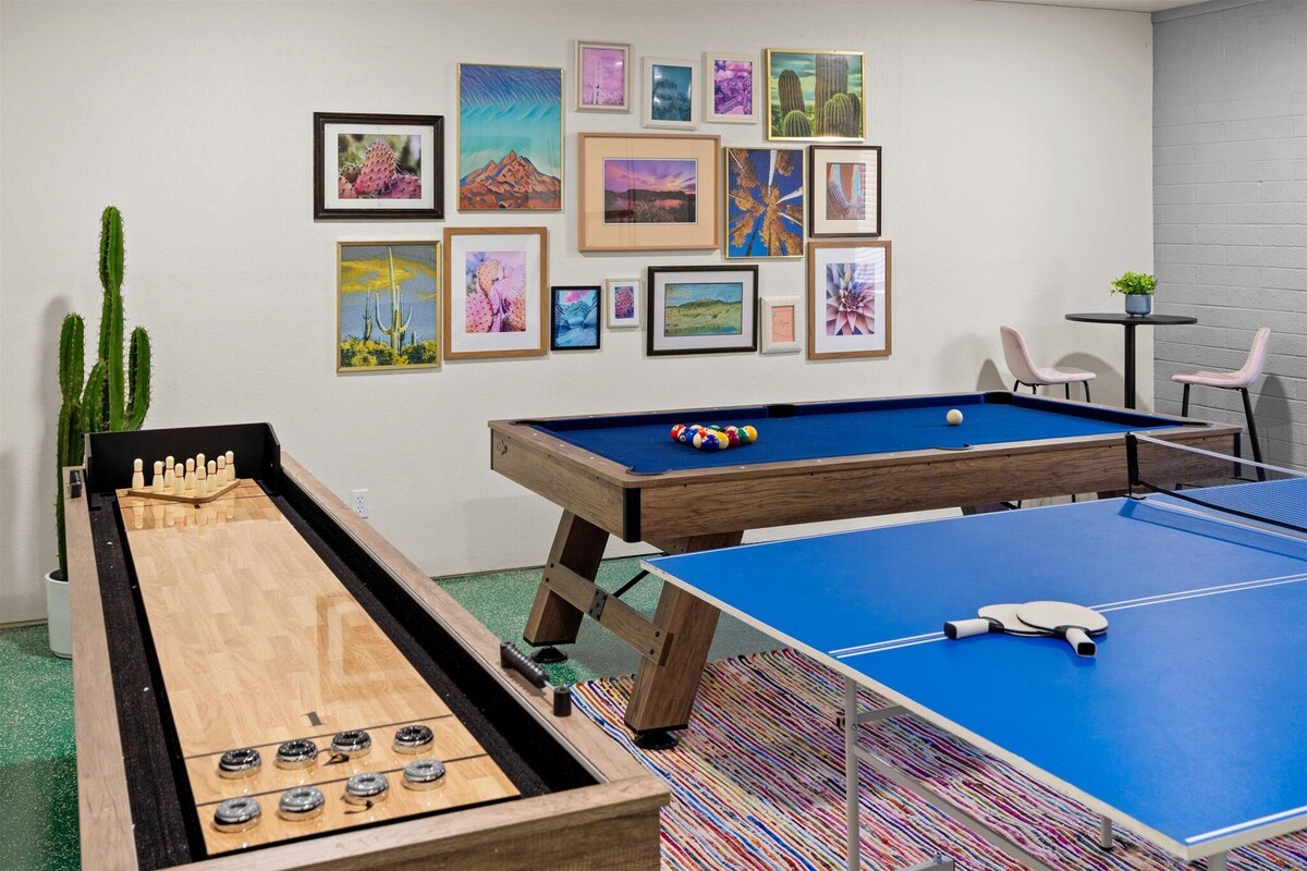 Welcome to The Desert Modern! *Pool can be heated upon request with a minimum length of two days – minimum of $150 charge. Additional days of pool heat requested will be $75. * Discover a desert oasis in Scottsdale! Our 4 bedroom, 2 bathroom mid-century modern house, located 5 mins from Old Town Scottsdale, sleeps up to 12 guests. Take a dip in the pool and relax inside surrounded by desert-inspired decor. Our game room features pool, ping pong, and shuffleboard. Stylish bedrooms, a beauty bar, fully equipped kitchen, a putting green, and bocce ball court are just some of the amazing features of this short term rental! Welcome to your desert oasis in the heart of Scottsdale! Our four-bedroom, two-bathroom house is the perfect retreat for your group getaway, just a five-minute drive from the vibrant Old Town Scottsdale. Step into a stylish mid-century modern haven where every detail reflects the beauty of the desert landscape. The spacious living area is adorned with carefully curated desert-inspired decor, creating a warm and inviting atmosphere. Large windows allow the Arizona sunshine to fill the space, giving you a true sense of the Southwest. The heart of this home lies outdoors, where a pool awaits your enjoyment. Whether you're soaking up the sun on a lounge chair or taking a refreshing dip, the pool area is your private slice of paradise. Gather around the outdoor dining area for al fresco meals or unwind in the evening by the fire pit under the starry desert sky. Play a round of putt-putt golf or bocce ball under the glow of the string lights! Inside, the game room is a hub of entertainment featuring a pool table, ping pong table, and shuffleboard table. Challenge your friends and family to friendly competitions or simply relax and enjoy the laid-back vibe of this unique space. The four bedrooms are thoughtfully designed for comfort and style, each with its own distinctive charm. With sleeping accommodations for up to 14 guests, everyone will find their perfect spot to rest and recharge for another day of exploration. The fully equipped kitchen makes meal preparation a breeze, and the dining area provides a communal space for sharing delicious meals and creating lasting memories. Located just five minutes from Old Town Scottsdale, you'll have easy access to the area's renowned dining, shopping, and nightlife. Explore the vibrant arts scene, stroll through boutique shops, or savor a meal at one of the many acclaimed restaurants. Whether you're seeking relaxation by the pool, engaging in friendly competition in the game room, or exploring the excitement of Old Town Scottsdale, our desert-inspired retreat is the ideal home base for your unforgettable Scottsdale getaway. Book your stay now and experience the best of Arizona living! *Note: Highchair and pack n play available upon request. Please let us know upon booking if you need these items! *Disclosure Regarding Pool Heat* Before requesting pool heat, please be advised of the following: We cannot make the pool into a hot tub! The maximum temperature we heat the pools to is 85 degrees. Please also be advised that in the winter months when the overnight temperature drops below 50 degrees, the pool heaters will simply shut off to avoid mechanical damage to the heat pump system due to the ice that will form otherwise on the internal coils. The heaters will turn back on automatically when the temperature outside goes back up/when the ice that was forming to cause the shut off melts, but this means that we cannot promise the pool will stay heated to our normal of 85 degrees. Even with the cooler temperatures, the pool heaters do tend to keep the pools within 5 degrees of the desired temperature. This turning on and off the heater is very expensive for the homeowners, hence the pool heating charge. Therefore, please note we will NOT be able to refund the pool heating charge if you feel the pool did not stay warm enough during your stay. The pools have been heating up to 75-85 degrees, which is 35-45 degrees higher than the outdoor temperature. ***PLEASE - NO CONFETTI or GLITTER!*** - No confetti or glitter allowed on the property. No confetti decor, no confetti balloons - no confetti or glitter of any type. If used, an extra cleaning fee will be charged to the guest. PETS: - Pets are allowed upon approval from host. Please disclose type of pet, breed, and weight. Pet fee of $100 per pet. THIS IS A NON-SMOKING PROPERTY. - NO SMOKING OF ANY KIND is permitted inside or outside the home. This includes cigarettes, vaping, marijuana, and cigars. TPT # 21452392 Scottsdale STR #2036502 ***** This property and all guests must comply with AZ Senate Bill SB 1168, City of Scottsdale ordinance Sections 18 - 150, 18 - 121 and all state and city regulations. Our prices include all fees. No hidden fees.