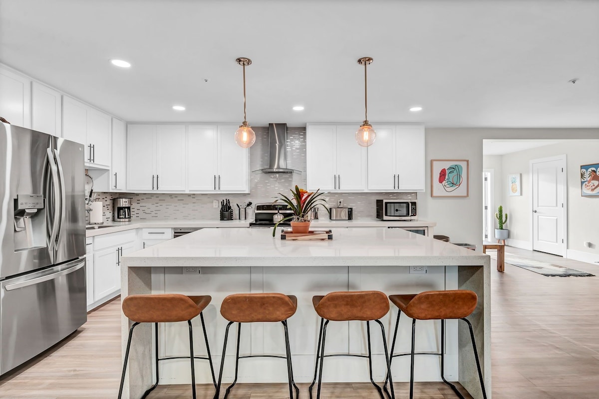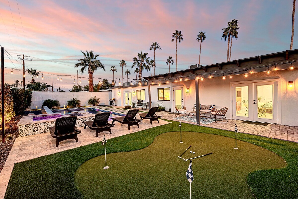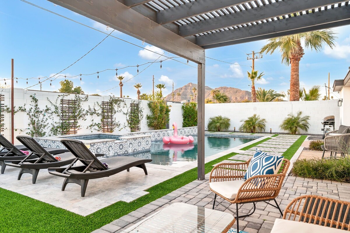 Indulge yourself in the tranquil vibrancy of this 4-bed, 3-bath home located in the heart of Scottsdale. From the brand new swimming pool to the built in wine fridge to the mood-setting dining room, you are perfectly set up for memorable dinners and gatherings. Step out into the back yard and decompress in the pool or jacuzzi, while taking in the panoramic view of the Arizona sunsets setting over Camelback Mountain. Close to Old Town Scottsdale - full of the hottest bars and restaurants! - 2,059 SF with 4 bedrooms and 3 full bathrooms - Sleeping for 10 guests - Outdoor pool and lounge chairs - Outdoor spa - Formal dining for 8 - Multiple seating areas in the living spaces - 77\ ,