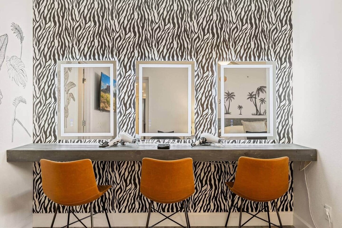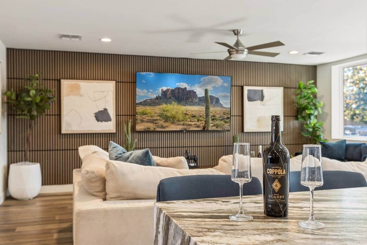 Welcome to \ luxury home near Old Town Scottsdale! ✨ Highlights: Ferrari-inspired racing simulator game room Makeup bar Close to Old Town, Golf, Spring Training, Freeway 🏊♂️ Resort-style (free) HEATED Pool: rock waterfall, bubbler, & baja step! 9-hole mini golf course 🎬 Entertainment Central: 9 XL TVs, high-end furniture, many games 🍽 Chef’s Dream Kitchen: with top-tier appliances 🏡 Indoor/Outdoor Living: via window wall 🛁 Dreamy Primary Suite: Jet tub & walk-in shower ✨ Why La Ferrari Stands Out: • Indoor-Outdoor Living at Its Finest A sleek, open-concept floor plan with a retractable sliding glass wall creates a seamless flow to your private backyard paradise — ideal for entertaining, relaxing, and enjoying Arizona’s best weather. • Designer-Furnished Bedrooms Each of the 5 bedrooms is uniquely styled for comfort and sophistication — perfect for couples, families, or groups. • Spa-Inspired Bathrooms Featuring custom tilework, mood-lit vanities, and an indulgent jet tub, every bathroom delivers a boutique hotel experience. • Gourmet Chef’s Kitchen Enjoy top-tier appliances, a statement waterfall island, and all the essentials to create memorable meals at home. • Private Off-Street Parking Ample, secure parking for multiple vehicles. ⸻ 🛌 Sleeping Arrangements: • Bedroom 1: King Bed + Queen Pullout Sofa | En Suite Bath • Bedroom 2: King Bed | En Suite Bath • Bedroom 3: King Bed • Bedroom 4: King Bed • Bedroom 5: 2 Queen Beds • Bathroom 3: Shared by Bedrooms 3 & 4 ⸻ 🌴 Your Resort-Style Backyard Includes: • 💦 Heated Pool with diving board and tranquil waterfall feature • 🛋 In-pool loungers + additional poolside seating for 6+ • 🍴 Covered al fresco dining area for 6 • 📺 Outdoor TV + Lounge Zone with cozy seating • 🕹 Yard games: Life-size Connect 4, chess, cornhole & axe throwing • 🔥 4-burner propane grill for BBQ nights under the stars ⸻ 🎮 Entertainment & Tech Upgrades: • 🚗 Ferrari Racing Simulator + Xbox Gaming System Feel the adrenaline with your own Ferrari game system setup, perfect for both kids and grown-up car lovers. • 📶 High-speed WiFi & Smart TVs throughout • 🛋️ Ultra-comfy living room with oversized TV + retro arcade game ⸻ 🎯 Extras That Make a Difference: • ✨ Fully stocked home with plush linens, pool towels & starter essentials • ✨ Located minutes from Old Town, golf, hiking, dining, and nightlife • ✨ Professionally designed interiors with luxury textures and finishes ⸻ 🕒 Flexible Check-In/Out Options (subject to availability): • $100/hour (1 hr early/late) • $200 (2 hrs) | $300 (3 hrs) • 3+ hours requires additional night booking ✨ Message for extension discounts or special offers. ⸻ 🧴 What’s Provided: • Pool towels, bed linens, paper goods, and cleaning essentials • Starter items: coffee, sugar packets, spices, toiletries • Propane tank provided (refill may be required during extended use) ⸻ 🛎️ Book your stay at La Ferrari today — where luxury is standard, the pool is always perfect, and your next unforgettable Scottsdale memory begins. You will have full access to the entire home, excluding the closets used for cleaning supplies. This includes both the front and back yards, as well as the driveway. A digital keypad entry provides seamless and secure access for all members of your group. For any immediate assistance, we’ve provided a contact sign by the front door with the details for both hosts. You may also reach out to us directly through the app for prompt responses. We're here to ensure you have a smooth and enjoyable stay! Ready to upgrade? Ask about additional services, including decorating and fridge stocking packages, in-stay cleanings, and concierge bookings (restaurants, massage, personal chef, etc.). Let us take care of the details and help make your trip unforgettable! STR License #2036558 Our prices include all fees. No hidden fees.