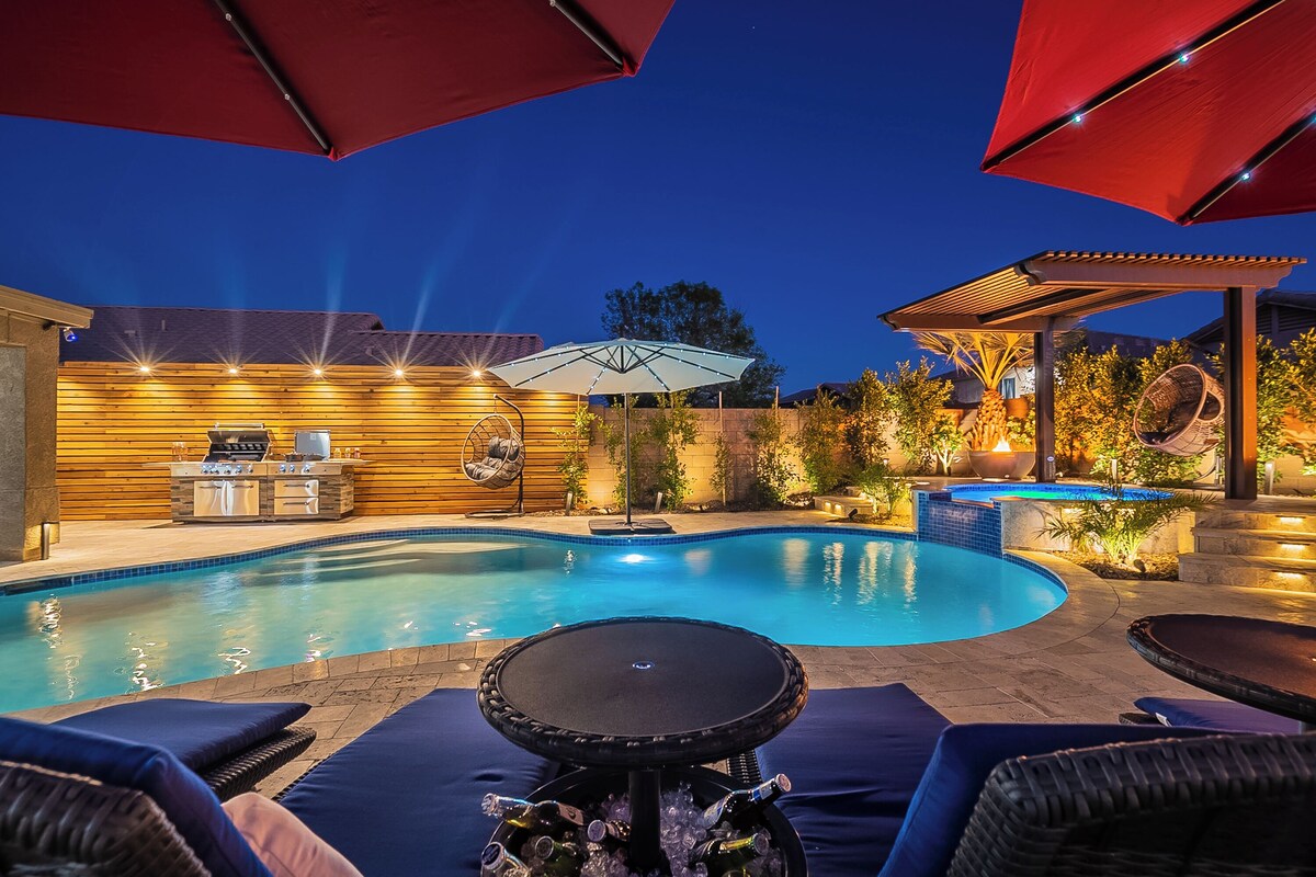 Amazing location a little more than 1 mile away from State Farm Arena, Westgate Entertainment District, Diamond Casino, Peoria Sports Complex, & Top Golf. The Stadium is a $142 million venue where the AZ Cardinals & Coyotes play football/hockey. The backyard has a HEATED Pebble-Tec POOL, Billiards, Mini-Putt-Putt, Jacuzzi, Ping-Pong Table, Fire Pit, BBQ Grill, Foosball, & Jenga. Each room has Smart TVs WITH CABLE. The home is internet/Wifi ready & has 24-hour check-in w/ a Smart Lock (No Key Needed). \ applies here. This house has it all. The backyard is a high-end resort, featuring beautiful custom landscaping worth $250k. It includes outdoor Travertine flooring around the heated Pebble-Tec pool, a built-in spa/hot tub under a custom pergola, a 6-person firepit table under a second custom pergola, an 18-person outdoor picnic table under a full-length covered patio with 3 ceiling fans, 6 sun lounge chairs, & 3 Egg lounge chairs. The built-in hot tub also has a waterfall with a new LED light. The backyard has a mini-putt-putt, ping-pong table, foosball table, cornhole, Jenga, and a dartboard. Inside the game room, you have a billiards table, 4 arcade games (Pac Man, Galaga, Mortal Combat 2, & Big Buck Hunter), and 15 board games. Some of the board games include: Monopoly, Apples to Apples, Poker, Chess, Playing Cards, Cards Against Humanity, & another game called \ As soon as you walk inside, the kitchen boasts built-in Samsung appliances, a new Samsung refrigerator, and a 36\ re at "home" when you pool\ We do not allow you to 'instant book' this home. After we share the address with you in the VRBO message log, we will pre-approve your request. This home is not located in Scottsdale, but rather in nearby Peoria, Arizona. Once the address is provided, you can determine if the location is suitable for your group. If the location meets your requirements, you can then enter your credit card information to book the home. If the location is not suitable, there is no need to enter your credit card information or proceed with the booking. The Listing ID NUMBER on VRBO is 4480131. You can enter the listing ID into the VRBO search engine to view a map of the home's location. Please confirm that the address is suitable for your group before entering your credit card information, as all terms and conditions remain the same. This serves as an addendum to the listing description on VRBO.** On a side note, the pictures displayed in this listing are of the actual home you are booking. The VRBO cancellation policy is a no-refund policy, so consider obtaining travel insurance if you are concerned about being unable to honor your reservation. Events and parties of any kind are prohibited at all homes we manage. We do not allow guests or visitors. The price is calculated based on the amount of guests on the reservation. Prices are higher for larger groups and more competitive for smaller groups. This property has surveillance cameras outdoors in the front and backyard that record audio and video. Such security is standard in high-end accommodations and is mandated by insurance for liability. For concerns about camera use, please contact me before booking. Our prices include all fees. No hidden fees.