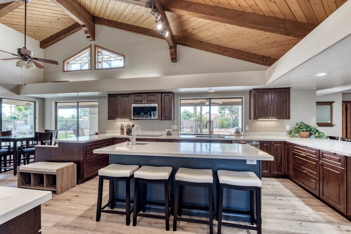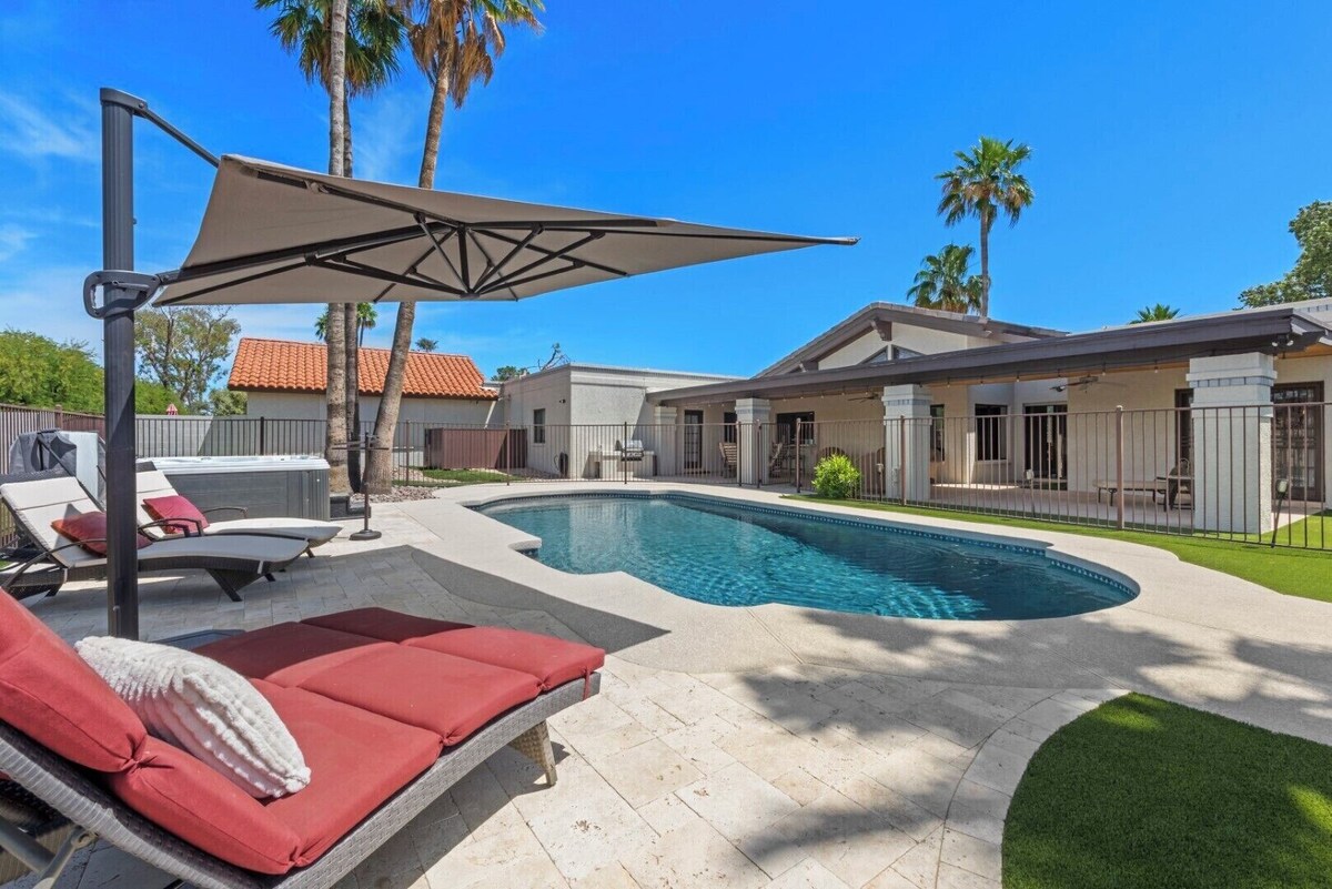 The main house is approx. 3,100sf with a beautiful open floor plan, 4 bedrooms (2 en-suites), 3 bathrooms, on a large lot with fenced and heated diving pool, gorgeous hot tub and a large backyard play area for the kids! REMODELED IN 2020 and 2022 with new stainless steel appliances, two large refrigerators, wine refrigerator, double ovens, quartz countertops, wood-look flooring, game room with pool table, dining room with large expandable dining table, fenced and heated pool, 50-jet hot tub and so much more! Home sits on a luxurious Scottsdale estate in the prestigious Sunrise Estates neighborhood.