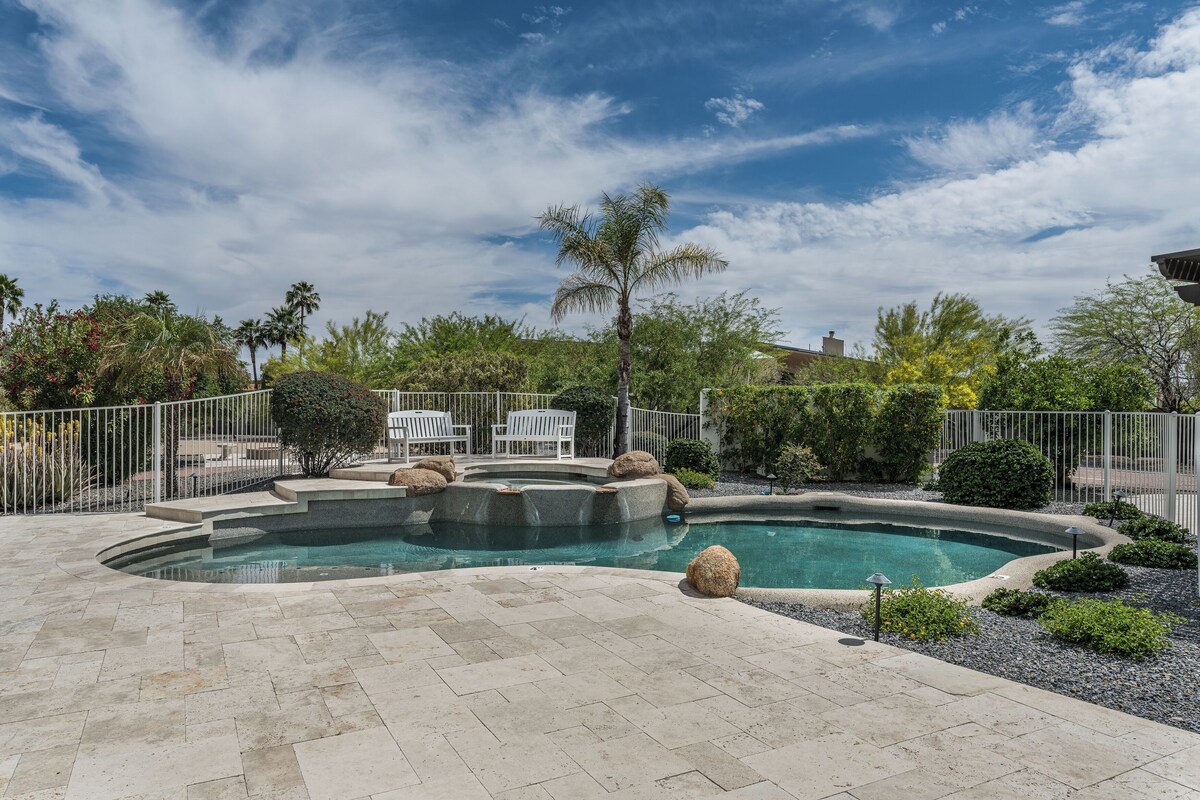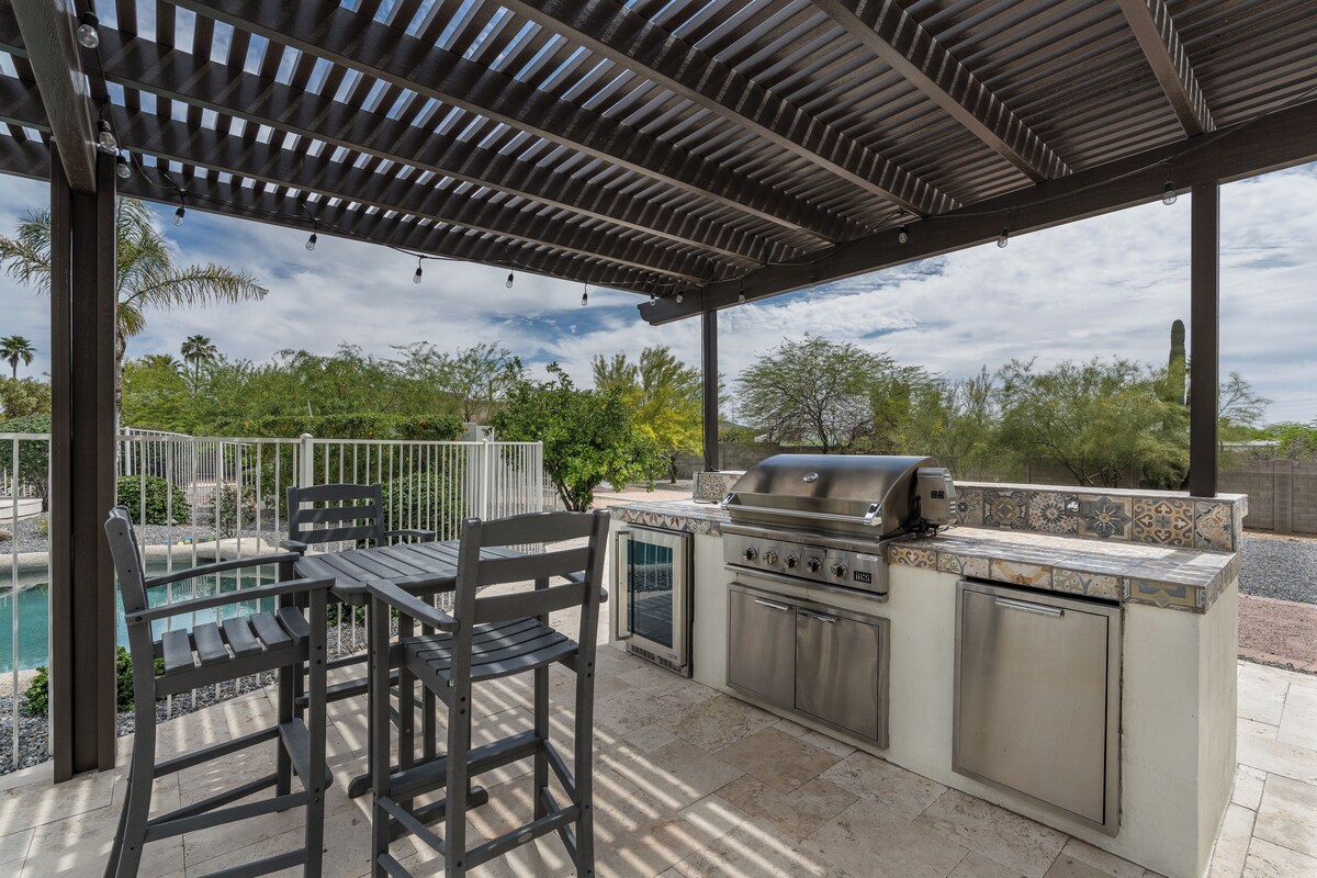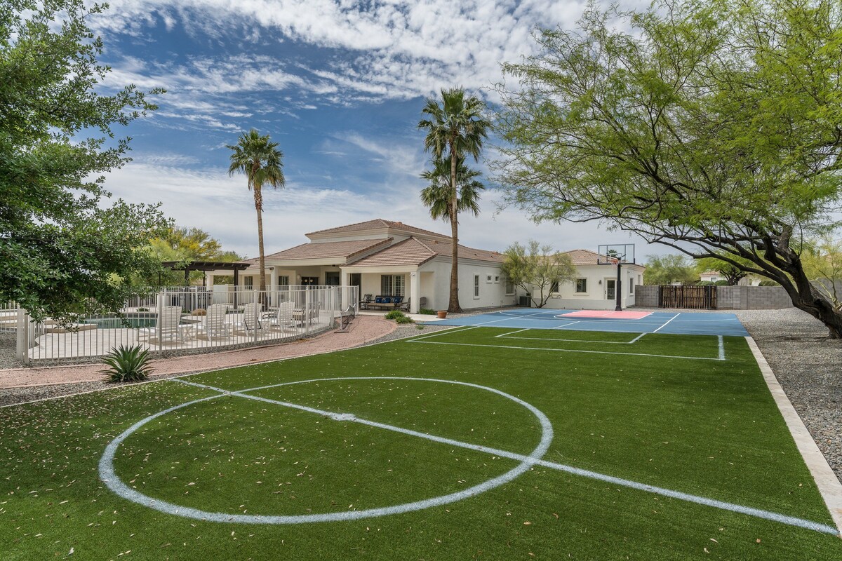 TPT License #21438307 Scottsdale Registration #: 2023983 Live Large at Paradise Heights Retreat The amount of amenities will shock you. The backyard alone is full of activities but let's start by walking into the massive entry, open room concept with the living space, kitchen and dining room, and the pool table that welcomes you right away to the fun. The exposed beams, gray and blue accent colors with the pop of red throughout the home makes the home feel modern and fresh. This home even features a Tesla EV charger! Sports & Exercise: What would you like to do first? Log into your Peloton account for a morning spin, head outside to the basketball court, or practice your corn hole throws! You could even enjoy the picklebball court. Maybe take a dip in the pool for some swimming action. The private area in which the home is located is also great for anyone who wants to take an early morning or evening run to see the amazing colors the sky turns. Pool & Outdoor Area: The backyard retreat is over an acre of walled in private luxury. There is a heated spa and connected pool with a huge travertine pool deck for lounging. There is also an outdoor shower and changing space making transitioning from the house to the pool easy. It has a walking path around the backyard and pool area leading to the outdoor fire pit for those chilly fall and winter evenings. Utilize the full outdoor kitchen with a commercial gas grill, outdoor beverage fridge and bar to enjoy eating al fresco. The backyard offers privacy and a huge open space to enjoy and explore. Few private residences in Scottsdale have this type of expansive outdoor space. There is so much to offer in the 1.3 acres you will never have to leave. Pool or spa can be heated for an additional $150 + tax daily. Indoors: The house boasts a wide open main living area with seating for everyone. There's an 85” TV to watch all the games and the house is wired for Sonos throughout. Every room has a smart TV and the house has lighting fast 1G fiber internet for streaming or working remote. There is also an additional back game room/living room for the kids to escape to watch something else or play Xbox. There is also a queen pullout couch in the game room for additional sleeping options. The master has a huge walk in closet and beautiful marble bathroom. One of the back bedrooms has direct access to the patio and provides additional privacy if needed. Things To Know: 5 Bedrooms & 4 Baths HUGE Private Backyard with Sports Courts and Heated Pool Outdoor Shower Shoot Pool Location: The house is close the Lost Dog Wash Trail, Equestrian Park, and miles of bike/walking trails. Major cross streets: E Mountain View Rd & N 124th St House Rules There is a Peloton bike studio in the master bedroom you will need your own Peloton account to access Peloton classes. A laundry bag will be dropped off 1-2 days prior to departure. Please leave it where it gets left. Pool and landscape vendors access the home once per week and have access to the backyard Pool or SPA heat can be scheduled for $150+ tax per day (must be scheduled at least 3 days before check in) Pack Play, Highchairs and Air mattress for $40 each + tax Pets allowed, max 2 pets. $200 non-refundable pet fee each. Quiet hours are enforced from 9 pm-9 am No smoking allowed on the property to preserve its charm. Vendors have access to the homes on their scheduled day. Service days have the possibility of changing and do occur up to two times a week. This rental property is not used for Nuisance Parties or Unlawful Gatherings. 6 adults maximum plus their dependent children are allowed at the property. Unauthorized late check-out will incur a penalty of $150 + tax Early check-in and late check-out are subject to availability and may incur additional fees. Please reach out 1–2 days prior to check-in to inquire about pricing and availability. For your safety and security, there may be public-facing cameras installed on the property. *We do our best to ensure guests have a 5 star experience. Guests will be provided with a start up supply of household items such as laundry soap, dish soap, paper towels, toilet paper etc so that upon check in you do not need to run to the store. If your stay is longer than a few days you will need to bring these items with you. Thank you! *Important Note: We want you to enjoy your stay to the fullest, Please be aware amenities may break or not work during your stay and we'll do our best to accommodate you. May an amenity not work or fail during your stay we will do our best to make it right, and we can refund up to 10% of the affected nights to make it right. You have to let us know at the time of notice so we can do our best to remedy the situation. 6 adult maximum plus their dependent children are allowed at the property Our prices include all fees. No hidden fees.