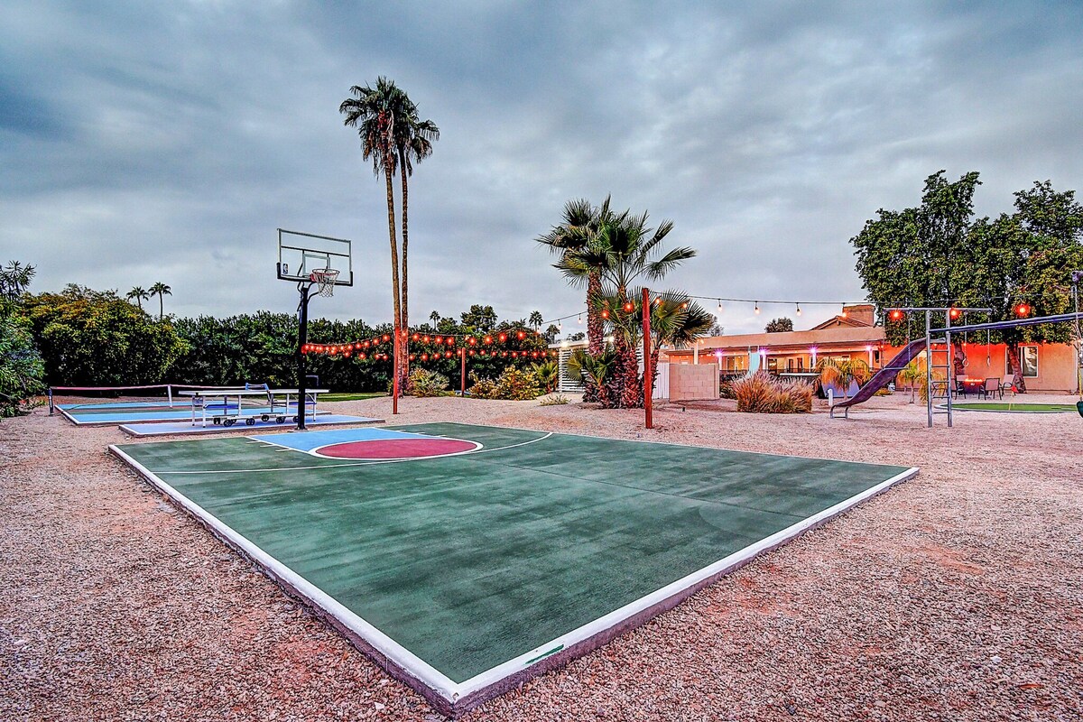 ScottsdaleStays Presents: **The Sweetwater Estate** 7/8 Bedroom Multimillion-Dollar Private Estate | Pool • Spa • Sports Courts • Cabana **Enjoy the lowest summer rates ever** on this resort-style estate set on nearly **an acre** in one of the most **coveted areas of Phoenix–Scottsdale**. With space to sleep large groups comfortably and a lineup of luxury amenities, *The Sweetwater Estate* is the perfect choice for: **Family reunions** **Golf getaways** **Bachelor/Bachelorette & yoga retreats** **Corporate or business trips** **Luxury staycations** Why Guests Love It: Huge **private pool with slide** **Outdoor cabana** with 65\ outdoor TV **8 pool loungers**, billiards, and massive yard space Hosted by **ScottsdaleStays**—one of the largest **local** vacation rental companies in the area, with **thousands of 5-star reviews** and **full-time, on-the-ground service staff** available **Monday–Saturday, 9 AM–5 PM**. --- ### Prime Location: Surrounded by: **The best dining & shopping** in Scottsdale * World-famous **golf courses** * 10–15 minutes to **Old Town**, **Barrett-Jackson**, **Phoenix Open**, and **Sky Harbor Airport** --- ### Bed Configurations (All rooms have memory foam mattresses & TVs): **East Wing** * Primary Suite: King Bed + Ensuite * Bedroom 2 (via Primary): Double Bed * Bedroom 3: 2 Queen Beds * Bedroom 4: 2 Queen Beds * Bedroom 5: King Bed **West Wing** * Bedroom 6: 2 Queen Beds * Bedroom 7: 2 Double Beds * Bedroom 8: 4 Full Beds (2 adult-caliber bunk beds) *Sleeps large groups comfortably. Let us know your headcount in advance for proper setup.* --- ### Guest Policy & Extra Guests: Base rate includes **up to 8 guests**. A **\\$40/night fee per guest over 8** (ages 2+) applies to help cover utilities, cleaning, and wear & tear. *Please enter your actual guest count when booking—this is calculated automatically in your quote.* --- ### Featured Amenities: * Heated Pool (Optional: \\$150/night + tax or $600/week + tax) * Heated Hot Tub (One-time service fee: \\$150 + tax) * Basketball / Pickleball Court * Sand Volleyball * Bocce Ball, Cornhole, Ping Pong, Giant Connect 4 * BBQ Grill (Guests clean/refill propane) * Gas Fire Pit Conversation Area * Vegas-Style Outdoor Cabana with 65” TV * Indoor Billiards Room * 8 Pool Loungers --- ### Smart & Safe Check-In: * **Keyless entry with unique code** for each guest * No need to meet a property manager * Secure and easy arrival process --- ### Cleaning & Service: * Basic clean fee covers full-service pool and landscape care * **Deep-clean upgrade** available for \\$200 + tax (great for pre-arrival perfectionists) * **Mid-stay cleaning** available upon request for an additional fee --- ### Important Info & Policies: #### Booking Requirements: * **Primary guest must be 25+** with ID sent within 3 days of booking (unless highly rated guest) #### No Unauthorized Parties: Strictly enforced: City of Scottsdale **Ordinance G-5444** prohibits loud parties or events at any time of day. Violations will result in **immediate eviction**, **loss of deposit**, and potential **city fines up to \\$10,000**. #### Pets: * Allowed **only with prior approval** * **\\$150 nonrefundable pet fee per pet** #### Outdoor Music: * Outdoor speakers included * Volume must comply with **local noise ordinances** --- ### Essentials Provided: * Fully stocked **kitchen** * Toaster, **Keurig + Coffee Maker**, blender, microwave * Cooking utensils, dishware, glasses * Washer/Dryer + 4 detergent pods * Hair dryer, iron + ironing board, hangers * Shampoo, conditioner, body wash * Bed linens, extra pillows, and blankets --- ### FAQ Highlights: **Q: Can we check in early or check out late?** A: Yes! Early check-in (as early as 8AM) or late checkout (up to 8PM) **may be available for as lows as \\$400**—please inquire. **Q: Can we have the pool heated?** A: Yes! It’s \\$150/night or $600/week+ tax (advance notice required). **Q: Do we need to sign anything?** A: Yes. Guests must sign a **Pool & Spa Indemnification Form** before arrival. *Note: No lifeguard or pool fence on site.* --- ### Licenses & Compliance: * **Scottsdale Short-Term License #:** 2023299 * **Arizona TPT #:** 31-049568 * Fully compliant with **Arizona §33-1806.01 / §33-1260.01** --- **The Sweetwater Estate** combines the scale and luxury of a resort with the privacy and comfort of a true Scottsdale sanctuary. Book direct with confidence. On-the-ground support. Verified 5-star host. Save thousands compared to luxury resorts. GUEST SWIM IN POOL AT THEIR OWN RISK WAIVER OF LIABILITY: You understand that you using the swimming pool/hot tub at your own risk and that special risks may be involved in using the swimming pool/hot tub. You accept full responsibility for any bodily injury arising from use of the swimming pool/hot tub and hold owner harmless. You understand there are potential dangers that the swimming pool/hot tub may present to children who are not carefully supervised, as well as the danger to any person using the swimming pool/hot tub, or if a person has health risks, or if a person uses the swimming pool/hot tub while intoxicated or using any kind of drugs or medication, or uses the swimming pool/hot tub if pregnant. You agree to explain the risks of using the swimming pool/hot tub to any guests you may have at the property and to be fully and solely responsible for any accidents your guests may incur. You understand the risks discussed above and agree that you will assume all responsibility for yourself and your guest for the consequences of those risks. You agree to waive any claim whatsoever against owner for accidents or claims arising from your guests’ use of swimming pool/hot tub. Our prices include all fees. No hidden fees.