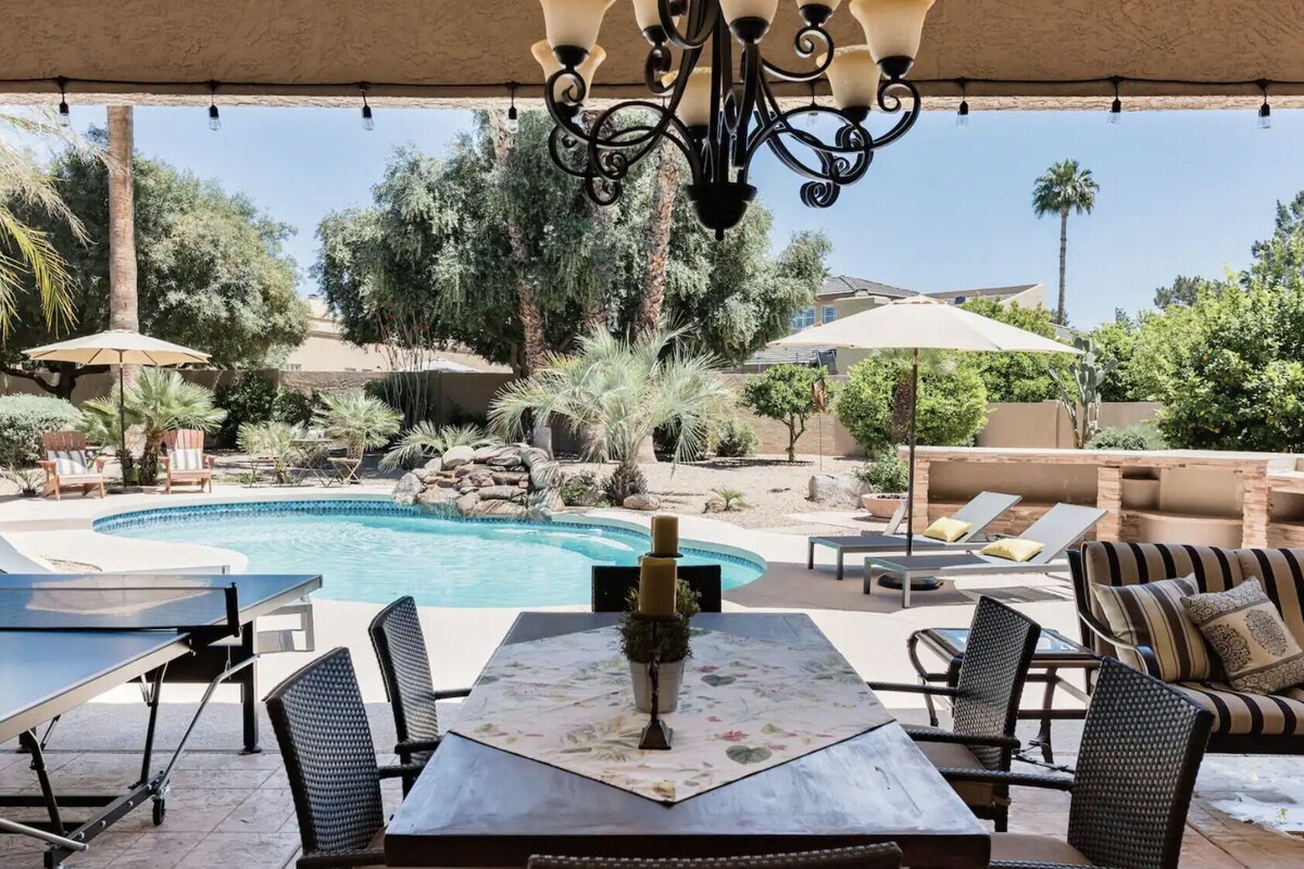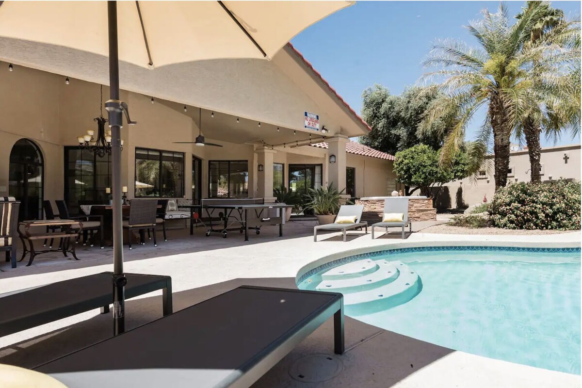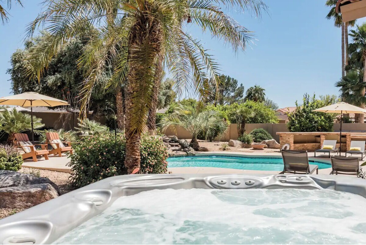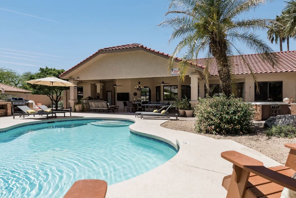 This luxury home is located in a fabulous neighborhood, featuring a beautiful open concept. Enjoy an expansive kitchen, living room with bar, and additional sitting room perfect for sipping morning coffee or reading a book. Venture outside to a covered patio, private pool, hot tub and outdoor fire pit. The backyard provides plenty of seating, with an abundance of poolside lounge chairs and a dining table. Play a game of table tennis, or have an evening bbq surrounded by palm trees. Owner will be at their second home down the road but will be excited to meet you to answer any questions if needed. We’re always happy to give recommendations! LOCATION Great location for the Waste Management Phoenix Open! •10 minutes from Spring Training for Colorado Rockies & Arizona Diamondbacks •10 minutes from TPC Scottsdale - host of WM Phoenix Open •Surrounded by multiple Golf Courses •15 minutes from Old Town Scottsdale •40 minutes from Sky Harbor Airport •20 minutes from Camelback Mountain •30 minutes from Downtown Phoenix •10 minutes from Talking Stick Resort/Casino •10 minutes from Top Golf At Talking Stick *PLEASE SEE THE END OF THE LISTING FOR INFORMATION ABOUT THE COST OF HEATING THE POOL DURING YOUR STAY. HOST MUST BE NOTIFIED AT LEAST 48 HRS IN ADVANCE IF WANT THE POOL HEATED AND HAS TO BE HEATED ENTIRE STAY* 6 bedroom spacious home w/ large kitchen, living room w/ indoor bar, and sitting room. Enjoy the outdoor amenities including a covered patio & private pool! The backyard provides plenty of seating, with an abundance of poolside lounge chairs and a dining table. Play a game of table tennis or take an evening dip in the pool! LIVING ROOM 1 60\ RCA Smart TV King Bed Private Master Bath w/ Walk-in Shower & Jacuzzi Tub Closet w/ Storage Reading Lounge Chair Pool View BEDROOM 2 Queen Bed Closet w/ Storage Was orginally an office and wall has opening toward ceiling so noise privacy is limited BEDROOM 3 Queen Bed Closet w/ Storage BEDROOM 4 60\ RCA Smart TV Pool Hot tub Covered Patio Patio Furniture w/ Dining Table Pool Chairs Pool Umbrella BBQ/Grill Table Tennis Outdoor Fire Pit LOCATION Great location for the Waste Management Phoenix Open! •10 minutes from Spring Training for Colorado Rockies & Arizona Diamondbacks •10 minutes from TPC Scottsdale - host of WM Phoenix Open •Surrounded by multiple Golf Courses •15 minutes from Old Town Scottsdale •40 minutes from Sky Harbor Airport •20 minutes from Camelback Mountain •30 minutes from Downtown Phoenix •10 minutes from Talking Stick Resort/Casino •10 minutes from Top Golf At Talking Stick POOL HEATING COST & INFORMATION: There is an extra $110/night charge if you want the pool heated. The heater has to be turned on manually so the pool if the pool heater is wanted it will have to be for the entire stay. The pool is a swimmable temperature but is not a temperature similar to a hot tub. EARLY CHECK-IN: When available we offer two early check-in options, 2pm for $50 (plus processing fees), and 11am for $100 (plus processing fees). 14 days before arrival you will receive an initial text that will include more information on how to request these options. Before then the ONLY way to guarantee early check-in is to book the night before. -NOTE: Dog friendly property, an additional PET FEE of $100 (plus fees) is required to be paid before your arrival if you want to bring a pet. This fee is separate from what you pay at booking. A maximum of 2 dogs are allowed. -NOTE: Noise monitors do not record and only sample noise levels periodically. - NOTE: There will on occasion be gardeners and pool service members that come to the property in the early morning to service the property. - NOTE: This property does not have any safety railings or grab rails. - NOTE: The inside fireplace is not available to guests. - NOTE: We provide a starter supply of amenities (laundry soap, dish soap, paper towels, toilet paper, shampoo, conditioner and body soap) for guests to enjoy during your stay. There might be instances where guests have to replenish these items for themselves if higher than average amount is used. -NOTE: Depending on the channel where you book this property you may be required to complete guest verification through third-party provider Truvi. This is done to ensure we are keeping up-to-date with short-term rental regulations as well as providing both our guests and our properties with extra protection. Truvi will contact you via email and/or text to complete the verification. Please do so prior to arriving at the property to enable a quick and easy check-in process. How you pay for pool heating depends on what channel you booked through. If your booking is through Airbnb, make the payment via www.Airbnb.com/resolutions. For bookings made through other channels, payment can be made in the Marketplace section of the online Guidebook, which we will text you 14 days prior to your stay. Please note that pool heating is charged on a per-night basis. For example, if you pay for Friday night, the heating will be available from midday Friday to midday Saturday, aligning with your reservation timeline. TPT License: 21453962 Scottsdale License: 2023364 LOCATION Great location for the Waste Management Phoenix Open! •10 minutes from Spring Training for Colorado Rockies & Arizona Diamondbacks •10 minutes from TPC Scottsdale - host of WM Phoenix Open •Surrounded by multiple Golf Courses •15 minutes from Old Town Scottsdale •40 minutes from Sky Harbor Airport •20 minutes from Camelback Mountain •30 minutes from Downtown Phoenix •10 minutes from Talking Stick Resort/Casino •10 minutes from Top Golf At Talking Stick Our prices include all fees. No hidden fees.