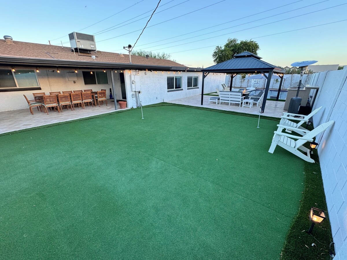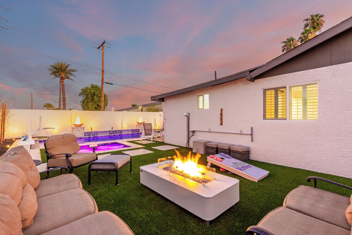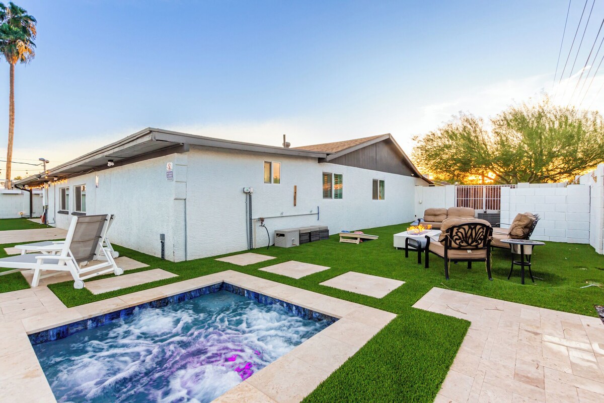 **Welcome to your luxurious home located in Scottsdale, AZ. This stunning 4-bedroom, 3-bathroom 2215 sq-ft property is designed to provide you with unparalleled comfort, making your stay truly exceptional. ** **Two Master Bedrooms: ** ✔ Spacious king-sized bed ✔ Elegant dresser ✔ Private bathroom ✔ Ample closet space ✔ High-quality linens and decor **Third Bedroom: ** ✔ Cozy queen-sized bed ✔ Stylish dresser ✔ Desk workstation ✔ Generous closet space ✔ Comfortable and inviting atmosphere **Fourth Bedroom: ** ✔ Comfortable queen-sized bed ✔ Modern dresser ✔ Desk workstation ✔ Ample closet space ✔ Perfect for relaxation and productivity **Living Room: ** ✔ Open and airy design with ample seating ✔ Large flat-screen TV (75-inch HDTV) with Netflix, Hulu, Apple TV, premium cable, and Amazon Prime Video. With plush Theater Style Leather sectional seating and reclining chairs. ✔ Sonos sound system with Bluetooth and aux ✔ Pool table ✔ Books and reading material ✔ Modern decor and furnishings ✔ Perfect for relaxation and socializing **Kitchen and Dining Area: ** ✔ Fully equipped kitchen with modern appliances ✔ Spacious dining table for family meals ✔ Breakfast bar with stools ✔ Stylish and functional design ✔ Refrigerator, mini wine fridge, freezer with craft Ice balls ✔ Microwave, GE stainless steel electric stove, oven ✔ Cooking basics (pots and pans, oil, salt and pepper) ✔ Dishes and silverware (bowls, chopsticks, plates, cups, etc.) ✔ Dishwasher, hot water kettle, coffee maker (drip coffee maker, Keurig coffee machine) ✔ Wine glasses, toaster, baking sheet, blender, barbecue utensils (grill, charcoal, bamboo skewers/iron skewers, etc.) ✔ Cuisinart 12 cup Coffee Maker and a Keurig with coffee pods supplied **Hall Way Full Bathrooms: ** ✔ Modern and clean design ✔ High-quality toiletries and fluffy towels ✔ Bathtub, hair dryer, cleaning products, shampoo, Nexus conditioner, body soap, hot water, shower gel ✔ Ample storage space ✔ Conveniently located for all guests **Outdoor Space: ** ✔ Beautifully landscaped yard ✔ Private patio or balcony ✔ Private backyard (fully fenced) ✔ Outdoor seating and dining area ✔ Natural Gas BBQ grill, and fire pit ✔ Corn-hole Game Set ✔ Mini Golf practice green ✔ Four Bikes, sun loungers, umbrellas ✔ An open space on the property usually covered in grass ✔ Private outdoor with electric pool cover for safety. Upgraded pool Heater/Chiller to keep the water temperature around 78-80 degrees year around. ✔ Waterfall on pool with fire features and a Baha lounging shelf ✔ Private hot tub **Additional Amenities: ** ✔ 1.5 Miles to Old Town, Entertainment District, Giants Stadium. Golf cart pick up and drop off service available for a small fee. Golf Cart owner Business cards on the counter. ✔ High-speed Wi-Fi throughout the property (444 Mbps, verified by speed test) ✔ Laundry facilities (free washer and dryer in unit) ✔ Central heating and cooling ✔ Portable fans, ceiling fans ✔ Fully furnished and equipped for your stay ✔ Complimentary bicycles ✔ Beach gear including towels, chairs, and umbrellas ✔ Fireplace guards, board games ✔ 2- Roll-away Twin Cots to be rolled to your space (Sleeps 1 each) **Safety and Security: ** ✔ Secure entry with smart lock ✔ Smoke detectors and fire extinguishers ✔ Carbon monoxide alarm ✔ First aid kit ✔ Exterior security cameras on property (entrance and exit doors) ✔ Noise decibel monitors on property (system in the family room for any volume over 87 decibels that emails the guest directly) ✔ Safe and friendly neighborhood **Entertainment and Connectivity: ** ✔ High-speed internet and Wi-Fi (444 Mbps) ✔ Flat-screen TVs with streaming services ✔ Sonos sound system with Bluetooth and aux ✔ Pool table, board games, books and reading material ✔ Mini golf **Heating and Cooling: ** ✔ Central air conditioning ✔ Heating system ✔ Ceiling fans in all rooms ✔ Portable fans ⭑**Parking and Facilities: ** ✔ On-site parking (free driveway parking on premises, free street parking) ✔ Garage space with bikes and space for 1 car ✔ Single level home (no stairs in home) ⭑**Services: ** ✔ Pets allowed (for additional pet fee) ✔ Assistance animals are always allowed ✔ Self-check-in with smart lock ✔ Optional housekeeping services ✔ Local recommendations and concierge services Your stay at Ritter’s Resort Oasis in Old Town Scottsdale promises luxurious comfort, unmatched convenience, and a memorable experience. Book now and start your Scottsdale adventure in style! (Occupancy Tax ID Code #2133932; Scottsdale License #2022668; Sleeps 6 Adults and up to 4 Adult dependent children (Per S.R.C. Code 18-152b) with 6 beds) Don't miss the chance to experience luxury and relaxation at its finest. Book your stay today and create unforgettable memories! \ Check out this Virtual 360 degree tour: Our prices include all fees. No hidden fees.