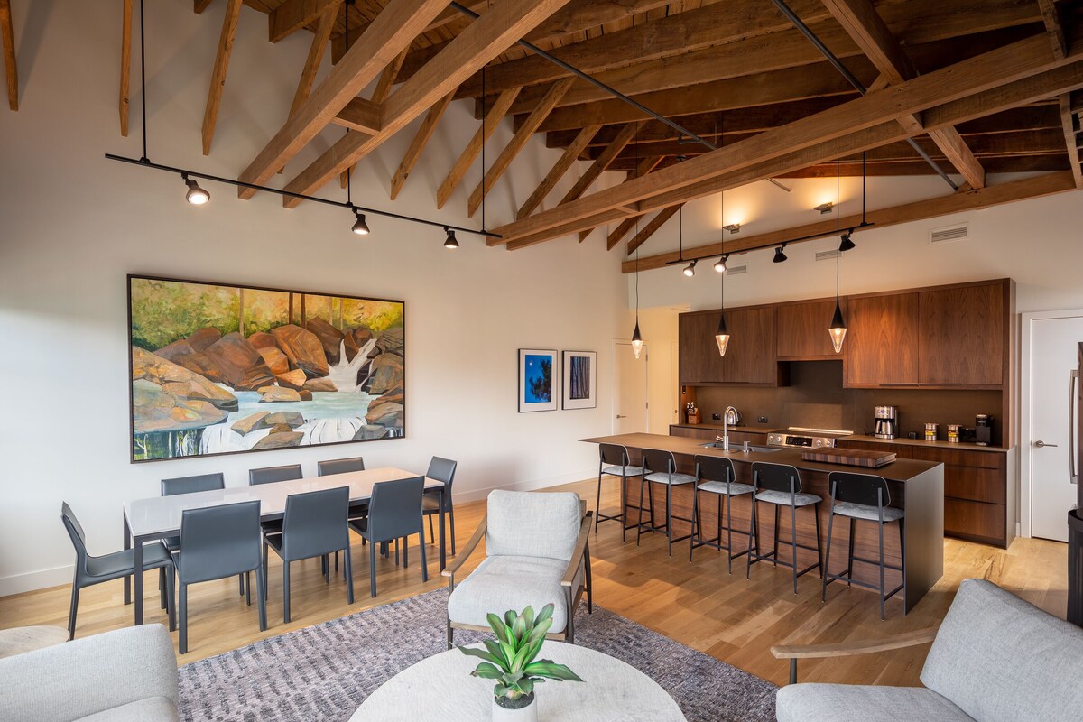Two-level unit with windows facing Broadway Street, a cozy gas fireplace in the living room, and a large living/dining area with adjacent powder room. It sleeps 8 people in 4 bedrooms (2 Kings, 1 Queen, and 2 Twin Beds), all with en-suite bathrooms with showers or tubs. One of the bedrooms with a King bed is on an upstairs mezzanine level. The kitchen has 5 barstools and a large custom dining table that seats 8. Complete furnishings are included in every unit: furniture, TVs (in living rooms and both bedrooms of each unit), appliances (including washer and dryer, iron and small ironing board, refrigerator, microwave, cooktop, oven, dishwasher, toaster oven, drip and Keurig coffee makers, blender, and hand mixer), pots and pans, cooking utensils, dinnerware, barware, and serving utensils. All units have a broom, small vacuum, utility ladder, and 2 sizes of pet bowls. There are also step stools and tableware sized for toddlers, and a toddler booster seat with a tray, as a convenience for guests with young families. Each apartment also has hair dryers and magnifying mirrors in both bathrooms, a scale in one bathroom, a combination alarm clock and charging station in each bedroom, and sheets, blankets, pillows, comforters, and towels for your use. Each unit has a selection of games and books about the local area for guests to enjoy during their stay. We also provide selected consumable items, including: paper products (toilet paper, paper towels, facial tissues, etc.), toiletries (hand soap, shampoo, conditioner, and body wash) and kitchen basics like garbage bags, dish soap, and dishwasher and laundry detergent, all of which are refreshed weekly. Our prices include all fees. No hidden fees.