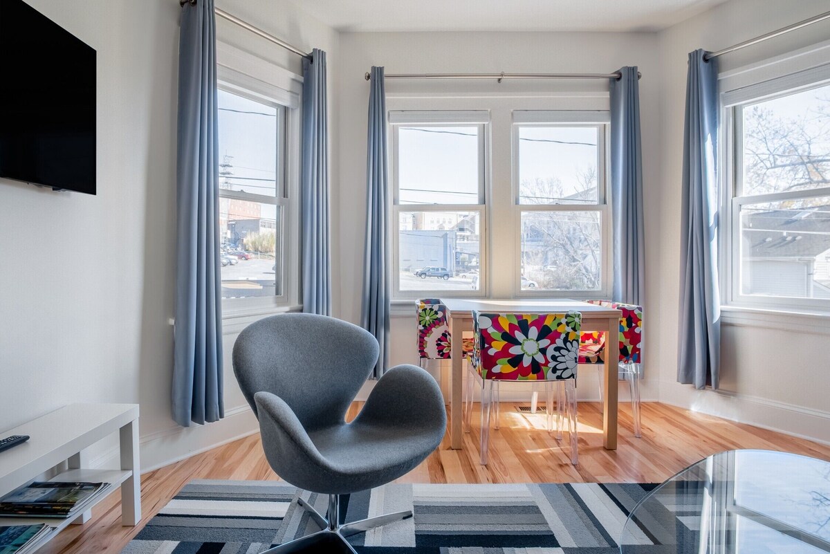 Make breakfast in a renovated kitchen with upgraded appliances and sit in multicolored chairs in a sunny bay window. Lively red accents are found throughout the apartment, from patterned bedroom cushions to a pair of family size laundry machines. Unless guests need anything or have questions about their visit, hosts do not interact with travelers. Once guests are confirmed, access information is provided to travelers in the reservation details, under their traveler account. Travelers will have the benefit of knowing the host is local, as well as assistance from his friendly guest services team, who have an intimate knowledge of downtown Asheville and enjoys providing guests with an easy booking process and most importantly, recommendations for a memorable Asheville experience. The apartment is on North Ann Street, off Patton Avenue in Asheville. It's at the west-end gateway to the River Arts District and the heart of downtown. Nightlife, public transport, city center, airport, and parks are nearby. Please note that, as often is the case when staying in a downtown neighborhood, you will inevitably have encounters with folks from all walks of life, including members of the unhoused population of our city. Among the neighbors on our street, is a service center that helps folks find housing and you will no doubt see some of their clients as you are walking down the street. We welcome you to read our reviews and notice that by and large, our guests feel safe and unbothered by this fact. Moreover, Downton Annie is a secure building with security cameras, locks, and the local police are never far if you feel unsafe but we want our guests to be able to have all of the facts at hand so they can choose in accordance with their level of comfort, as you will read in the reviews that it's not for everyone. If you have any further questions, please don't hesitate to ask before booking - we're here to set you up for a satisfying visit. Guests have the entire apartment. The apartment is in a building with three other units that also host guests. The back stairs are shared with one neighboring tenant on the 2nd floor and the first floor has two units. The apartment building's front door provides access to an interior set of stairs, is common space. An independent establishment for almost 100 years, Downton Annie continues Asheville's tradition of welcoming guests, with a freshly upgraded exterior and all four apartments remodeled for the future. Each apartment includes one off-street parking space. Let us know if you plan on bringing more than one car. Reflective of Asheville's bold style and situated at the Westend Gateway to the River Arts District, the interstate and in the heart of downtown Asheville, just of Patton Avenue, Downton Annie doesn't disappoint, even the most discerning traveler. Artfully decorated and tastefully priced, Apartment # One is easily accessible on the first floor represents the epitome of Asheville’s artsy-cool vibe. Pops of color pepper the apartment and metal-mounted graffiti art adorn the walls. Twin bedrooms offer cushy Tempur-Pedic mattresses – take your pick of king or double -– and the kitchen is outfitted in high-end Ikea. guests in all four furnished apartments with fully equipped kitchens. Each unit includes individual washer/Dryer, dishwasher, two Samsung Smart TV's, towels and linens for each guest, WiFi with encrypted password protected networks. Walk out the back porch, and at your feet are all of Asheville’s downtown eateries, art galleries, breweries and cultural destinations. Public bus stops are all over downtown and the corner of blocks. If you need additional parking for a second vehicle or for a larger sized vehicle , we can provide alternative spots upon arrival at no extra cost. This is a dog-friendly property, but not cat-friendly. Please do not leave your dog unattended outside or inside. Please remember to pick-up pet waste. Please do not use bath towels wipe wet paws. We ask that pet owners to bring their own dog towels, food bowls, and bedding. No pets on the furniture. If furniture has been stained or damaged by a dog, guests may be required to pay an additional cleaning fee. This is multi-tenanted building, with free parking. Our prices include all fees. No hidden fees.