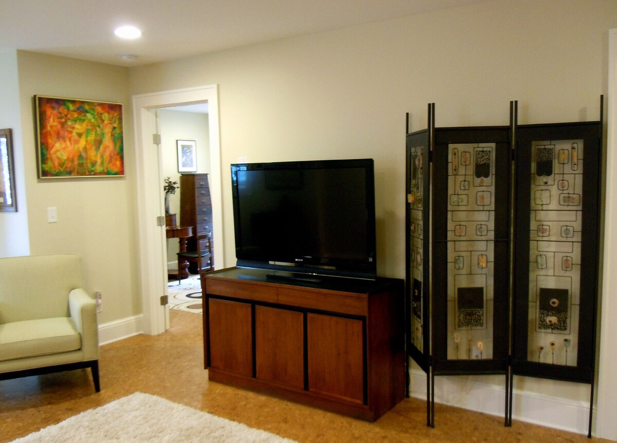 Nestled on a beautifully landscaped corner, our Green Certified, stylish 2700+ square foot Montford home was completed in June of 2015. We are pleased to offer you a one bedroom 650 square foot apartment area located in our ground level. The apartment has a private entrance and off street parking. It offers relaxed comfort with independent climate control and plenty of natural light from large double insulated windows and the secure opaque glass front door. The bedroom is completely private with two windows, ceiling fan, and big double closet. A large open plan living room & food area has a separate dining table along with counter/bar seating, plus a comfortable entertainment area. The large fully appointed bathroom sports a jazzy black & white hexagonal tile floor, granite vanity top, and a shower/tub combo. AMENITIES Independent climate control Double insulated windows and doors Lovely carpets on quiet cork flooring WiFi FOOD PREP AREA Refrigerator/Freezer Washer/Dryer Microwave Portable induction cooktop Toaster oven Granite counter top Coffee maker Pots & pans Stylish flatware, glass and dishware Assorted kitchen gadgets Breakfast foods Coffee, tea, sugar, seasonings, and other staples BEDROOM Brand new luxurious plush queen sized bed Hypoallergenic linens & comforter Large double closet Ceiling fan Two large windows LIVING ROOM Sofa converts to a full sized Bed Comfortable upholstered arm chair Large TV with DVD Player Desk Library of art, history, literature, and local interest books Fun selection of board games BATHROOM Tile floors Granite vanity top Large vanity mirror Unlimited hot water Hair dryer Fully appointed with luxurious towels and basic toiletries OUTDOOR AREA Fenced backyard Wood deck with lighted umbrella table & 4 chairs Tranquil fishpond with waterfall 4 person hot tub Our prices include all fees. No hidden fees.