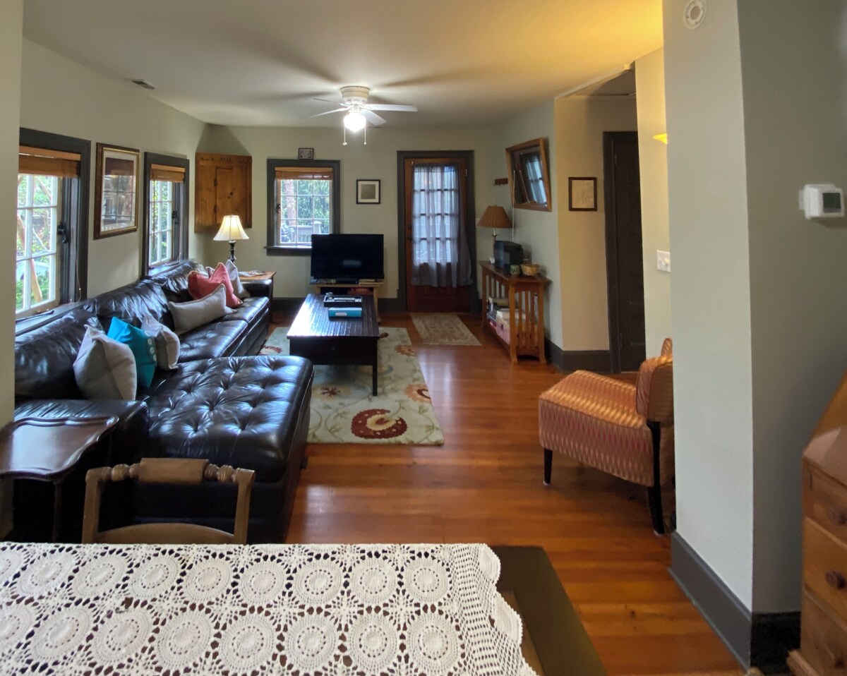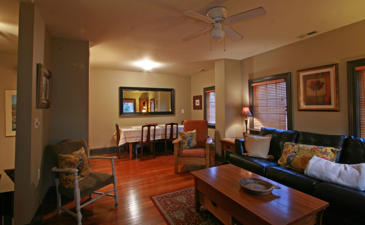 This cozy two-story 1905 Carriage House was renovated over the last 50 years to function as a modern home while retaining historic integrity and charm (the main house burned down in the 70's). This was my architectural design studio while I lived in the cottage next door, during the construction of my new home on the front part of the property about 8 years ago (featured in Fall 2010 Fine Homebuilding magazine). Accessed by a quiet old narrow carriage alley, a short scenic walk to our vibrant downtown, UNCA, and convenient to I-240, yet in the middle of a registered historic neighborhood of lovingly restored homes and B&B's, huge hardwood trees, brick sidewalks and a greenway along a creek. Wood floors and windows throughout, tastefully furnished with leather couch, table for 6, W/D, fully equipped kitchen (incl utensils, pots/pans, cooktop, microwave, etc), (no DW), two sets of linens, comforters, etc., CATV, wireless internet, and all utilities included. 12mb wireless network is private, but shared with the cottage next door. The House is on two levels, with the larger bedroom and bath (with shower) on the lower level (unfinished storage bay makes up the remainder of the ground level), with a door spilling out to the covered stone patio. Other rooms are upstairs, including a second bedroom and bath, with a clawfoot tub, the living area flowing out to a large elevated deck tucked under a mature tree canopy, surrounded by lush landscaping creating privacy and shade. The Carriage House is adjacent to my circa 1940 rental cottage (#431599) 30 day minimum, unless gaps between reservations allow shorter stay, 2 week min. Also within 10 min walk to Wholefoods grocery, Trader Joes, YMCA and yoga studios. Montford has several great neighborhood restaurants, parks, and a historic cemetery. . This is a perfect place to stay while relocating. The driveway from the one-way alley is between two stone walls and is tight, so large SUV's or trucks are discouraged, others require a little patience until you get the hang of it. Parking for three cars is shared with the cottage, so one car each unit is preferred. I live and work on the other side of a lush evergreen hedgerow, in case something needs attention. Our prices include all fees. No hidden fees.