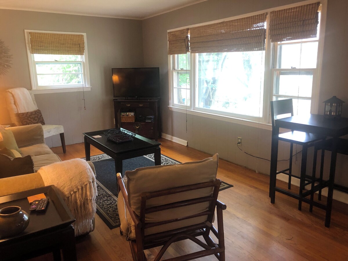 This property is generally a 30 DAY MINIMUM stay per zoning, however, at times I will consider an occasional shorter stay and just block out the calendar for the remainder (only do per 30 day period allowed). Inquire for specific rates/info on any shorter requests. Here is a description: This 2 BR/1BA stand alone house sits on a quiet 1/2 acre lot in the Chestnut Hills historic area. It was originally built in the 1950's as a caretaker cottage for the 6 unit Victorian apartment house in front. It can be accessed from the main driveway to the property or directly from the private alleyway behind (shared with 4 homes - including Servanthood House meditation center - very quiet and peaceful neighbors). Since this home is free-standing, there are no other tenants above or below you - making it a quiet space, in a serene spot with large trees. This is truly an awesome location for enjoying all that Asheville offers! The neighborhood is one of historic homes, mostly built around 1920s or earlier, with several award winning bed-and-breakfasts within a block radius. You can walk to downtown from here (about 1/2 mile away) or get an easy Uber ride. There are also several wonderful restaurants right here in the neighborhood and a full selection of grocery stores within a couple of short blocks (\ /Whole Foods, Trader'Joe's and Harris Teeter about 1-1/2 block). Asheville YOGA Center is 2 short blocks away so it's a great place to stay for their retreats! With all that is so close-by, you don't even need your car in this location. The home is fully furnished and comfortably decorated. Hardwood floors make for charming space and easy care. Each bedroom has a queen bed, with bed linens included. Bath has been updated with vanity and storage. Kitchen is very large with maple cabinets and full appliances (stove, refrigerator, dishwasher, over-the-range microwave, disposal), and all basic dishes, utensils, pots, pans are included - as well as coffee maker, toaster, crock pot, hand mixer, blender... The house has Central AC (not all rentals in the area have central AC due to age of homes). Comfortable living room has a sleeper sofa and other furnishings, plus 40\ s an old basement but does provide the on-site laundry option). This is NOT set up as luxury accommodations. but as comfortable, quaint space that will make you feel like a local and live the true Asheville vibe! We do request that you respect the generally quiet atmosphere of the location and surroundings - no large or loud parties, please. No Smoking. Some quick location info: -Near tons of restaurants, galleries, shops/bookstore, breweries (and some fantastic handmade chocolate shops) -Full selection of grocery within walking distance (Trader Joe ,