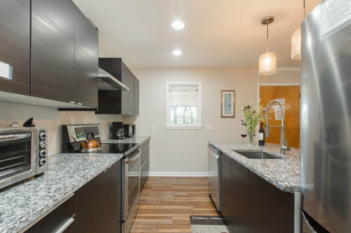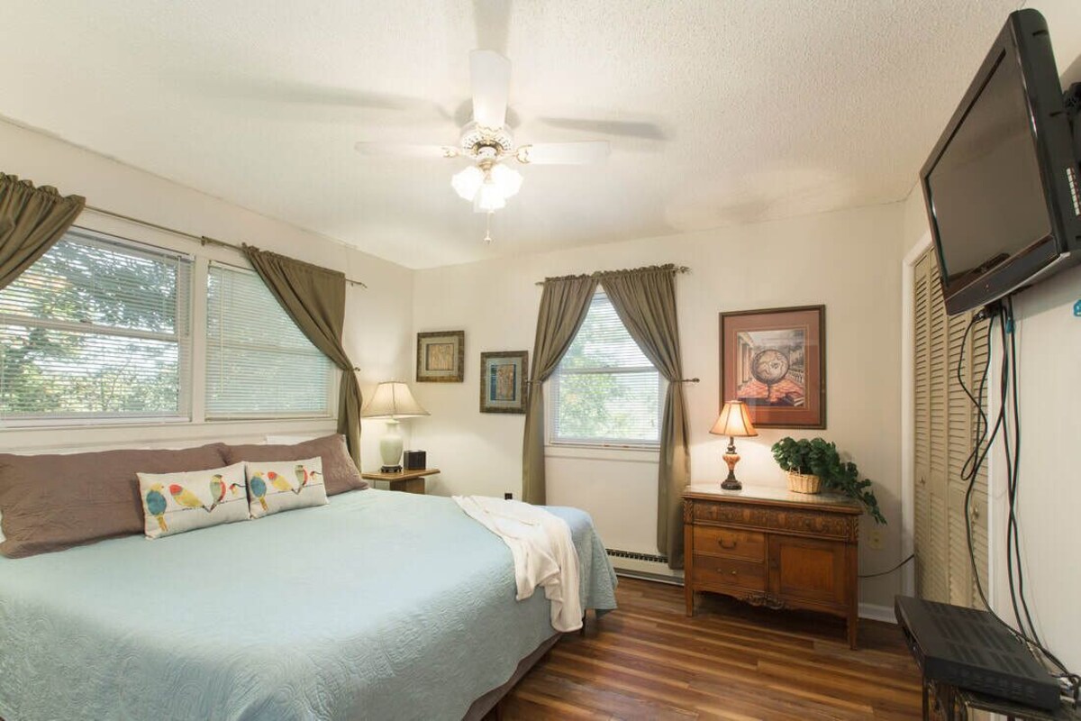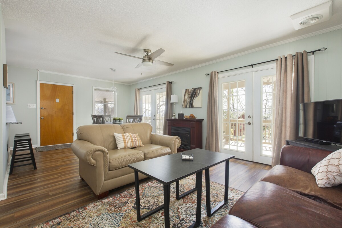 Lucerne Chalet is one of our more spacious downtown Asheville chalets. It has two bedrooms, and one and a half bathrooms, and is conveniently located just FIVE minutes to eclectic downtown Asheville, the South Slope, the River Arts District, the Blue Ridge Parkway, New Belgium Brewery, the Biltmore Estate, and much more. Nestled in the treetops, you can gaze at the mountains from the gated porch and stroll through the quiet neighborhood with your dog. Cozy up to the gas fireplace in the living room. NOTES This property is 1.3 miles from the heart of downtown but we would recommend transportation since it's not walker-friendly. No grill at the house. ALL mountain roads can be steep and dark at times. They may be daunting to an inexperienced mountain driver. The Lucerne Chalet is located in a quiet mountain subdivision on a circular one-lane road. Although it's a short road with street lights, it is tight, steep, and curvy. Please try to plan your arrival during the daytime if you are intimidated by mountain roads. No smoking, vaping, or candles. Must be at least 25 years old to reserve this property. DOG RULES A dog fee applies, plus all applicable taxes. Dog with prior approval. Dogs under 50 lbs. The size and breed of your dog are needed to register them. Please note that you are bringing your dog when making your reservation. 1. No puppies - Dog must be at least ONE YEAR OLD 2. No attack or aggressive breeds of dogs are allowed 3. Must have all shots and flea treatments that are up to date 4. Must always be on a leash and under the control of the owner 5. Must NOT sleep on beds, couches, or chairs 6. You must clean up after your dog and do not flush poop down the toilet 7. A dog fee will be charged for the extra cleaning required 8. Sorry no cats We love dogs and we are happy to host your well-behaved dog. You should also note that this property is managed by a local, sustainable, and seasoned vacation rental team with 20+ years of Five-Star reviews. We provide support and plenty of information before your arrival. We are available during your stay to help out if needed because you are not just booking a home to stay in but a southern mountain hospitality experience. Thank you for considering staying with us! Darlene and Ron Our prices include all fees. No hidden fees.