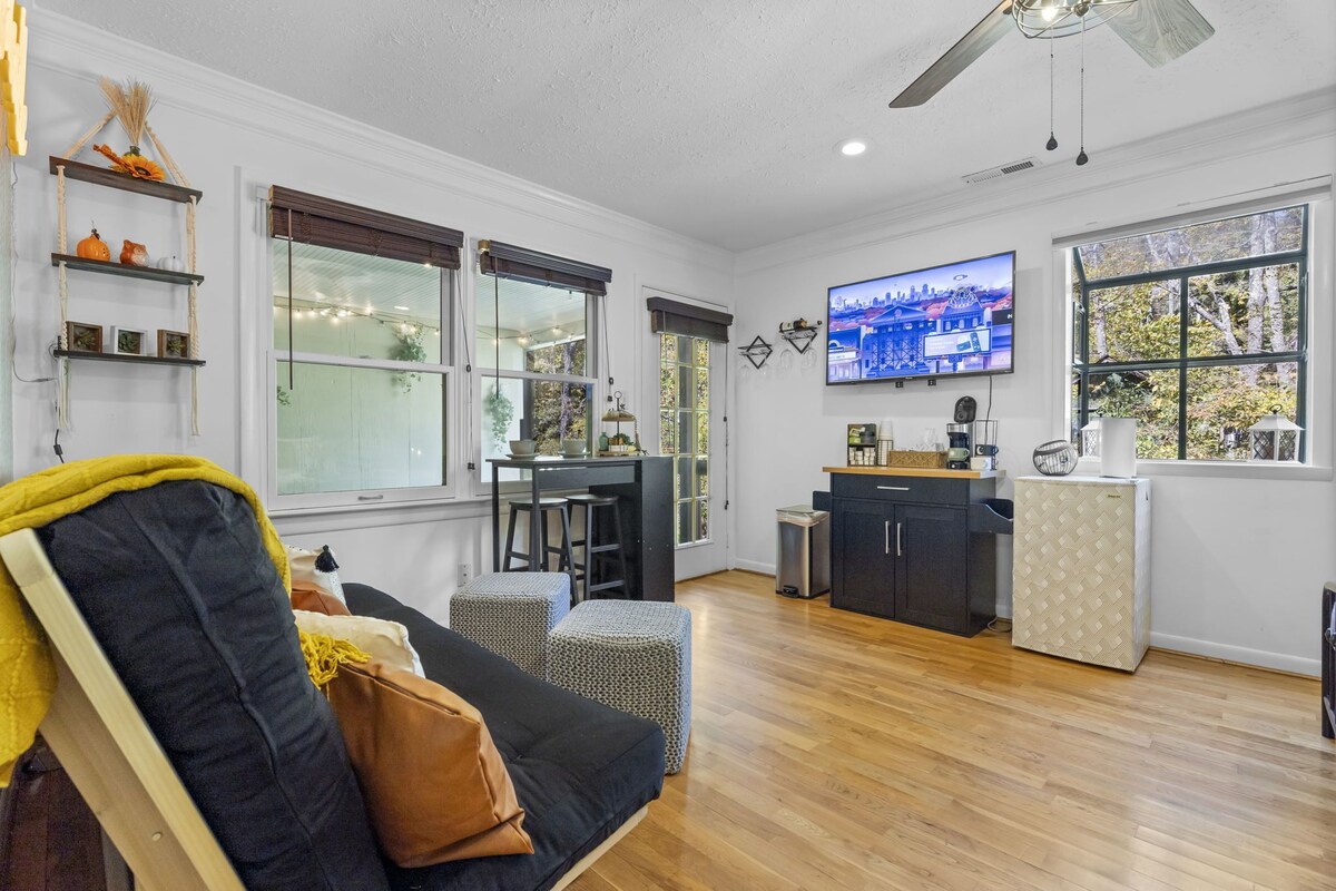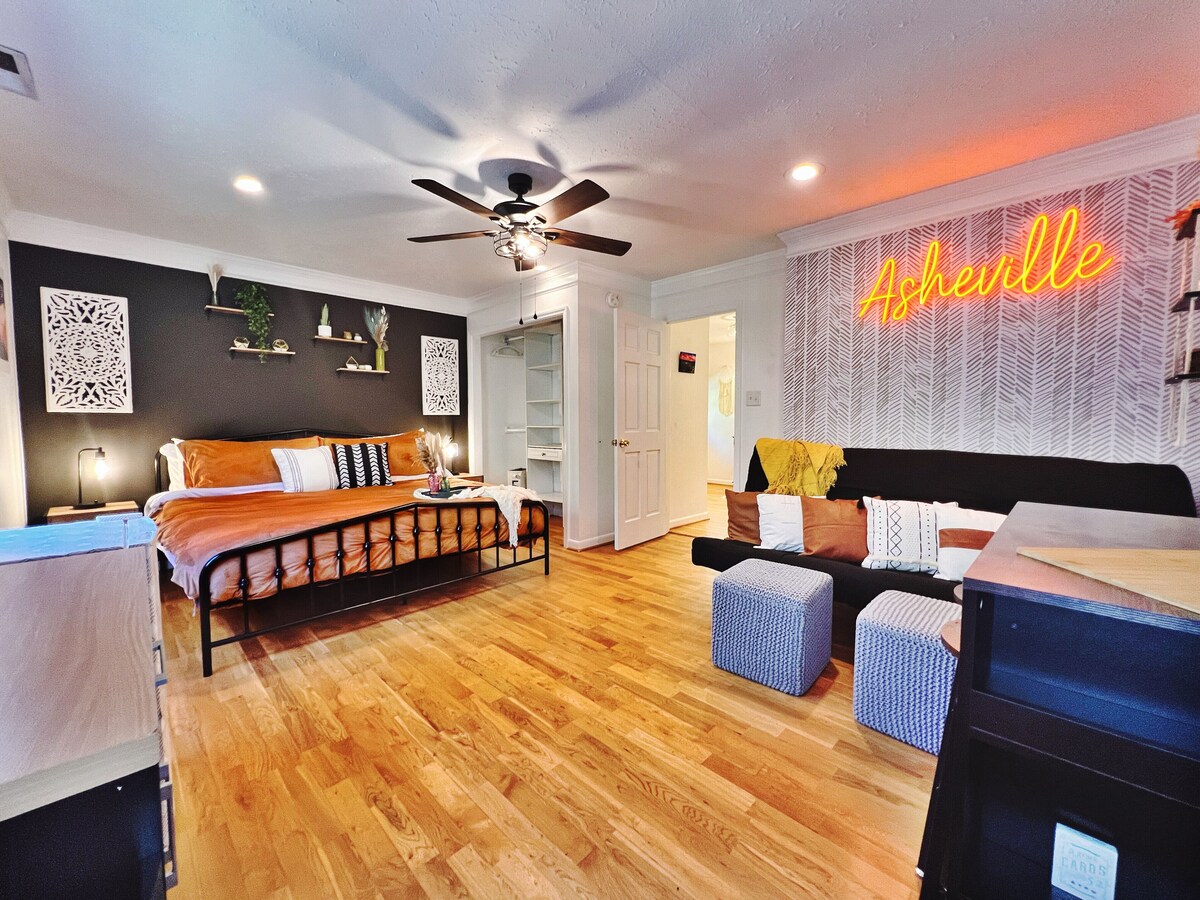 Situated in a quiet residential neighborhood, Asheville Creek is only minutes from downtown Asheville. This is a one bedroom unit attached to our home but is completely sealed off from the rest of the home. You have your own private entrance, bedroom, spacious high-end bathroom and covered patio with firepit and outdoor seating. More enjoyable and private than a hotel! If you decide to bring your pet please let us know. There is a small pet fee. Guest have full access to the hot tub on our newly build covered deck by the pool! Sit back and relax while you listen to Hawk Creek that runs right through the back yard. You can even hear it babbling right from your room. Featuring a king size bed, this room is so spacious you have a sofa couch that turns into a queen size bed, a mini fridge, microwave, coffee bar and a bistro dining set without feeling cramped! Lounge out in your private covered back porch with firepit and listen to the babbling creek behind the house. Then you can saunter over to the pool area where you can watch tv/movies from the hot tub on the newly constructed covered deck with a fire going and lay out on the outdoor couch. Take a dip in the pool from beginning of May all the way through end of September. Don't forget we are dog friendly and encourage you to bring your furry family! Guest have complete access to the hot tub and pool area and back yard. Guest have their own private parking space, private entrance and entire guest suite with private back porch. Please note: this is not a whole house rental. This space is a private room attached to host primary residence. If you have any questions please let us know. Our prices include all fees. No hidden fees.