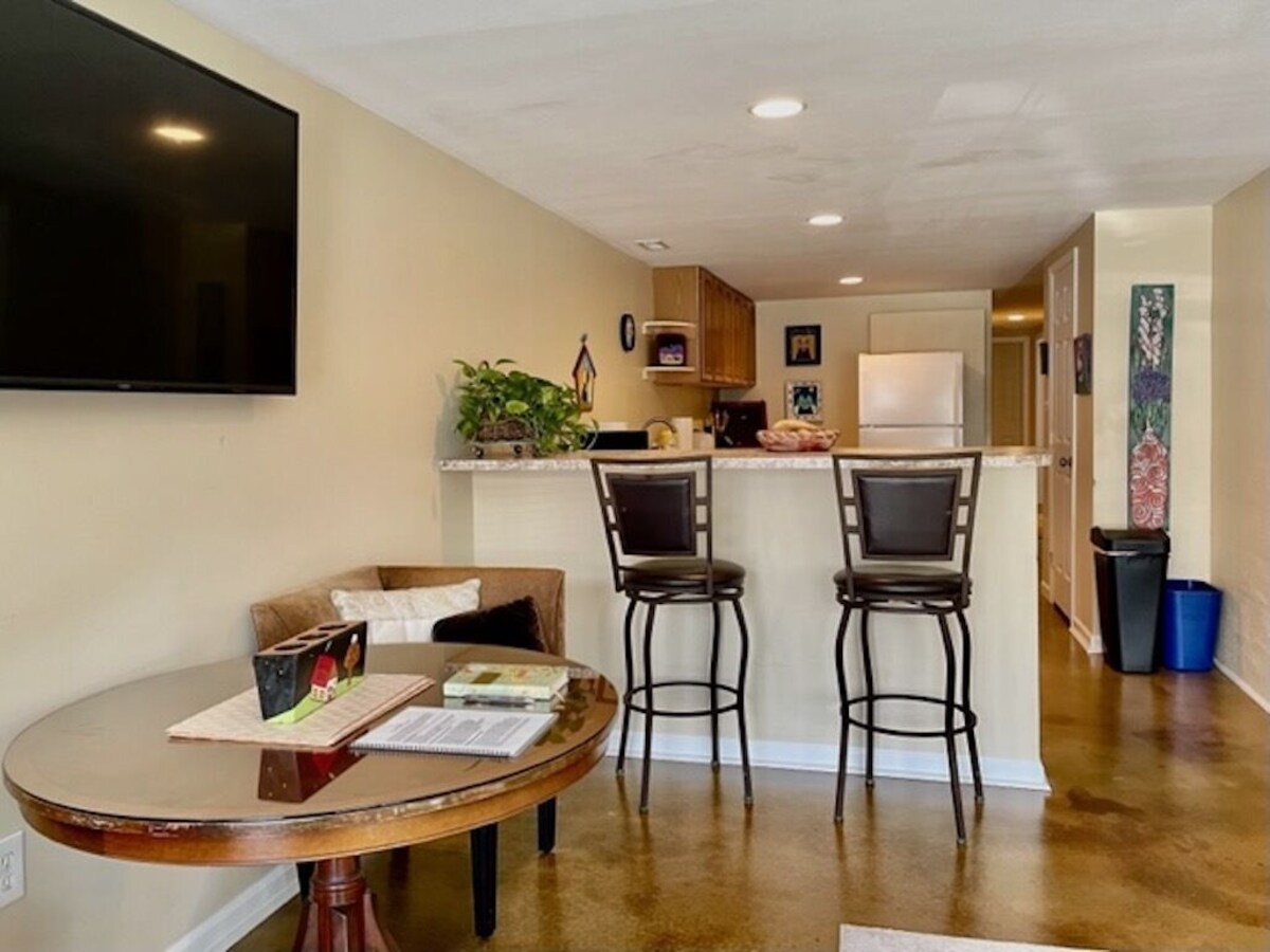 Our house and VRBO unit were not damaged by Hurricane Helene which hit the Asheville area on September 27, 2024. Although we closed the unit for several weeks due to loss of power and water, we have now reopened the unit as of Saturday night, Nov. 30, 2027. All utilities are back on and up and running, including drinkable water, and tv and internet service. Downtown Asheville, with its many restaurants, shops, and other attractions was only minimally impacted by Hurricane Helene and is up and running and welcoming guests. Areas surrounding Asheville are slowly recovering and all major city roads and highways are open. We hope you will consider visiting Asheville soon - your visits and presence here will greatly help in our recovery efforts. With regard to booking our unit, we do not accept one night rentals. We request that guests coming on a weekend book the unit for both Friday and Saturday nights (2 nights)(or Saturday and Sunday nights). Weekends are the most popular time for people visiting the Asheville area and single night bookings limit the number of weekend bookings - therefore, we request a minimum two night booking. This rental is very near downtown Asheville, only 2.5 miles from the Biltmore Estate entrance & close to several Blue Ridge Parkway entrances. Enjoy being able to walk downtown while at the same time being tucked away on a dead end street at the base of Beaucatcher Mountain. The rental can sleep four people and is approximately 1,200 square feet. It has one master bedroom, a large bonus room that serves as a work area, and a living/den area with an open full kitchen layout. As you enter the driveway, the guest entrance is directly next to parking and is easily accessible with no steps. You will enter into the den/living area that has a large comfortable couch, a two seater dining room table, a 55 inch wall-mounted TV, and a kitchen bar with two bar stools. The open kitchen arrangement allows for easy communication with others seated in the living/den area and TV viewing when cooking. There are two windows with blinds in this area which allow for natural light to enter and privacy when the blinds are closed. The kitchen is large with plenty of cabinet storage and countertop space for prepping food. There is a flat top stove/oven combo as well as a full size refrigerator. All the essential cooking items, such as pots, pans, silverware and utensils are provided. There is also a microwave, toaster, blender, a drip coffee maker, and a French press with coffee grinder. The hall from the kitchen takes you back to the full size bathroom, master bedroom and bonus room that serves as a workspace or extra sleeping area. The master bedroom has a queen size bed with comfortable mattress, a chest of drawers, a dresser, a second smart TV, two nightstands and a bench. There is also one window (with a blind) in the bedroom which allows for natural light and privacy, and a closet for hanging plenty of clothes. The bonus room/office has a large size desk serving as a dedicated work space. In this room there is also large sofa, two night stands with lamps, a large chair and another closet for hanging more clothes or storage. The entire rental unit has a beautiful sanded and stained cement floor. There is central air and heat. The large front and back yard are grass, and you likely will see several goats roaming the hillside inside a low voltage electric fenced area behind the rental unit. Guests have the entire private rental that is described and will not have to share space with others. There is a private entrance right next to the guest parking in the private driveway. This unit is an apartment, guest suite style space that is in the lower level of our house where we live. The City of Asheville does not allow full house rentals within city limits. Therefore, this rental is a guest suite that is in the same house as the owners who live upstairs. I love the neighborhood because of the following reasons: 1. The rental is central to everything. The proximity to downtown while still being in a residential neighborhood cannot be beat. All parts of downtown are very accessible from this rental by foot or bike. 2. The rental is only 2.5 miles from the entrance to Biltmore Estate and only 3.5 miles to an entrance for the Blue Ridge Parkway via Town Mountain Road via Martin Luther King Drive. There are several other entrances to the Blue Ridge Parkway within 3-5 miles. 3. The rental unit is also very near many popular stores and restaurants as well as the Asheville Mall, on the other side of Beaucatcher Mountain, which is easily accessible through Tunnel Road (all within 1.5 miles or less). 4. The views in the neighborhood and nearby roof top bars are incredible and there are plenty of places to hike in the neighborhood. There are no mountain views from the rental. However, if you decide to hike in the neighborhood, you will be amazed at some of the views from Beaucatcher Mountain. 5. There are several sports and entertainment areas near the retail unit, including: several play grounds, two stadiums which host a semi pro soccer team and a single A baseball team, a softball field with one disc golf basket, two golf courses, and public tennis courts. 6. Wildlife is thriving for being in a city - I have seen turkey, bear, fox, coyote, and a plethora of birds in this neighborhood. Plus our neighbor has several goats that roam the hillside behind the rental unit (behind an electric fence). They are always fun to watch and feed. You will likely see them from the rental. Our prices include all fees. No hidden fees.