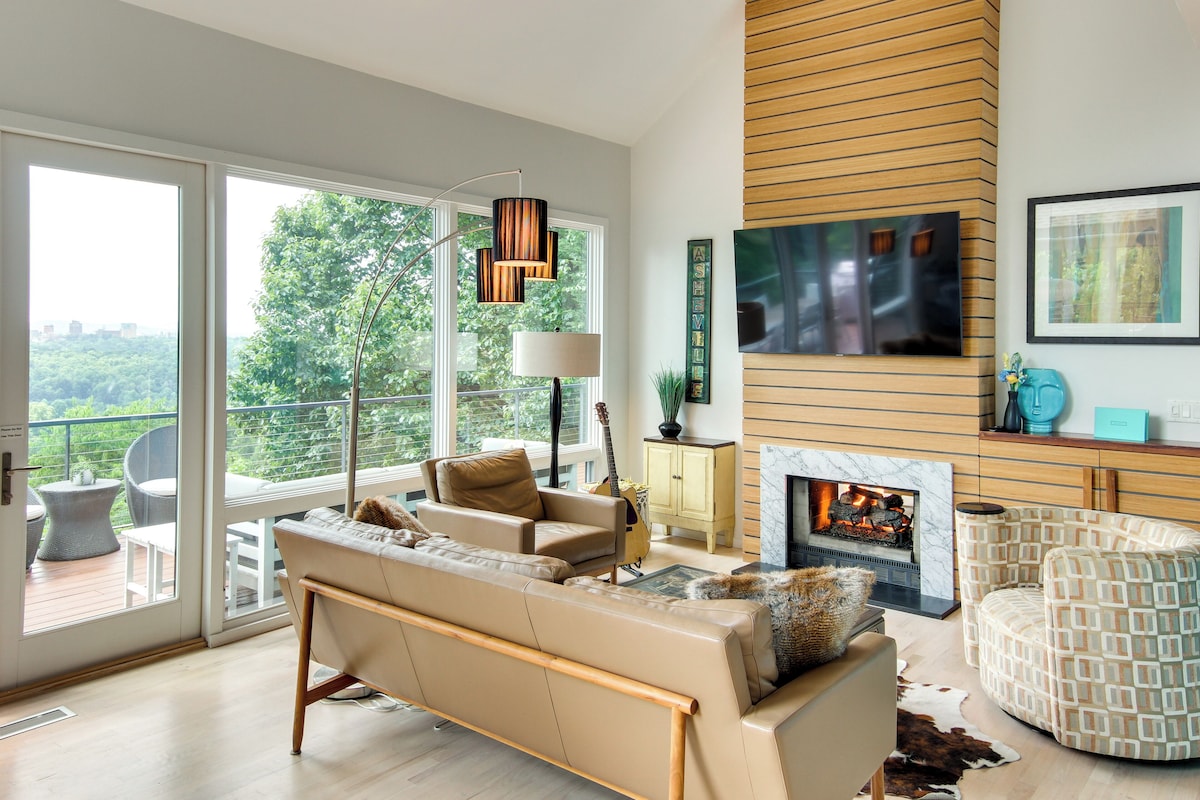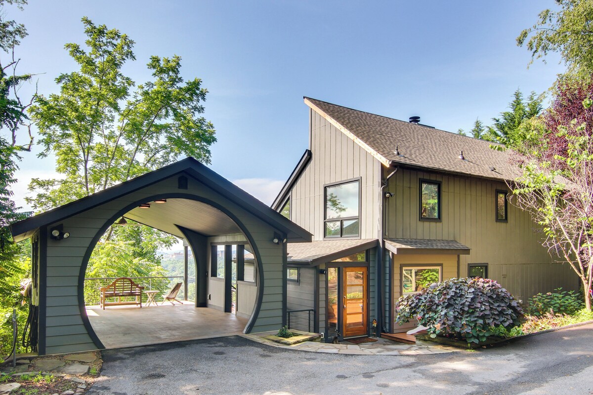 Peaceful, private, and utterly picturesque, this 3-bedroom, 2.5-bath vacation rental hosts a true sanctuary within the bustling confines of city life. Warm up by the fireplace, stretch out on the mountaintop deck, and make yourself at home amongst bright, airy, mid-century modern spaces. However you and your group choose to spend your days — whether it be exploring the Blue Ridge Parkway or art gallery and brewery-hopping downtown — you'll love soaking in the sweeping bird's eye views. -- THE PROPERTY -- Mountain & City Views | Dog Friendly w/ Fee (No Cats) | Walk to UNC | 3 Mi to Downtown Bedroom 1: Queen Bed | Bedroom 2: King Bed | Bedroom 3: Queen Bed HOME FEATURES: 4 Smart TVs, 2 gas fireplaces, dining table, board games, floor-to-ceiling windows w/ mountain views, mid-century modern furnishings, contemporary decor OUTDOOR AMBIANCE: Deck w/ dining & lounge seating, gas grill, covered patio w/ lounge seating, Adirondack chairs, landscaped grounds, hilltop views KITCHEN: Cooking basics, stainless steel appliances, breakfast bar w/ seating, spices, dishware & flatware, toaster oven, Nespresso machine GENERAL: Free WiFi, washer/dryer, towels/linens, hair dryer, heated floors, central heating & air conditioning FAQ: Pet fee $250 (paid pre-trip, dogs only, 2 max, no cats), 2 exterior security cameras (facing out), property on gravel road w/ switchback & no street lights (SUV/4WD & arriving during day recommended), may not be suitable for children (open staircase) ACCESSIBILITY: 2-story home, 3 steps to enter, 2 bathrooms & 1 bedroom on 1st floor, not wheelchair accessible PARKING: Driveway (2 vehicles), carport (1 vehicle) -- THE LOCATION -- DOWNTOWN ASHEVILLE (~3 miles): Asheville Pinball Museum, Asheville Museum of Science, Botanical Gardens of Asheville, River Arts District, Woolworth Walk, Asheville Art Museum, Pack Square Park, Biltmore Estate, Thomas Wolfe Memorial, Basilica of St. Lawrence, Deacon & Martyr OUTDOOR ADVENTURES: Reed Creek Greenway (2 miles), Richmond Hill Park (4 miles), Craven Gap Trail (8 miles), Ledges Whitewater River Park (8 miles), Hard Times Trailhead (13 miles), Bent Creek Trailhead (13 miles) OTHER ATTRACTIONS: University of North Carolina Asheville (0.7 miles), Beaver Lake Bird Sanctuary (2 miles), Grovewood Village (2 miles), Blue Ridge Parkway (7 miles), Western North Carolina Nature Center (8 miles), The North Carolina Arboretum (11 miles) AIRPORT: Asheville Regional Airport (17 miles) -- REST EASY WITH US -- Evolve makes it easy to find and book properties you'll never want to leave. You can relax knowing that our properties will always be ready for you and that we'll answer the phone 24/7. Even better, if anything is off about your stay, we'll make it right. You can count on our homes and our people to make you feel welcome — because we know what vacation means to you. -- POLICIES -- - No smoking - Dog friendly with a $250 fee (+ taxes & fees, max 2, no cats) - No events, parties, or large gatherings - Additional fees and taxes may apply - Photo ID may be required upon check-in - NOTE: This 2-story home requires 3 steps to enter and features a half bathroom, a full bathroom, and a bedroom on the 1st floor. The property is not wheelchair accessible - NOTE: The property is the last house at the end of a one-lane, private gravel road. There is one switchback turn that is recommended drivers take wide (stay to the left), to avoid bumps when coming up the mountain road. There are no streetlights, so it is highly recommended to be checking in during daylight hours - NOTE: Due to Hurricane Helene the Switchback Road is washed out, therefore it is recommended to use an SUV or 4-wheel drive to get to the property safely as a sedan will likely bottom out - NOTE: This property may not be suitable for children due to the open staircase, where crawling infants or new walkers could easily slip through and get hurt - NOTE: Your safety matters. This property features 2 exterior security cameras. Camera 1 is located above the front door facing the front entrance. Camera 2 is in the carport facing the parking area. The cameras are outward facing and do not look into interior spaces. The cameras actively record video and sound Our prices include all fees. No hidden fees.