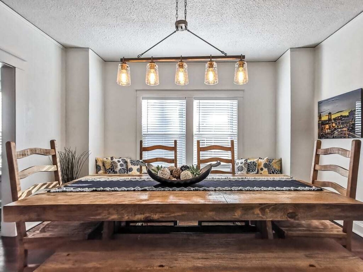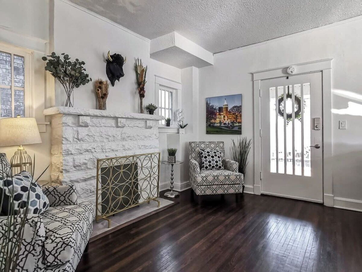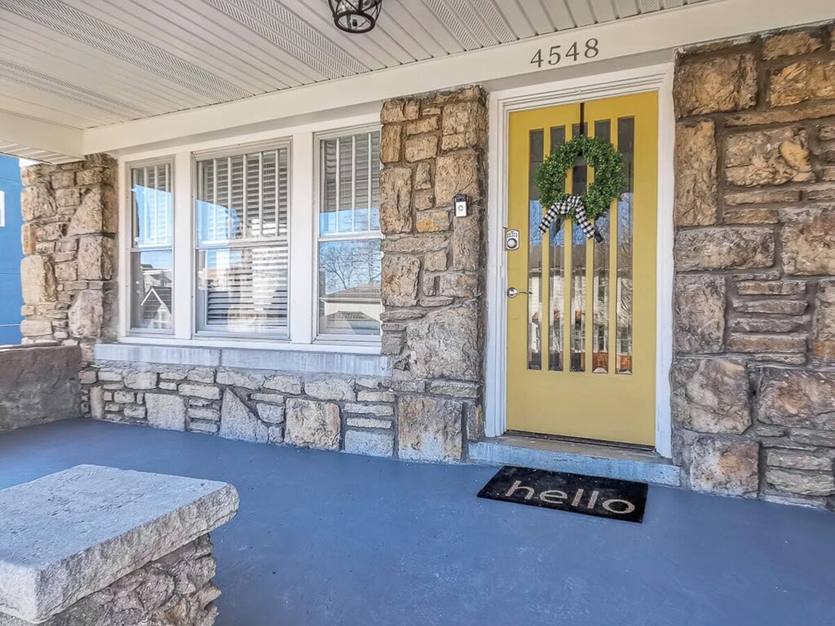 Summary: This house just underwent a major renovation in early 2022 including all new bathrooms, kitchen appliances, paint, flooring and lighting. It is absolutely gorgeous and inviting and the perfect place to call your home away from home! The Space: The living room features many windows, and a 65\ s kitchen. Kansas City themed artwork is sprinkled throughout not letting you forget where you are and celebrates many of the city Smart TV. Services provided are Sling and any app that you enjoy in your own home. High speed internet Wi-Fi is available at no additional charge. The beautiful full-size kitchen is stocked with dishes and appliances if you should choose to make your own meals. Spend your late afternoon sipping your favorite beverage on the front porch and watch passersby walk their dogs to the dog park just 3 blocks west of the home. ***THIS HOME DOES HAVE STAIRS TO ACCESS THE FRONT DOOR. The home is a great get away for family and friends or can accommodate a busy business traveling party who wants to be within easy walking distance of the vibrant night life of the Country Club Plaza. We understand the importance of great hospitality. Please enjoy our home and we will be happy to help with anything throughout your stay! nsd-str-00954 Guest Access: Use of the entire home and driveway. Garage is not available for guest use. The Neighborhood: Designed in 1922, the Country Club Plaza was built as the country's first suburban shopping district. Stroll through it's endless options of stores, restaurants and nightlife. Make sure to stop along the way to admire the art & architecture. Numerous fountains, sculptures and murals make the Plaza a true outdoor art gallery. Other Things to Note: House Rules: *No smoking of any kind in the house, including vaping. *Parties/events/loud noise are not allowed. *Only guests that are on the reservation are permitted on the premises. *Illegal activity is prohibited to include, but not limited to, drug activity, prostitution and illegal possession of firearms. *We only allow pets with responsible pet owners. Pet owners are expected to pick up after their pet, not allow excessive barking. Any pet damage would be the responsibility of the pet owner. *KC Stay may employ the use of video surveillance on the exterior of the home and/or noise detecting technology inside the premises to detect excessive noise levels. *While there is a fireplace in the home, for liability reasons, it is not for guest use. Our prices include all fees. No hidden fees.