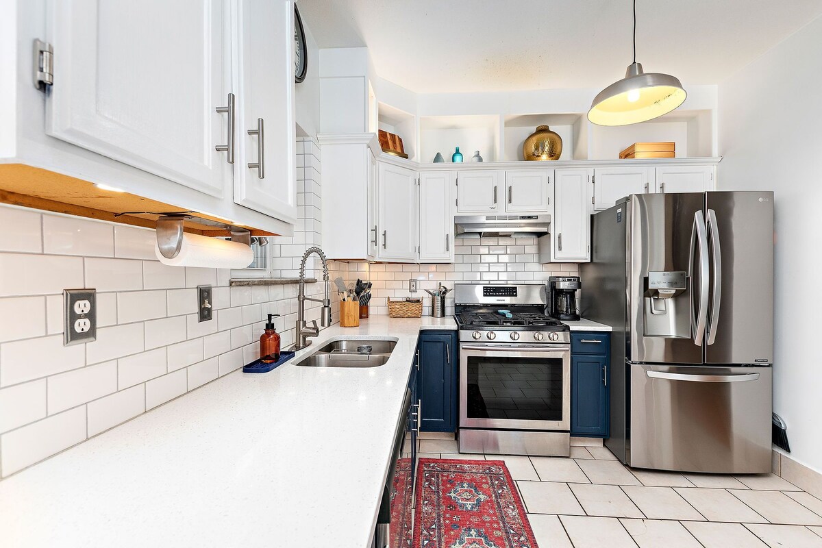 Urban townhouse located in the historic Columbus Park/River Market district of Kansas City! Amazing city views from TWO balconies. A short walk from the eclectic City Market and Streetcar access, as well as many restaurants/bars. Garage parking for one vehicle and driveway parking. (This is a rarity for the area). Our prices include all fees. No hidden fees.