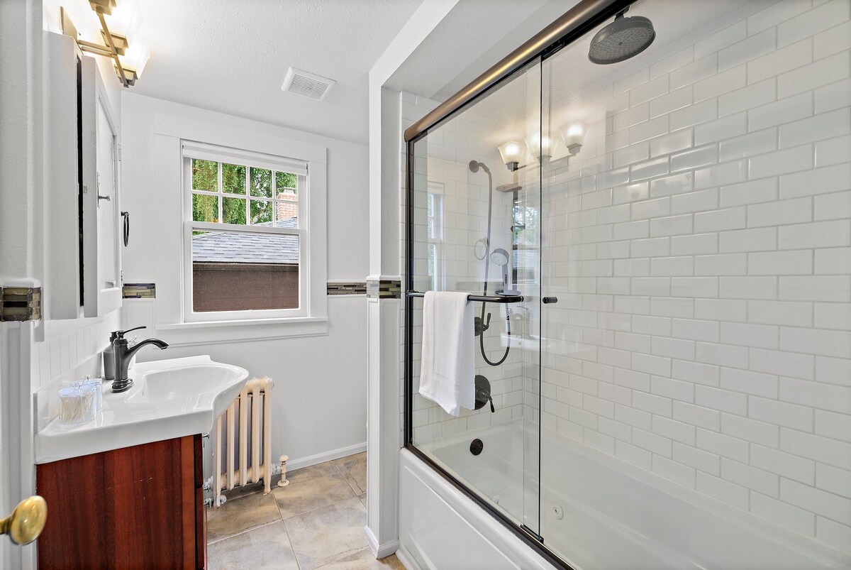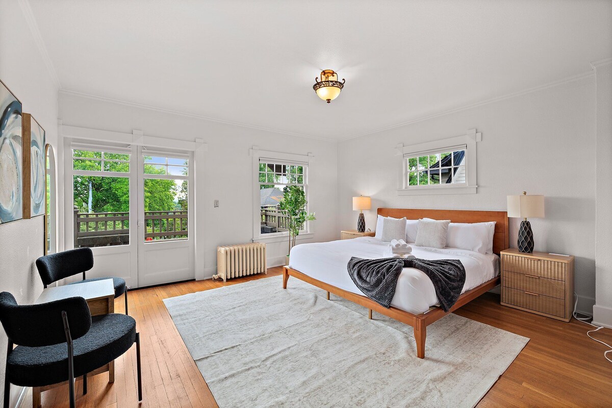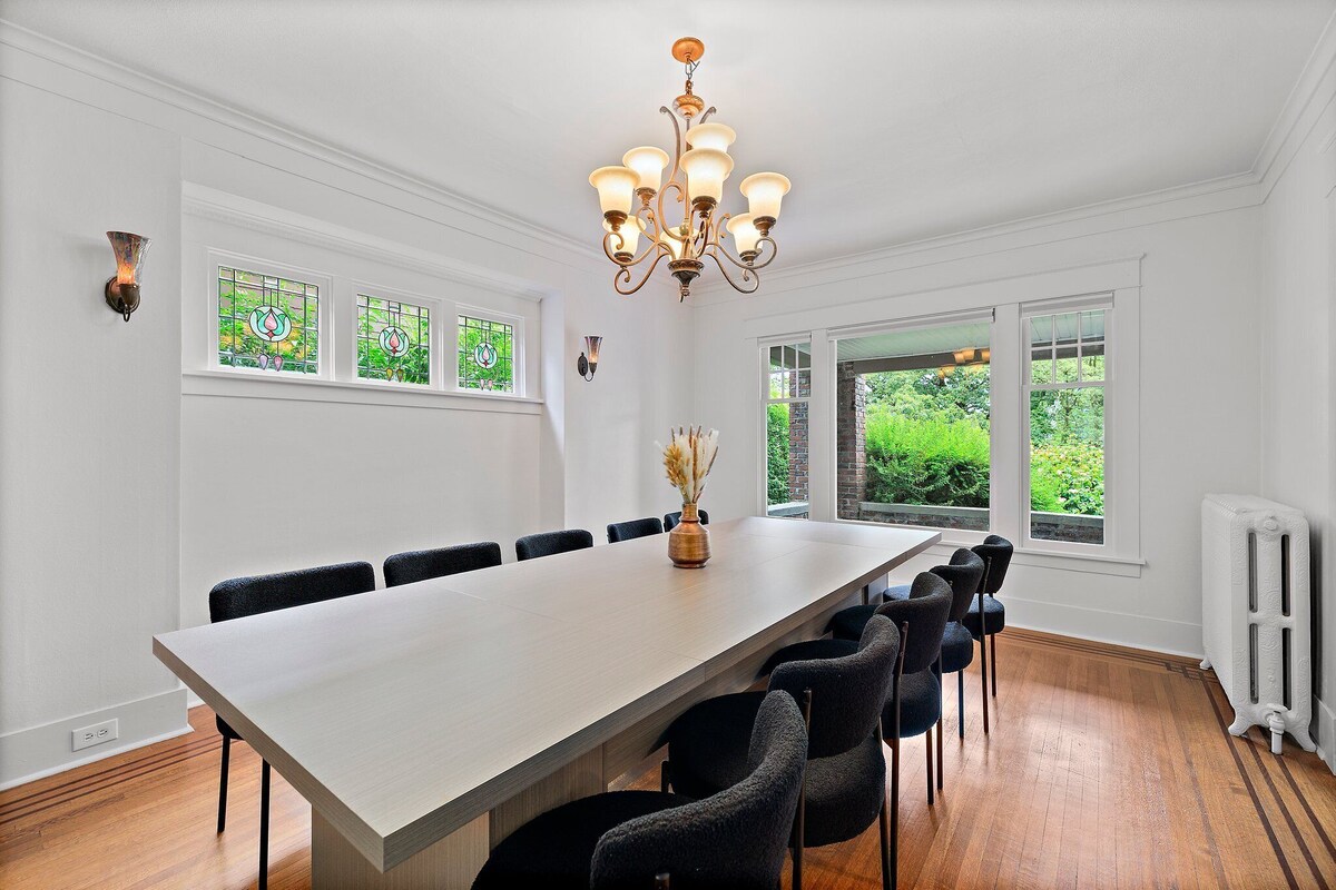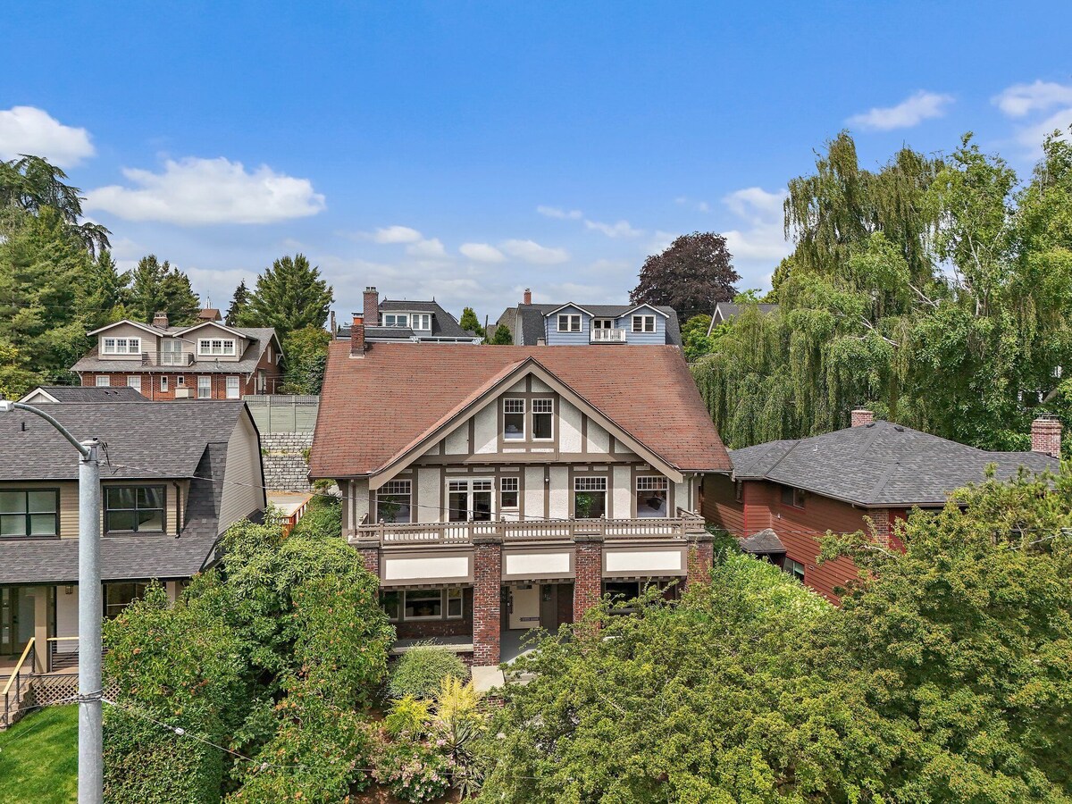 Welcome to this beautifully preserved Craftsman home in the heart of North Capitol Hill, where historic charm meets modern comfort. Perched to capture lovely eastern views of the Cascade Mountains and Bellevue skyline, this spacious retreat is perfect for families, group getaways, or anyone seeking a classic Seattle experience. Step inside to discover rich architectural details—from leaded stained-glass windows and oak floors with mahogany inlay to elegant millwork and a cozy tile fireplace. The space HOME HIGHLIGHTS: - Private home with secure keyless entry - Fully stocked kitchen: Keurig coffee machine, K-Cups, gourmet tea, cookware, utensils, plates, and glassware - 55\ ,