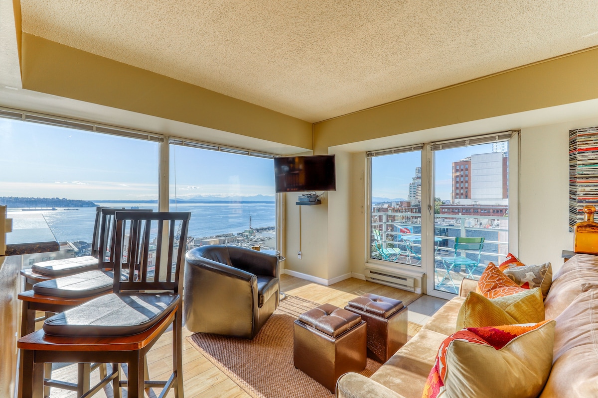 Newmark Tower Soundview Suite Our calendar is updated in real-time & our nightly rates are accurately displayed. Simply enter your desired dates and click 'Book Now!' Make your vacation magical in the Newmark Tower Soundview Suite in the heart of downtown Seattle. Indulge yourself in this deluxe, dog-friendly vacation rental with views of Puget Sound, Pike Place Market, or the sparkling city from every room. Unbeatable location steps from Pike Place Market, the Hard Rock Cafe, Seattle Art Museum, and many more! You can experience the Seattle scene and spend each night at a different local treasure like the Triple Door, Benaroya Hall, or the Showbox. Wake up with a view of the water from the master suite with a king bed and en suite bathroom. You can almost smell the coffee and fresh flowers wafting up from Pike Place Market below. After you spend your day on the waterfront, relax with a glass of wine and the sunset over the Olympic mountains. Allow the glow of the city to lull you into a peaceful night's sleep. In the morning, awaken to coffee brewing in the kitchen and a new day of countless possibilities. This charming vacation rental boasts a Perfect Walk Score of 100! And note that your dogs are also welcome to join you here! If you decide to book this marvelous retreat, you'll be granted access to the shared hot tub and indoor pool available! Things to know: Please note: Our Newmark Tower Condos require personal check-in service, a simple background check, and a legally required rental agreement. If you are bringing a dog on your trip, the pet fee is already included in your quote when selecting ‘Yes’ to pets. If you would like to add more dogs, please contact us. Parking notes: There is parking available for a fee and charges will apply for 1 vehicle. This rental is located on floor 10. Damage waiver: The total cost of your reservation for this Property includes a nightly damage waiver fee, plus tax if applicable (the “Damage Waiver”). (A discount may be applied for stays of 28 nights or longer, if permitted.) The Damage Waiver covers you for up to $3,000 of accidental damage to the Property or its contents (such as furniture, fixtures, and appliances) as long as you report the incident to the host prior to checking out. The Damage Waiver fee eliminates the need for a traditional security deposit. More information can be downloaded from the \ on the checkout page. Due to local laws or HOA requirements, guests must be at least 21 years of age to book. Guests under 21 must be accompanied by a parent or legal guardian for the duration of the reservation. Our prices include all fees. No hidden fees.