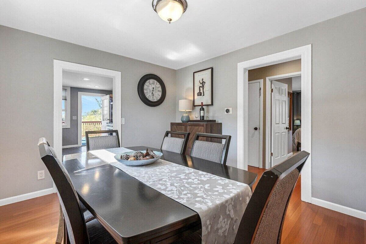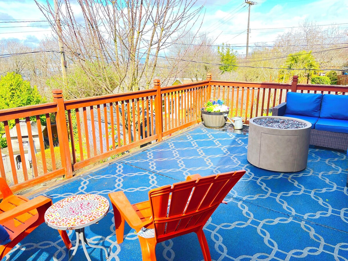 Our cottage style home boasts a spacious remodeled kitchen, family style dining room and large living room. Enhance your Seattle getaway with serene sunset views from the elevated deck. Play outside in the fully fenced and landscaped yard equipped with a barbecue grill, pizza oven, covered patio, fire pit, comfy seating and sparkling clean hot tub. Great location only 10 minutes from Downtown Seattle with nearby freeway access. The host resides locally and is available from 7am - 10pm to assist guests. Our place is centrally located in the city, but in a quiet residential neighborhood. The area offers an urban suburban mix with a lot of bars, restaurants, coffee shops, and quick access to Interstate 5. Check out the Seahawks, Mariners, Sounders, OL Reign or other special events at Lumen Field and T-Mobile park, both just a quick 10 minute drive from the house. Popular Downtown Seattle attractions are a 15-20 minute drive away. Sea-Tac International airport is approximately 20 minutes away by vehicle. The nearby West Seattle Bridge connection makes it quick and easy to head out to popular Alki Beach, or visit the year round West Seattle Farmers Market on Sundays. You can get to Lake Washington, Downtown, Georgetown, the Museum of Flight and so much more very quickly. Jefferson Park and Golf Course is right here in our immediate neighborhood. Other nearby parks include Mt Baker Beach, Genesee Park and Stan Sayres Park and Boat Launch. Guests will have access to the entire upstairs areas of the house and the entire yard. The basement is an unfinished area of the house, and is locked and off limits to guests. Come on in from the covered porch into the foyer area where you can kick off your shoes and hang your coats. Beyond the foyer is the spacious living room with 65\ ll find outdoor furniture to soak up the spectacular sunset views. The interior areas are all on one single level, with a sloping downgrade as you enter the backyard from the side gate on the exterior. The location has many nearby public transportation options. *** Due to the sloping topography of the yard, access to the backyard and hot tub is through the exterior gate on the side of the house. There is no direct access to the hot tub, backyard or laundry area from the house. *** The hot tub is available to guests year round. It is situated next to the covered patio, but is not covered from above to protect from weather elements during use. *** Two window air conditioning units are included for your stay during warm weather months. They are located in the King bed bedroom and in the kitchen. During cool weather seasons, the window A/C units are removed and stored away in an area inaccessible to guests. *** The home is not equipped with central air conditioning. *** Well-trained dogs are welcome here! Maximum of 2 dogs. Please let us know about your dogs in your booking message. A $75 fee for one dog is required, and $50 for a second dog. We apologize, but cats or other pets cannot be accommodated. *** The pet fee applies to all dogs, with the exception of a Service Animal trained to perform a task directly related to a person Emotional support animals”, “therapy dogs”, and “comfort animals” are not individually trained to do work or perform tasks for the benefit of an individual with a disability, and therefore are not defined by WA State Discrimination Law to be a Service Animal. *** The hot tub is serviced weekly. The technician will enter the backyard through the exterior gate and does not need to interact with guests. Our prices include all fees. No hidden fees.