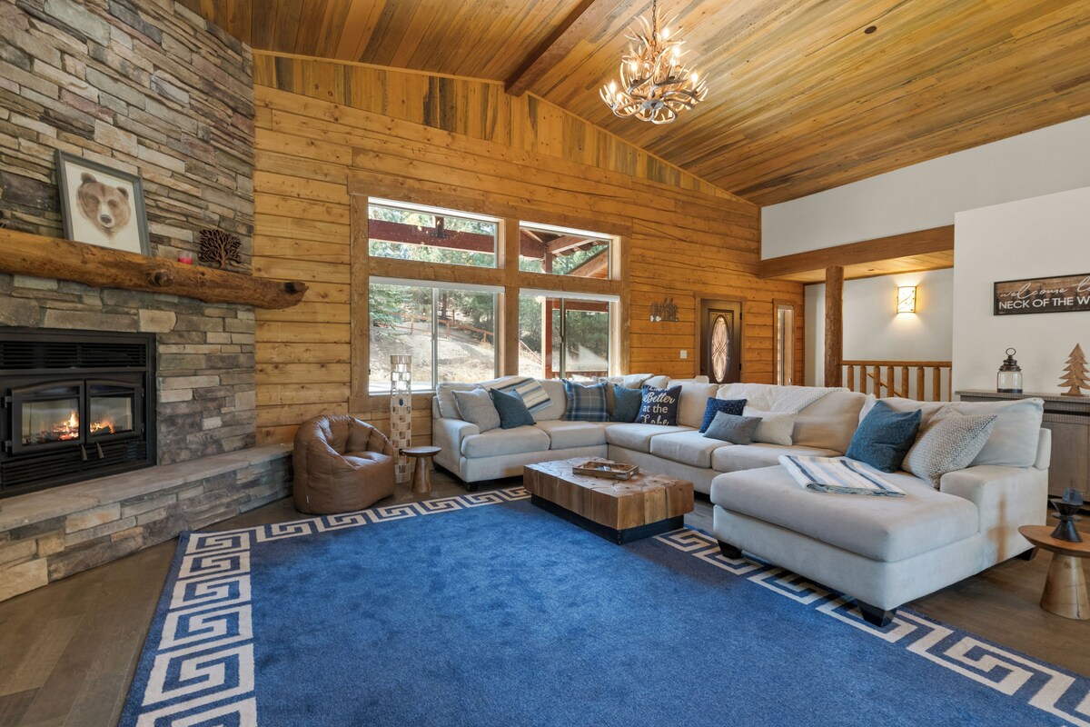 BRAND NEW PROPERTY w/ ALL 5 STAR REVIEWS!! Nestled in the heart of the San Bernardino National Forest, MAJESTIC PINES MANOR @ CASTLE GLEN ESTATES is a BRAND-NEW VACATION RENTAL, COMBINING MOUNTAIN LIVING WITH MODERN LUXURY! LOCATED IN THE HIGHLY SOUGHT-AFTER CASTLE GLEN ESTATES AREA, SURROUNDED BY TOWERING PINE TREES, you'll feel completely immersed in nature, while enjoying all the high-end amenities you would expect to find in a modern, luxury home. CONVENIENTLY LOCATED NEAR ALL OF THE BEST THAT BIG BEAR LAKE HAS TO OFFER, JUST 2 MILES FROM SNOW SUMMIT RESORT, 1 MILE AWAY FROM BIG BEAR SNOW PLAY, 3 MILES TO BIG BEAR VILLAGE, AND A STONES THROW FROM THE LAKE'S SHORE AND THE FAMOUS ALPINE PEDAL PATH! STEP INSIDE TO DISCOVER THE MASSIVE OPEN CONCEPT GREAT ROOM; THE HEART OF THE HOME! The grand and expansive room flows seamlessly, offering a perfect blend of living, dining, and cooking areas. VAULTED CEILINGS, and large windows throughout the space let in tons of light, making the room feel like a natural extension of the surrounding wilderness. The room’s HUGE SECTIONAL SOFA is designed for comfort and gathering, offering plenty of seating for family and friends. The FLOOR-TO-CEILING STACKED STONE FRIEPLACE, and GIANT 85\ S DREAM! The centerpiece of this area is THE HUGE KITCHEN ISLAND, which serves as both a functional workspace, and social hub, with ample seating for guests to gather around while you cook. The island provides both prep space, and a convenient spot for informal meals, conversation, or enjoying a glass of wine. Boasting custom cabinetry, granite countertops, high-end finishes, stainless-steel appliances, and a double oven, the homes kitchen is both luxurious and highly practical. THE KITCHEN SEAMLESSLY WITH THE OPEN-CONCEPT LAYOUT, allowing you to enjoy the beauty and functionality of the space, while remaining connected to the rest of the home. METICULOUSLY STOCKED WITH EVERYTHING YOU COULD POSSIBLY NEED, you won’t have to go without essential appliances like a crock pot, rice cooker, toaster, blender, mixer, juicer, and NutriBullet. The kitchen is equipped with both a Keurig and traditional drip coffee pot, with coffee and filters also provided. An ample amount of typical kitchen items, from pots and pans to mixing bowls and measuring cups means that you will be prepared to cook any meal, big or small, in this extremely well stocked kitchen. (Private chef referrals available upon request.) The dining area features a large, elegant dining table with seating for 10+, a perfect place for family meals, holiday gatherings, or hosting friends. The dining table is positioned just adjacent to the kitchen, which makes serving meals easy and convenient. The dining table is also strategically located to take full advantage of the panoramic forest views! STEP OUT ONTO THE HOME ,