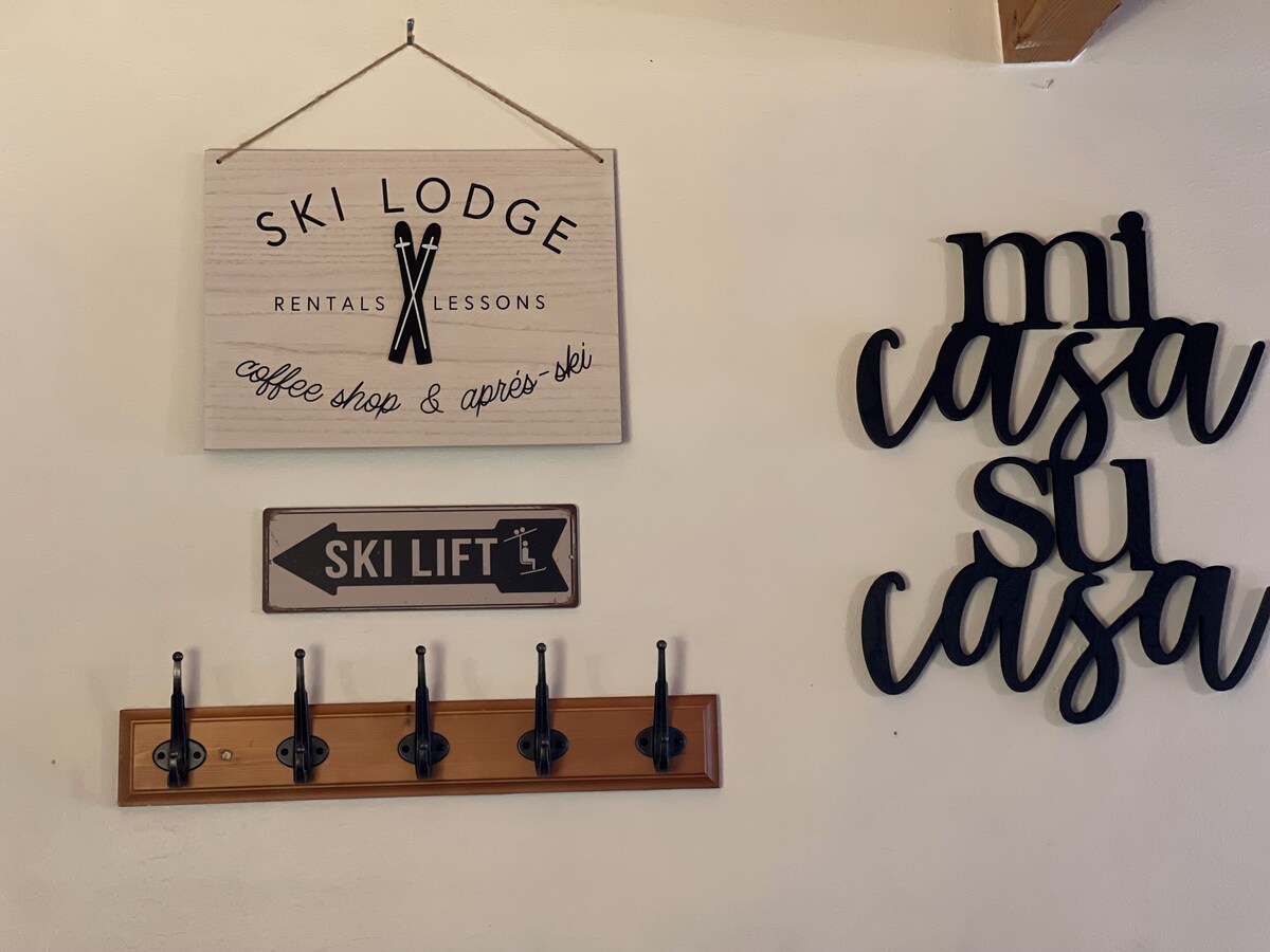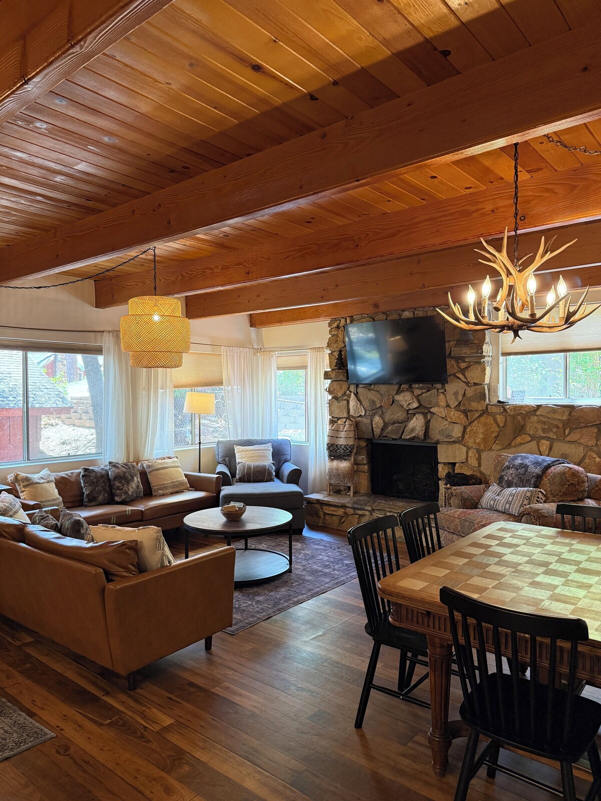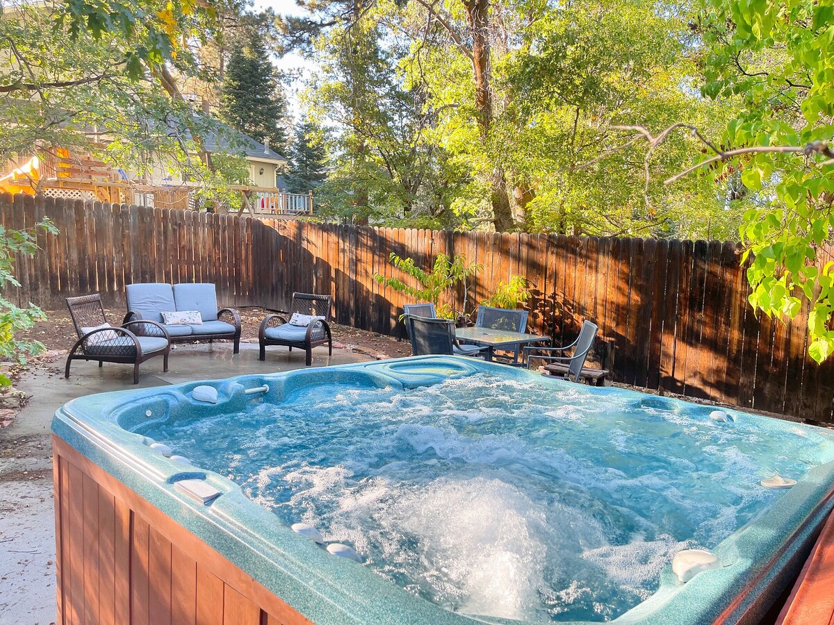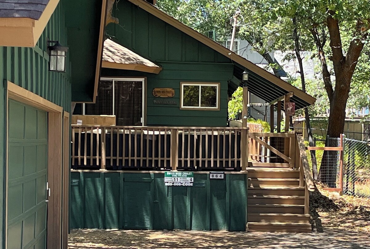 Tucked away on a cozy cul-de-sac street, just steps away from the National Forest, Swiss Miss Chalet is a bright and airy 1960’s cabin with a traditional vintage/modern Swiss Chalet style. Much of the cabin’s original vibe was maintained with decor, art work, some curated vintage furniture and additional modern touches were added throughout. The home contains original wood beamed ceilings, wood shutters, wood details and stone gas fireplace which compliments the comfortable mid-century modern-rustic decor. Perfect for friend groups, families, couples, furry companions etc., we are excited to share our little slice of heaven with you no matter the size! Featuring: - tri-level home with fully fenced backyard. - open floor plan with living room/dining area/kitchen all connected. - large dining table: seats 11 with pull out leaves. - great high speed WI-FI throughout the home; perfect for those that need to work remotely. - - five bedrooms, three full bathrooms(two newly updated). - game room & den - fully equipped and updated kitchen: dishwasher, stove, refrigerator, microwave, toaster, stand mixer, Keurig coffee machine, french press, instant pot, plenty of pots/pans/baking sheets, place settings, utensils, knives, cutting boards, spices, coffee, tea and hot chocolate.. -Sliding door with access to the deck/wrap around front deck. -6 Smart TVs with Roku for streaming Amazon, Netflix etc. -DVD player -clean linens, towels & washcloths -premium mattresses & bedding, -basic toiletries provided -iron & board -hairdryers -infant co sleeper/pack and play -standard pack and play crib -children's high chair -children's snow gear and sleds Bedroom 1/Master: - first floor with cozy Casper king hybrid mattress -attached full size newly remodeled ensuite bath with soaking tub - newborn/infant co-sleeper pack and play located in the closet; an additional one is located in the closet of one of the second floor bedrooms. Bedroom 2: -full size sofa sleeper -40 inch smart TV -located on the first floor -fun place for the kiddos with plenty of games, toys, Wii controller, doll house and a teepee tent! Bedroom 3: -located on the second floor -king size bed with Casper hybrid mattress -additional twin bed -40 inch smart TV -pack and play portable crib located in the closet Bedroom 4: -located on the second floor -queen size bed -additional twin bed Bedroom 5: -located on the third floor this room -queen size bed with a new Casper hybrid mattress -full size futon sofa bed. -portable air conditioner for those warm summer days. Laundry room: -new full size washer and dryer Game room: -cozy sectional sofa seating -pool table -electronic dart board, -GIANT Jenga, -GIANT Connect Four -board games -poker - cards -smart TV -arcade Game Table -table air hockeY -billiards -foosball! Outdoor amenities: -large wraparound front porch -large outdoor sectional coach -gas BBQ grill -propane fire table -fully fenced backyard -jetted hot tub -additional outdoor seating -corn hole game -hammocks * PLEASE NOTE WE DO NOT PROVIDE PROPANE * There is a propane tank attached to the BBQ, which we do fill up regularly. You are welcome to use whatever propane is available. However, if you need more than what is available to you, will need to bring your own tank or fill ours at the local DIY center or the 76 gas station on the corner of Georgia St/Big Bear Blvd. HEATING: There is central heating throughout the home, additionally there are also space heaters in each bedroom. The thermostat is set to 72 degrees during the winter months. Please contact owner if you feel it is too warm or too cold and we will happily adjust the temperature as needed. -COOLING: Please note, there is NO air conditioner in the cabin (most homes in Big Bear do not have air conditioning). There are ceiling fans in many of the rooms and portable fans provided in every room. Mountain weather is generally 20-30 degrees cooler than other communities. It generally cools off to the the 50s at night in the summer months. In the late afternoon We encourage you to open all windows and turn on the fans to circulate the air. -POWER OUTAGES- Big Bear is a remote, mountain location. From time to time there are power outages. This doesn’t happen often but it does happen. Typically power is restored within an hour or two. For your convenience, the cabin is equipped with 4 battery operated lanterns and 3 flash lights. These are located in the cabinet next to the front door. We do our best to ensure guests are prepared during these unforeseen circumstances, however we do not refund or provide credit should a power outage occur. -MOUNTAIN INSECTS AND ANIMALS– Big Bear is a mountain community located in a forest. Animals you may encounter are mice, woodpeckers, raccoons, squirrels, gophers, bears and bats, among others. From time to time guests will come across one of these animals either alive or dead, inside the home or outside the home. Common insects include ants, spiders, moths and flies. Insects can move very quickly when a home is left empty, even overnight and spider webs, dead insects or live ants are possible. We inspect every home prior to your arrival but cannot guarantee the home will be free of pests. Credits will not be given to any tenant if an animal is found on the premises or near the premises alive or dead or if there are some insect issues. Please contact us immediately if you encounter an issue and we will do our best to resolve it. Our prices include all fees. No hidden fees.