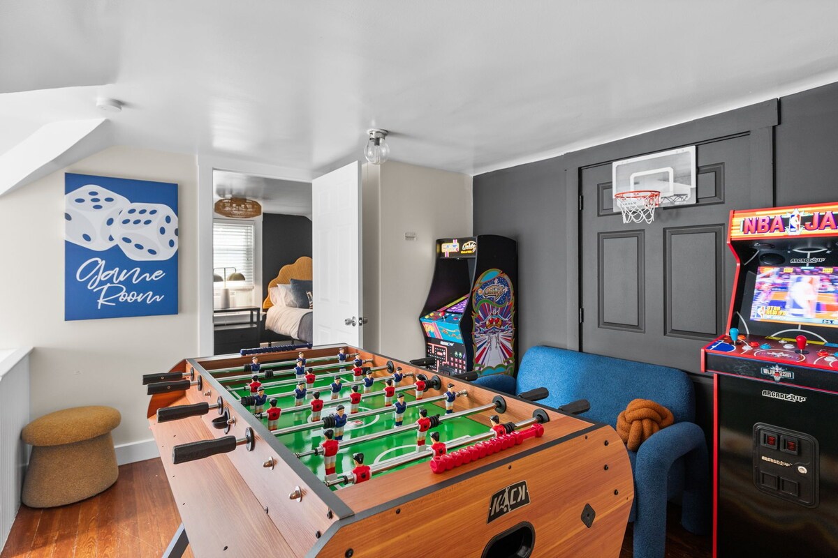 Welcome to our home—your three-story getaway designed for comfort, fun, and connection. Whether you're here with family or friends, there's plenty of room to relax, play, and make memories. Here’s what you’ll find inside: Bedrooms: Bedroom 1: 1 King bed Bedroom 2: 1 King bed with ensuite bath and crib Bedroom 3: 1 Queen bed Bedroom 4: 2 Queen beds plus a kid’s nook with tent and books Bedroom 5: 2 Queen beds Bathrooms: 1 full bathroom on the main level 2 full bathrooms upstairs (one with a soaking tub, one with a walk-in shower) Kitchen: Fully stocked with modern appliances, a dishwasher, coffee makers, and a toaster—perfect for everything from morning coffee to family meals. Living Room: A cozy gathering space to stream your favorite shows, read, or enjoy quality time together. Dining Room: Seats a crowd and is stocked with board games, cards, and poker for after-dinner fun. Game Room: Arcade games, foosball, air hockey, and a pool table—nonstop entertainment for guests of all ages. Backyard: Relax in the hot tub, enjoy meals at the outdoor dining area, gather around the fire pit, or watch a movie under the stars with our portable projector. Yard games like cornhole, ladder golf, and giant Jenga add even more fun under the string lights. Whether you're reconnecting, celebrating, or just unwinding, we’re excited to share our home with you and hope it’s the perfect place to make lasting memories. Our prices include all fees. No hidden fees.