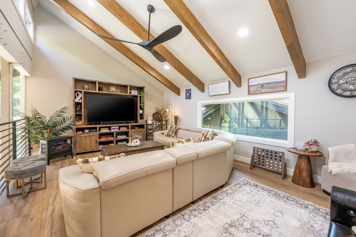 Step into the inviting great room with soaring vaulted ceilings, a cozy fireplace, and mountain-inspired design. The fully equipped kitchen opens to a spacious dining area, ideal for group meals or holiday feasts.