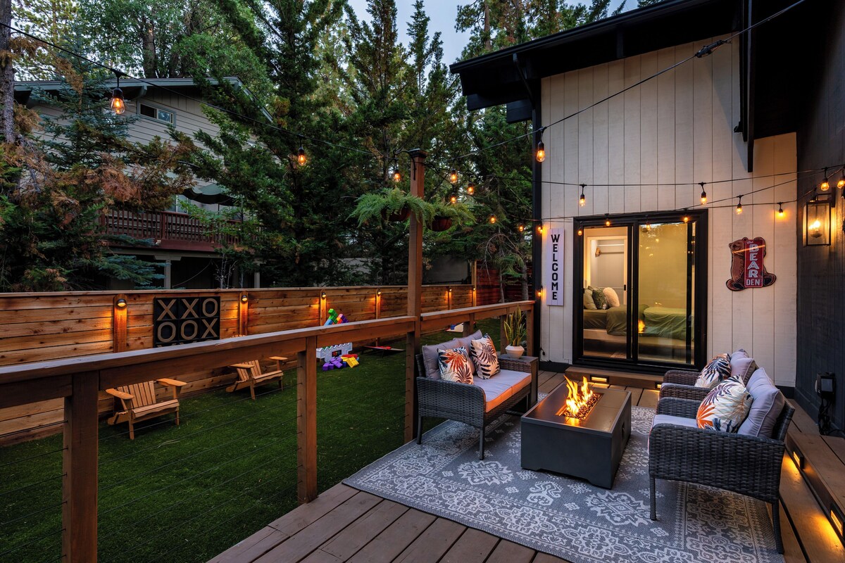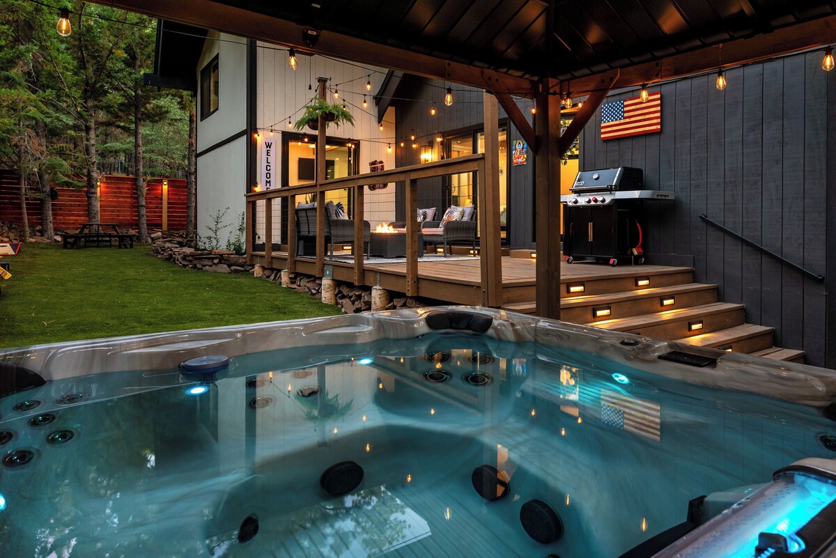 Out back, relax under the stars in the private hot tub, relax around the firepit, or lounge on the large deck surrounded by pines. Four of the five bedrooms include private en-suite bathrooms for added privacy and comfort.