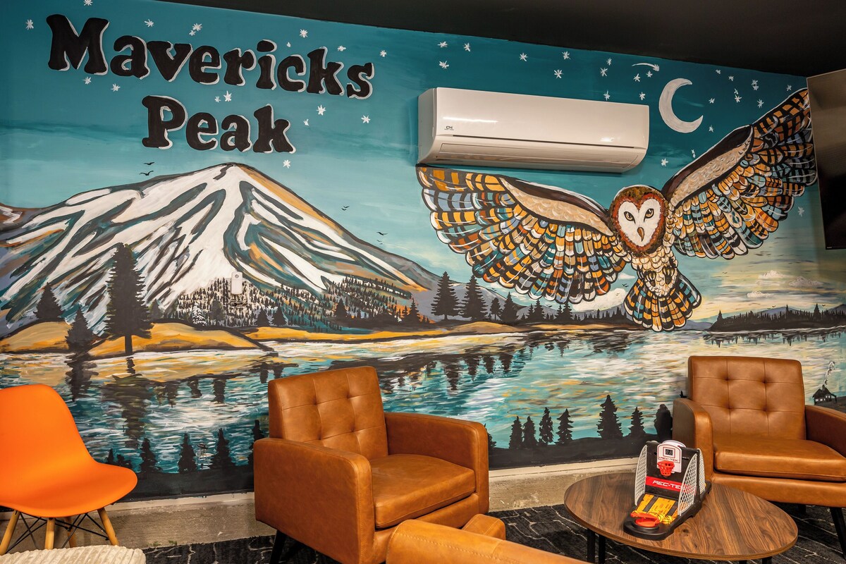 Downstairs, the two-car garage has been transformed into a vibrant game room featuring a mural, foosball, board games, and more—perfect for both kids and adults to unwind after a day of adventure.