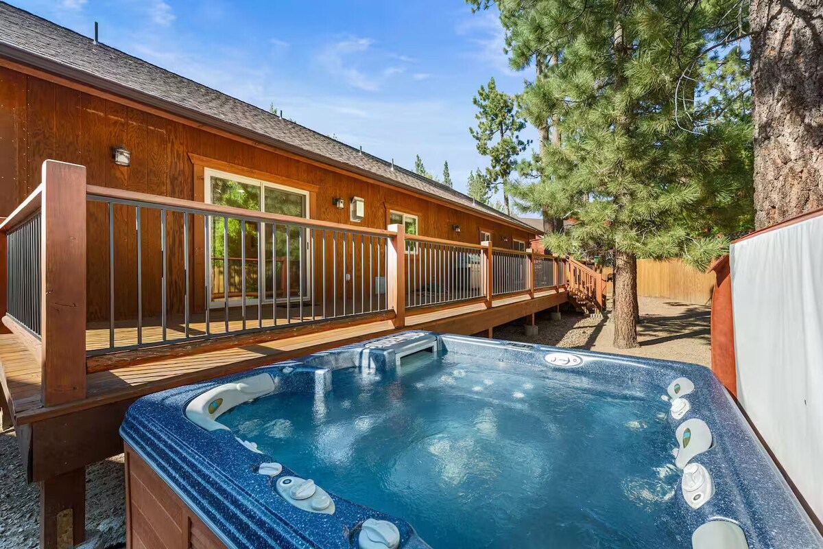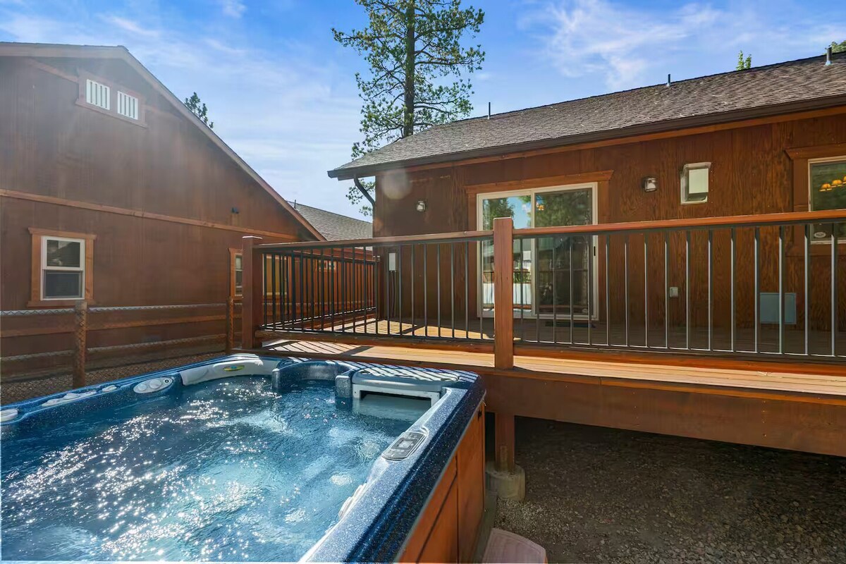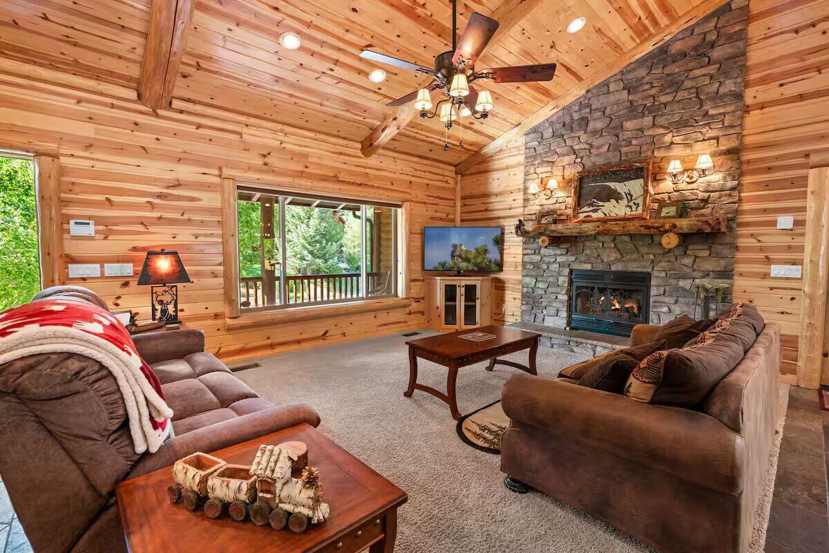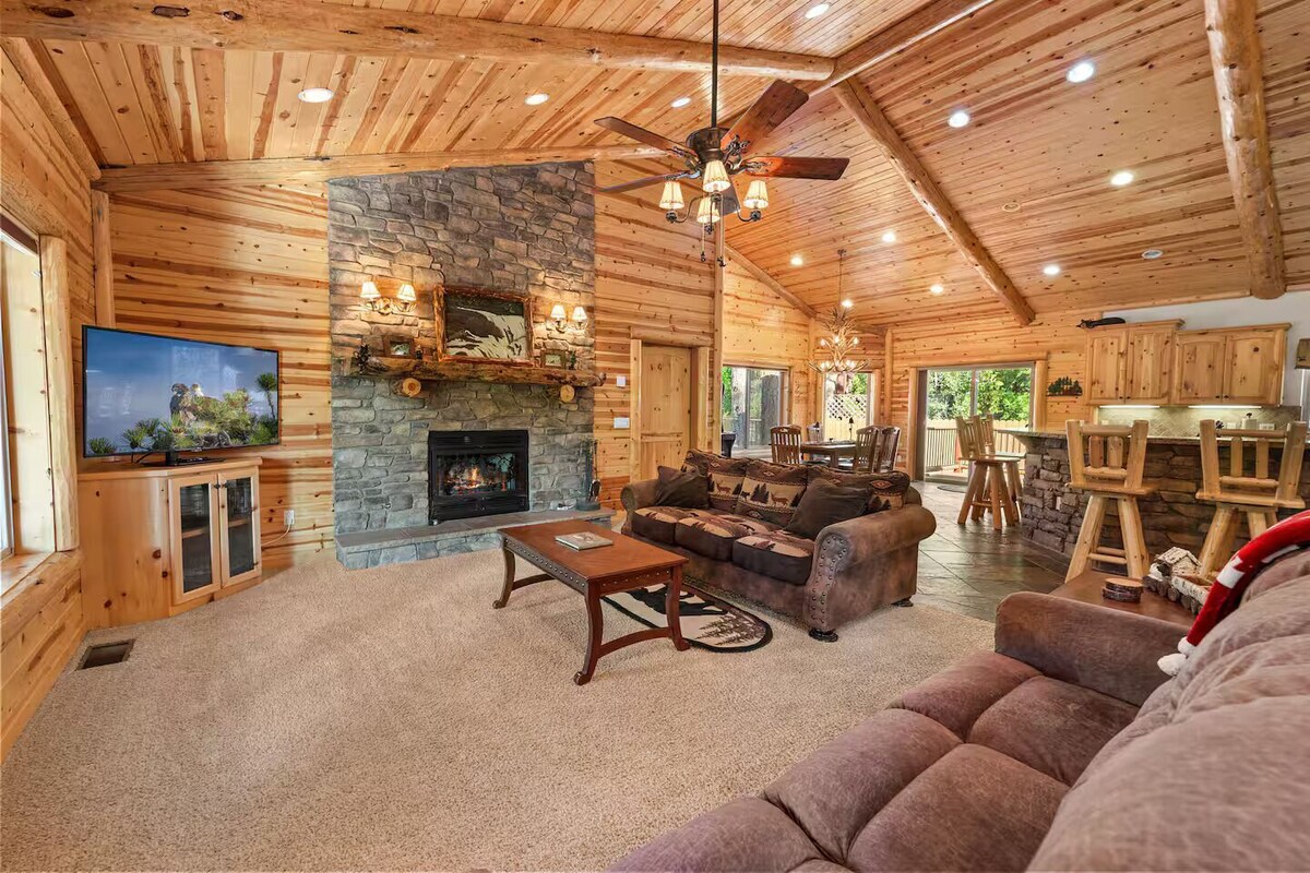 Spacious log-style home with soaring wood-beamed ceilings and modern comforts. Unwind in the private hot tub, or gather by the stone fireplace. The open living area flows into a chef’s kitchen, perfect for cooking and dining together. Located in a peaceful upscale neighborhood close to the Village, lake, and ski slopes, it’s an inviting retreat for every season. The space This spacious upscale home features soaring wood-beamed ceilings and an open-concept living and dining area centered around a chef’s kitchen with a large island and wine cooler. Three inviting bedrooms include a master suite with a private bath and fireplace, along with two full bathrooms and a half bath for convenience. Step outside to a fenced backyard with a private hot tub, swing, and BBQ grill. Inside, enjoy smart TVs, a variety of games, books, and plenty of cozy spaces to relax and connect. Guest access Guests have full access to the entire home, including all bedrooms, bathrooms, living spaces, kitchen, laundry area, fenced backyard, private hot tub, and BBQ grill. The garage is available for parking and storage as noted. Certain locked closets and cabinets contain owner or cleaning supplies and are not accessible. Other things to note The home is in a peaceful, upscale neighborhood close to shopping, dining, and outdoor activities. Guests must climb a short set of stairs to enter. Parking is available for two vehicles, plus garage access. Please respect quiet hours from 10 PM to 7 AM. Our prices include all fees. No hidden fees.