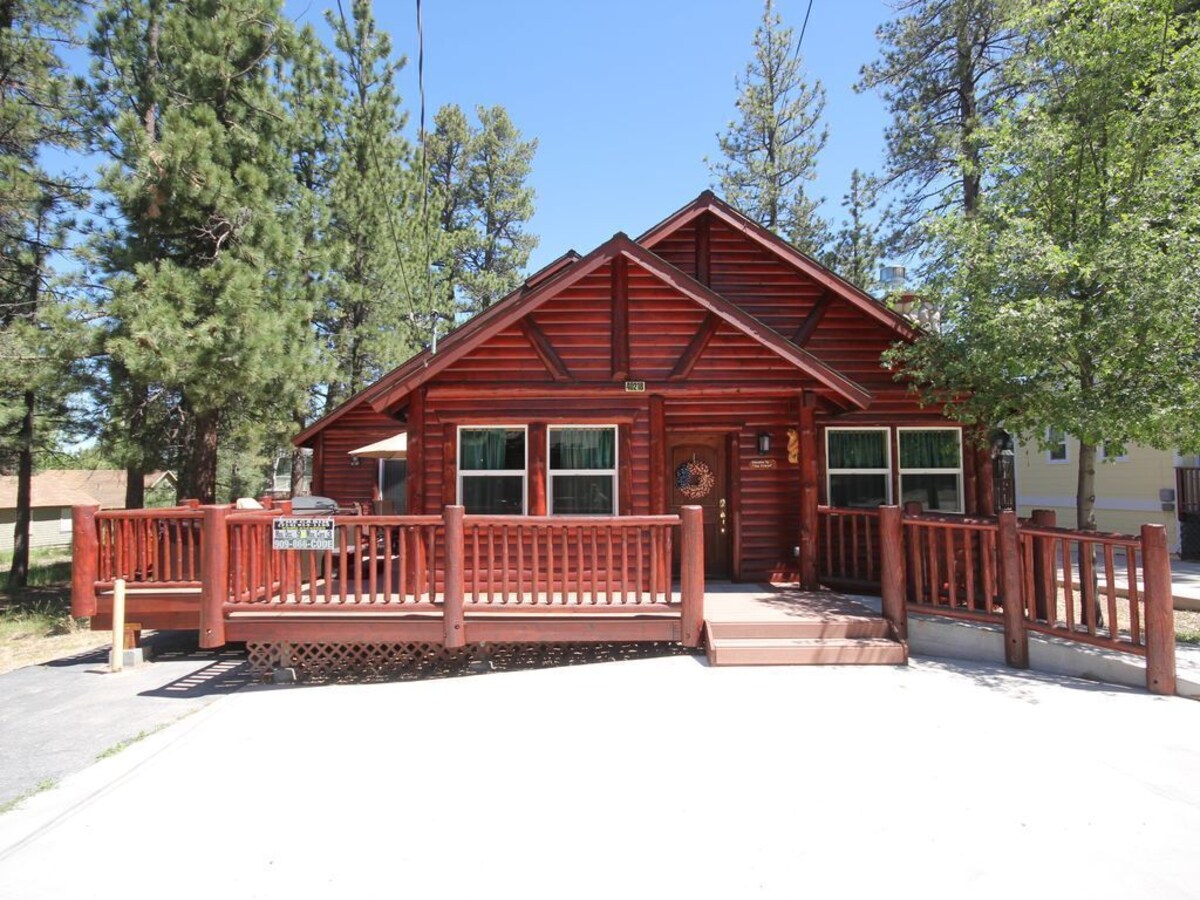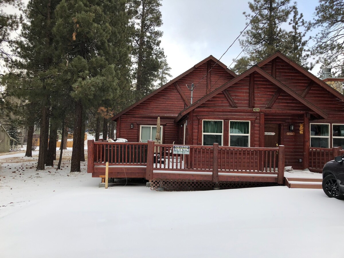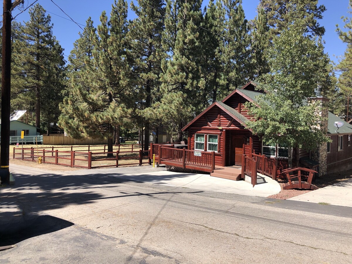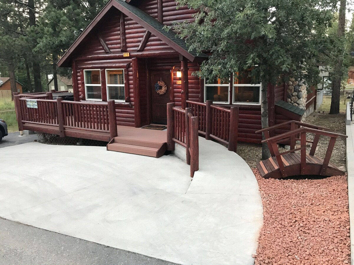 Newer Cabin, Disabled Accessible, RV parking and Close to Everything This is a newer log-style cabin, with a bright and open layout, it's big enough for the whole family. While being cozy in the winter time and airy in the summer time, this cabin is beautiful all year round. It includes three bedrooms, three bathrooms, and even has a gaming area the whole family can enjoy. This cabin features a hot tub, rock fireplace, open great room, pool table, telephone, internet, patio furniture, a large wraparound deck, a fenced in dog run and is even handicap accessible. There are TV's in the living room as well as one in each bedroom. The kitchen is fully stocked with everything needed to prepare a wonderful home cooked meal. With being less than a mile to the Village, a short hop to the lake, Alpine slide/tube run, and both ski resorts, there is something to do for everyone of all ages. This spacious cabin sleeps eight comfortably with enough room for everyone. The master suite features a California king bed with a full bathroom as well as glass sliding doors that lead out onto the deck. The second bedroom has a queen bed as well as a bunk beds with a full bathroom. The third bedroom includes a queen bed and a full wheelchair accessible bathroom. The living room also has a sofa bed. Plus a full size washer and dryer. The cabin has an attached owner private dog park. Outside security video cameras monitors the cabin when vacant. Free EV charging station on site for electric vehicles. Our prices include all fees. No hidden fees.