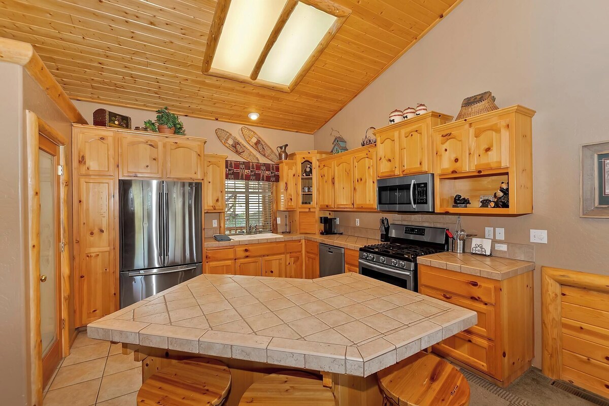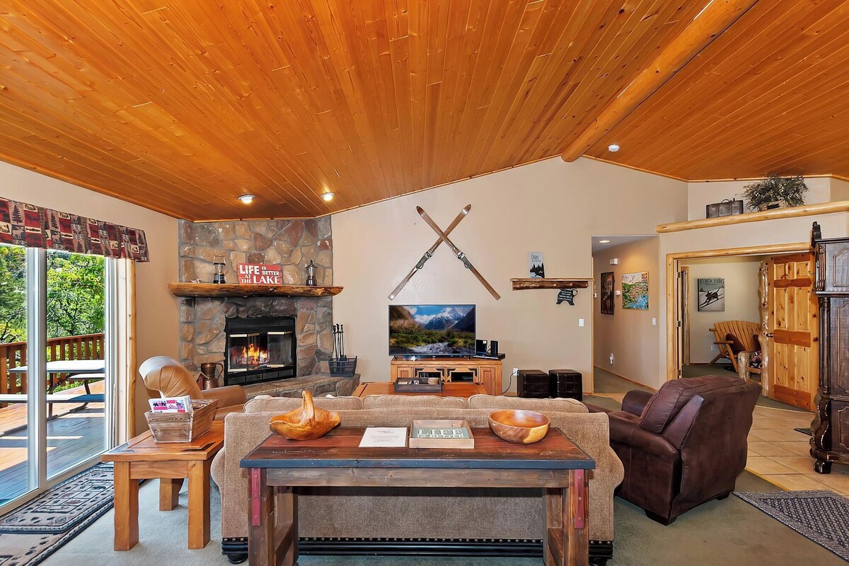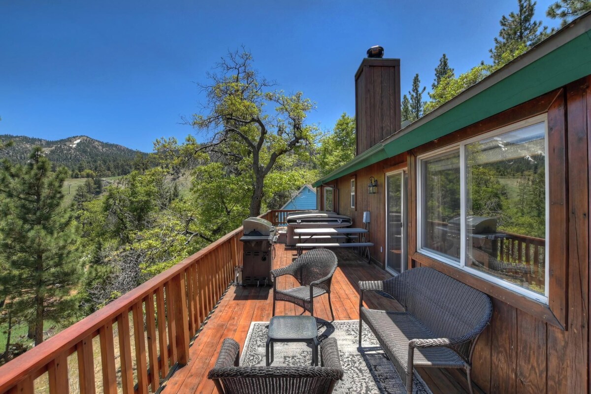 Welcome to Black Diamond Lodge, a charming single-level cabin designed for both winter adventures and summer relaxation. Located just a 5-minute walk from the Skyline and 2N10 trailheads for hiking and mountain biking, and at the base of Bear Mountain Ski Resort, this lodge offers breathtaking views and easy access to all Big Bear has to offer. ★★ HIGHLIGHTS ★★ ✓ Prime Location: 5-minute walk to hiking and biking trails, base of Bear Mountain Ski Resort. ✓ Capacity: 3 bedrooms, 2 bathrooms. ✓ Relaxation: Hot tub, Foosball table, pet-friendly, charcoal & propane barbecues. ✓ Living Area: Cozy wood-burning fireplace, flat-screen TVs, DVD player. ★★ Living Area ★★ ✓ Open Living Room: Comfortable sofa, wood-burning fireplace, and cable TV with DVD player. Enjoy a game of Foosball while relaxing with family and friends. ✓ Fully Stocked Kitchen: Modern amenities including a dishwasher, gas stove, large stainless steel refrigerator, and counter seating at the island. An expansive log dining table provides rustic charm with seating for 6. ✓ Outdoor Space: Large back deck offering panoramic views, propane and charcoal barbecues, and a hot tub overlooking the slopes. ★★ Bedrooms ★★ ✓ Master Bedroom: Spacious king bed, TV with DVD player and cable, attached bathroom with double sinks and a large tub. ✓ Bedroom 2: Cozy queen bed with a rustic feel. ✓ Bedroom 3: Solid log bunk bed with twin over full, TV with NFL package, and DVD player. ★★ Bathrooms ★★ ✓ Master Bath: Attached to the master bedroom, featuring double sinks and a large tub. ✓ Full Bath: Conveniently located in the hall. ✓ Laundry: Washer and dryer for your convenience. ★★ Additional Features ★★ ✓ Entertainment: Foosball table, flat-screen TVs, DVD player (No cable in bunk bed room). ✓ Comfort: Wood-burning fireplace, central heating. ✓ Kitchen Essentials: Fully stocked kitchen with a dishwasher and coffee pot. ✓ Pet-Friendly: Welcoming to furry friends. ✓ Convenience: Linens and towels provided, front-loading washer and dryer. ★★ Black Diamond Lodge offers a blend of modern comforts and rustic charm, with high-quality interior design, newer furniture, and updated fixtures. Enjoy your stay in this beautifully appointed cabin and make unforgettable memories in Big Bear! ★★ 2025-1467 Important: Dear Traveler, you will be charged with USD 200 in case you include a Pet in your reservation as a Refundable Damage Deposit for Pets. Our prices include all fees. No hidden fees.