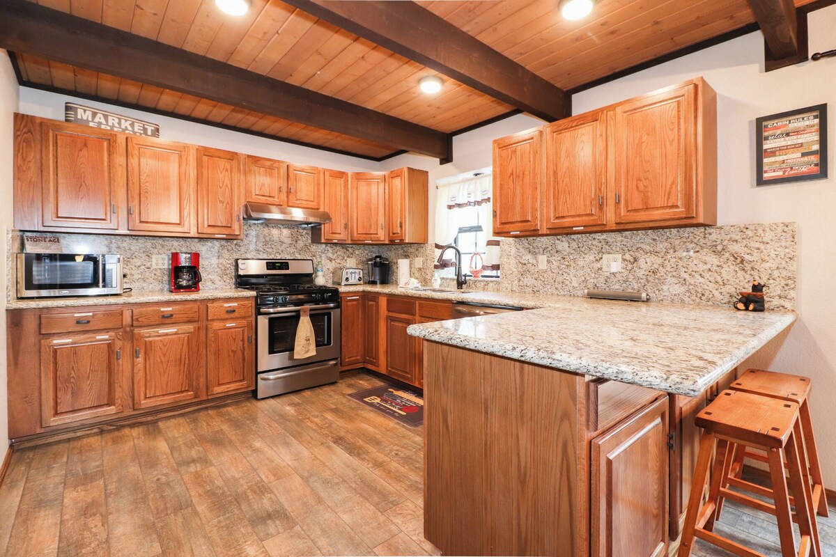 ✓ Cozy Living Space: The main level features knotty pine ceilings, wood floors, and a wood-burning fireplace. The living room has a large flat-screen Smart TV with cable and a DVD player, plus complimentary Wi-Fi for staying connected.