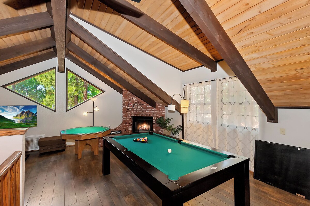 ✓ Upstairs Loft: The loft area features a cozy space with a wood-burning fireplace, a pool table, a card table, and a flat-screen TV with cable—ideal for relaxing or watching your favorite team.