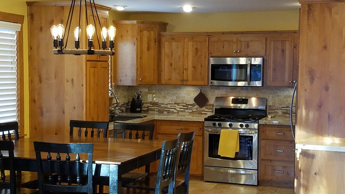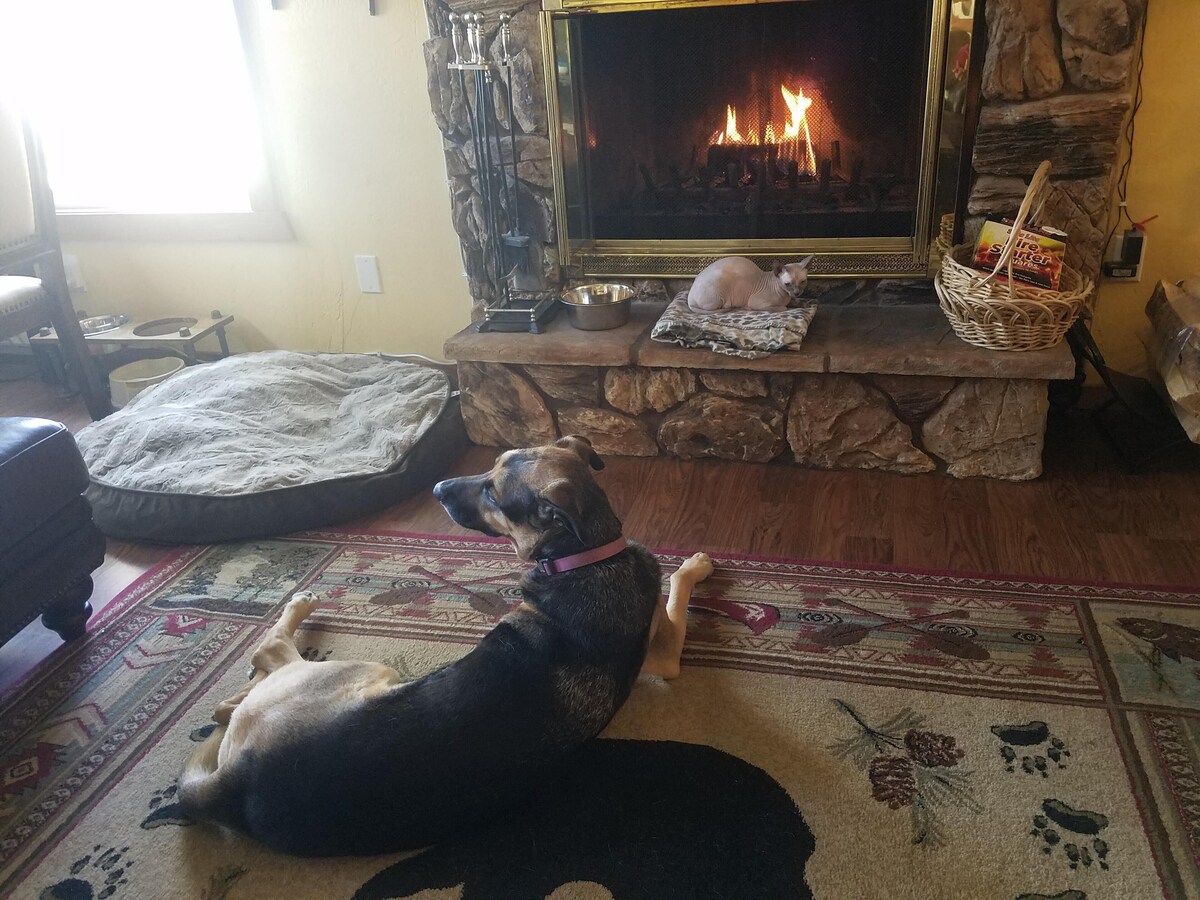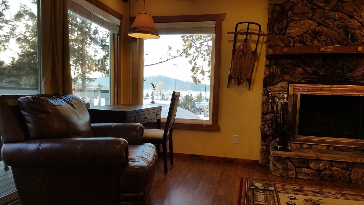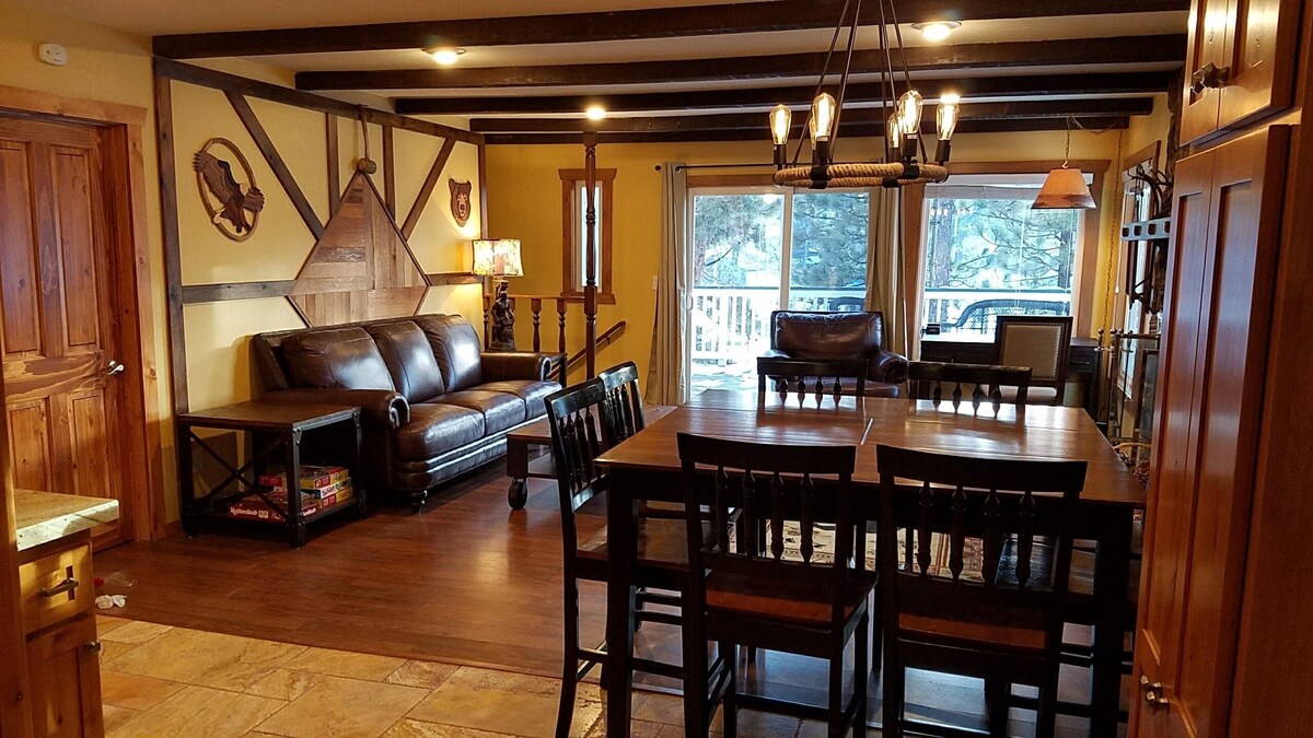 Welcome to Eagle's Haven! We have done our best to set our cabin up for enjoyment by families, close friends, and their canine companions. For starters, our cabin has a great location... a lake view from the deck and west facing windows... our fenced-in backyard borders Meadow Park... the lake and dog park are a casual 10 minute walk... Snow Summit, the Village, and Vons are a 5 minute drive... and Bear Mountain is only 10 minutes away. Outside, the hot tub is nicely situated among the trees in the backyard. It is offered to those interested for a nominal fee to help with the energy, cleaning, and maintenance needed. Also enjoy a Weber grill on the top deck and ping pong on the lower deck. Inside we've equipped the cabin with modern amenities... like a beautifully remodeled kitchen and both baths... luxurious leather furniture... and comfy beds... all while keeping elements of rustic charm that remind you you're in the lovely Big Bear mountains. The cabin includes three bedrooms with beds for 8. Two bedrooms have firm yet plush queen mattresses with lovely log construction bed frames. The third bedroom has a full / twin bunk... a twin size trundle bed underneath... plus an additional twin bed. Other amenities include: 48\ ,