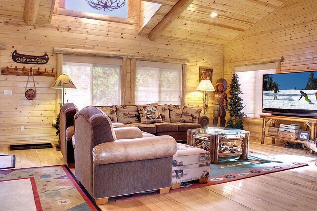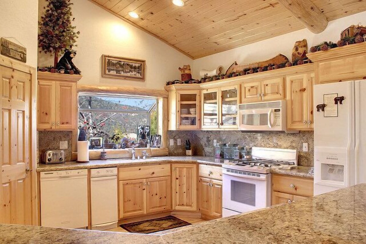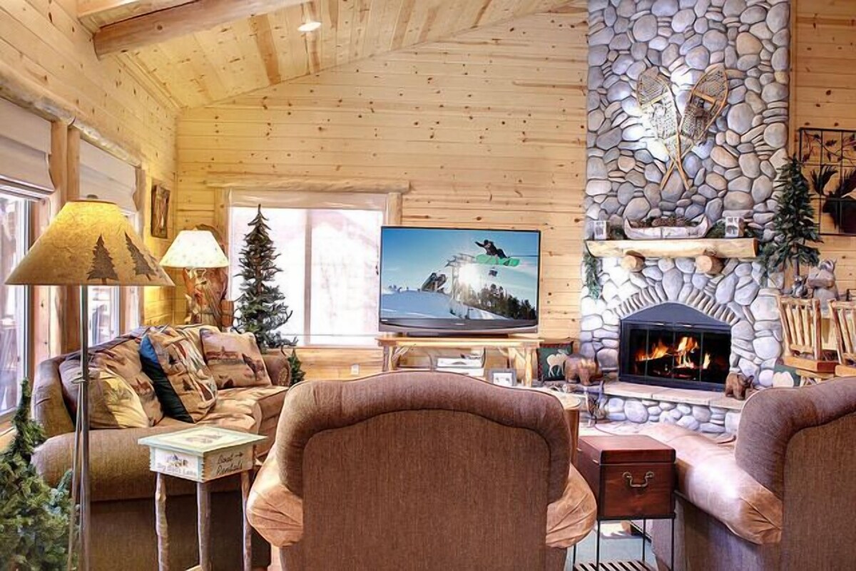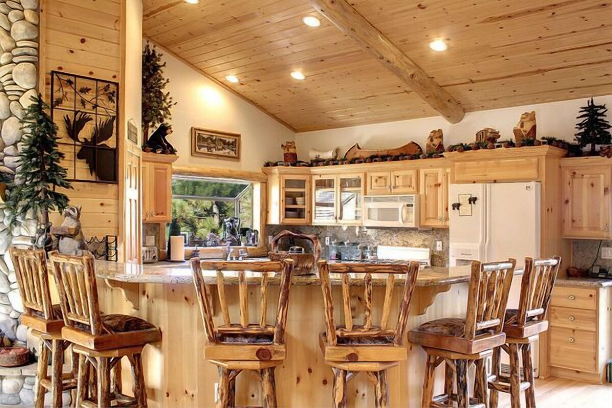 Our cabin is located in Castle Glen Estates -- Big Bear’s exclusive luxury community that sits on a hilltop overlooking Big Bear Lake and the ski resorts. Just a 5 minute drive down the hill leads you to everything -- the lake, ski slopes, restaurants and shopping. Our family friendly, beautifully furnished custom log cabin home (2,500 square foot) on a 13,000 sq. foot lot is on a hillside location with multiple decks for enjoying the fantastic mountain views. The backyard is completely fenced in and you can hike and explore right outside the back gate in the Eagle Preserve National Forest. During the winter there are many sledding areas. This four-bedroom, three bathroom log cabin home is complemented by T&G vaulted ceilings and wood finish throughout. Custom lighting treatments throughout include ceiling fans and extensive use of wood and log accents in the interior. All of the furniture is custom made with many of the pieces hand carved to add to the feel of a luxury cabin. On the main living area, an open Great Room floor plan with a casual flow from living to dining room to kitchen and outdoor decks is ideal for entertaining and family activities. Cozy up to a wonderful fireplace or be entertained with a 65 inch HD Smart TV. The dining area seats 6 and there is a u-shaped bar surrounding the kitchen that seats 6. A gourmet kitchen features custom knotty pine cabinetry with crown molding, granite counter tops and all Kitchen aid appliances. Everything you need to cook, bake and entertain is available for your use including all dishes and glassware, utensils, pots and pans, mixing bowls, baking items, serving platters and small kitchen appliances such as a blender, coffee maker and toaster.. The deck just outside the kitchen has a Viking gas grill along with an outdoor dining area with a forest and mountain view. In addition, the deck includes a 6-person Jacuzzi with 36 jets and easy to access in all seasons. Just off the great room is an office. It has a love seat that opens to a smaller than twin-sized bed (recommended for small child only) as well as a tall dresser to store belongings and a large desk. The built-in dresser is filled with games for kids as well as puzzles and The house has high-speed internet. There are two bedrooms on the main level including the master bedroom with a king size bed, fireplace, walk-in closet, dresser and opens to the main level deck with the Jacuzzi. The master bedroom has a private bath that includes a relaxing over sized tub and glass enclosed shower. The second bedroom has a queen size bed, dresser and large closet. Upstairs offers two additional bedrooms. The secondary master has a king size bed, dresser, large closet and opens to an expansive deck with mountain and forest views. The other bedroom is our bunk room that offers one set of twin bunk beds and 2 twin beds (formerly bunk beds), 2 large dressers as well as a flat screen TV with cable. Guests have full access to a full-size washer and dryer. Free wireless internet access provided. The home comes with fresh towels and beds are made up with fresh linens. There is parking for 3 cars (one in garage and 2 in driveway). Our cabin is just a few minutes from all the major attractions you came to Big Bear to enjoy. You can relax and browse through our book of ideas for many of the activities nearby including Ski Resorts, Sledding, Boating, Fishing and Kayaking on the lake, hiking right from our backyard, discovery center, biking, zoo, golf, shopping, restaurants as well as a performing arts center. During the winter we may have sleds you can borrow and plenty of room to play in the snow. MAXIMUM OCCUPANCY IS 10. The house is suitable for a maximum of 6 adults and 4 children or 8 adults and 2 children. NO SMOKING on or near property. A dog on property must be pre-approved by owner and a $50 pet fee applies. SUMMER GUESTS: Please note that we now have air conditioning at the house. It was installed in April 2025. In addition, every room has a ceiling fan. Our prices include all fees. No hidden fees.