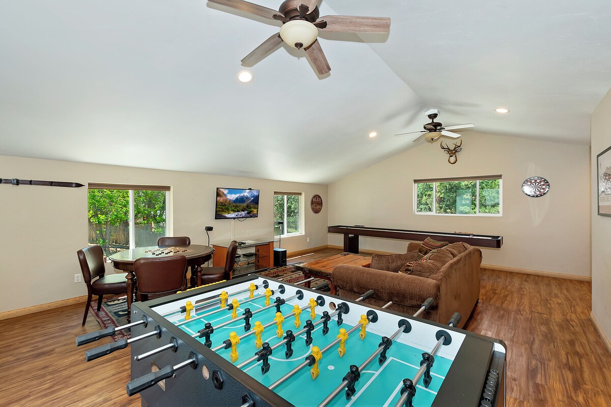 The 600 sq. ft. detached game room is a family favorite! Compete in foosball, 12-ft competition shuffleboard, checkers, magnetic darts, card table or chess. With six windows, two ceiling fans for summer, and a gas wall heater for winter, it’s a perfect year-round retreat.