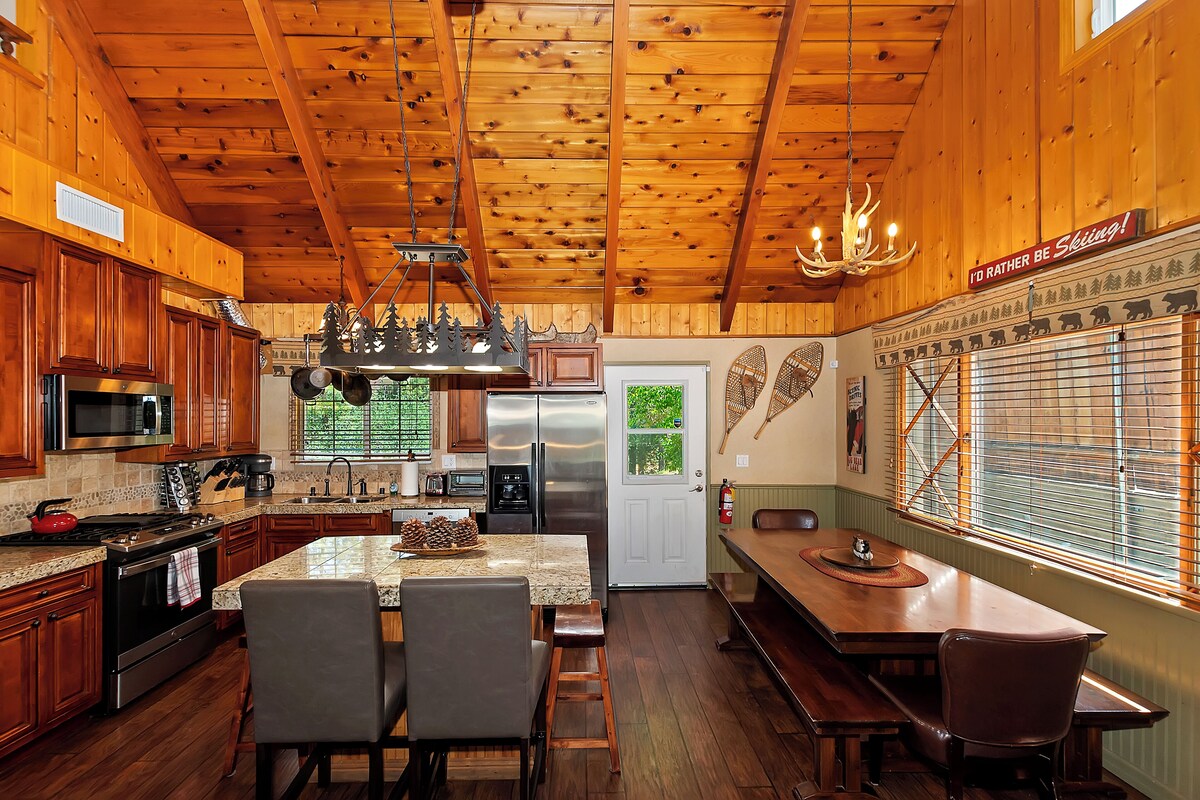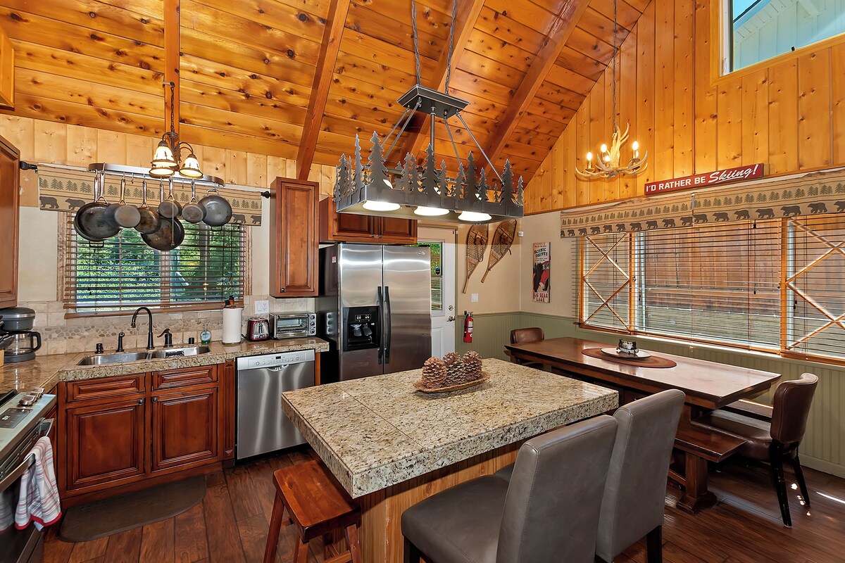 The fully stocked chef’s kitchen features stainless steel appliances, granite-tiled counters, a kitchen island, and all the high-end cookware needed to prepare a holiday feast—perfect for Thanksgiving or special occasions!